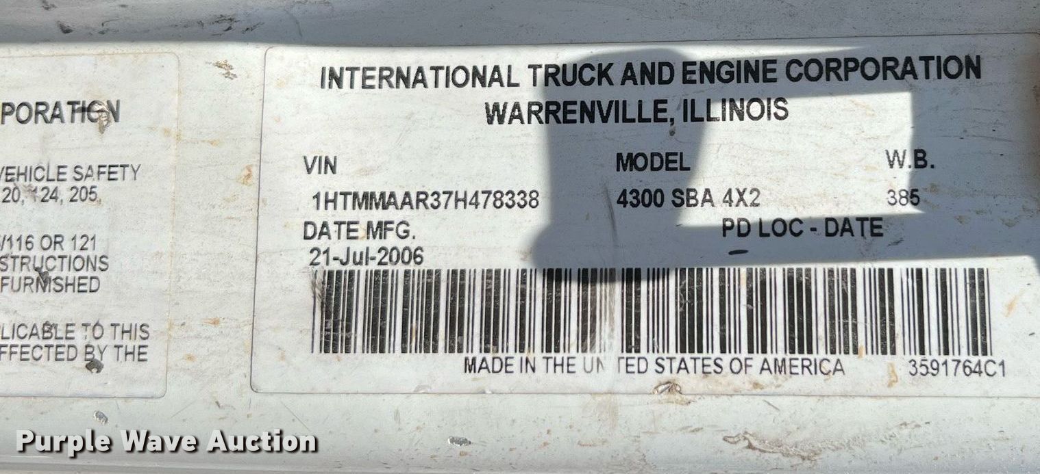 Purple Wave is selling a used Construction Dump Truck in Texas. This item is a 2007 International 4300 dump truck with the following: Miles: 164,137 on odometer, Hours: 13,810 on meter, VIN: 1HTMMAAR37H478338, Unit #: 56