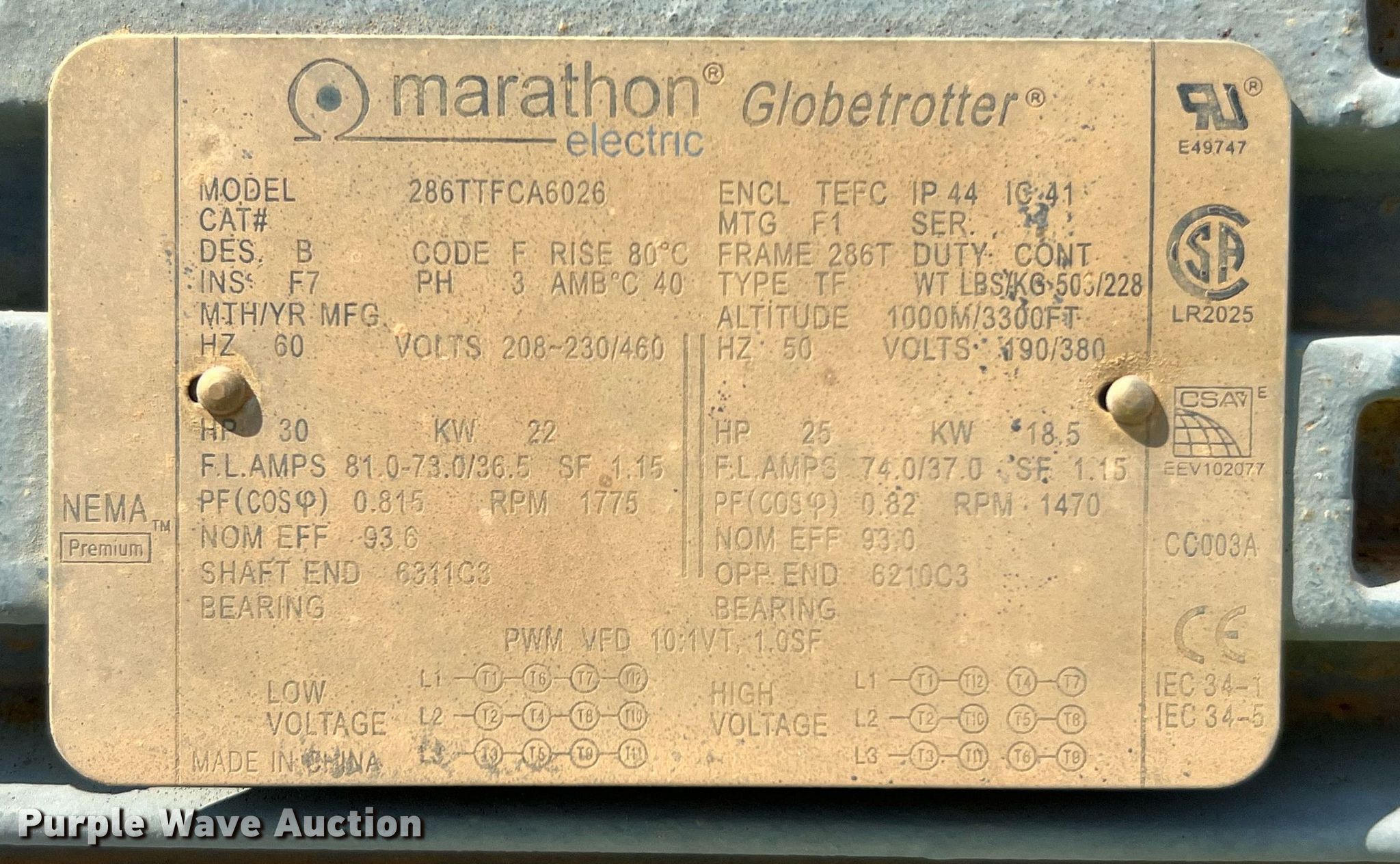 Kafka conveyor. Serial: EL36100W171463002. Electric Motor Marathon 286TTFCA6026, HP: 30, Volts: 208-230/460, Phase: Three. Features Conveyor Length: 100', Width: 3'. Tires Tire size: 275/80R22.5. Superior Silica Sands LLC. 24068 Pleasanton Road. San Antonio, TX 78264