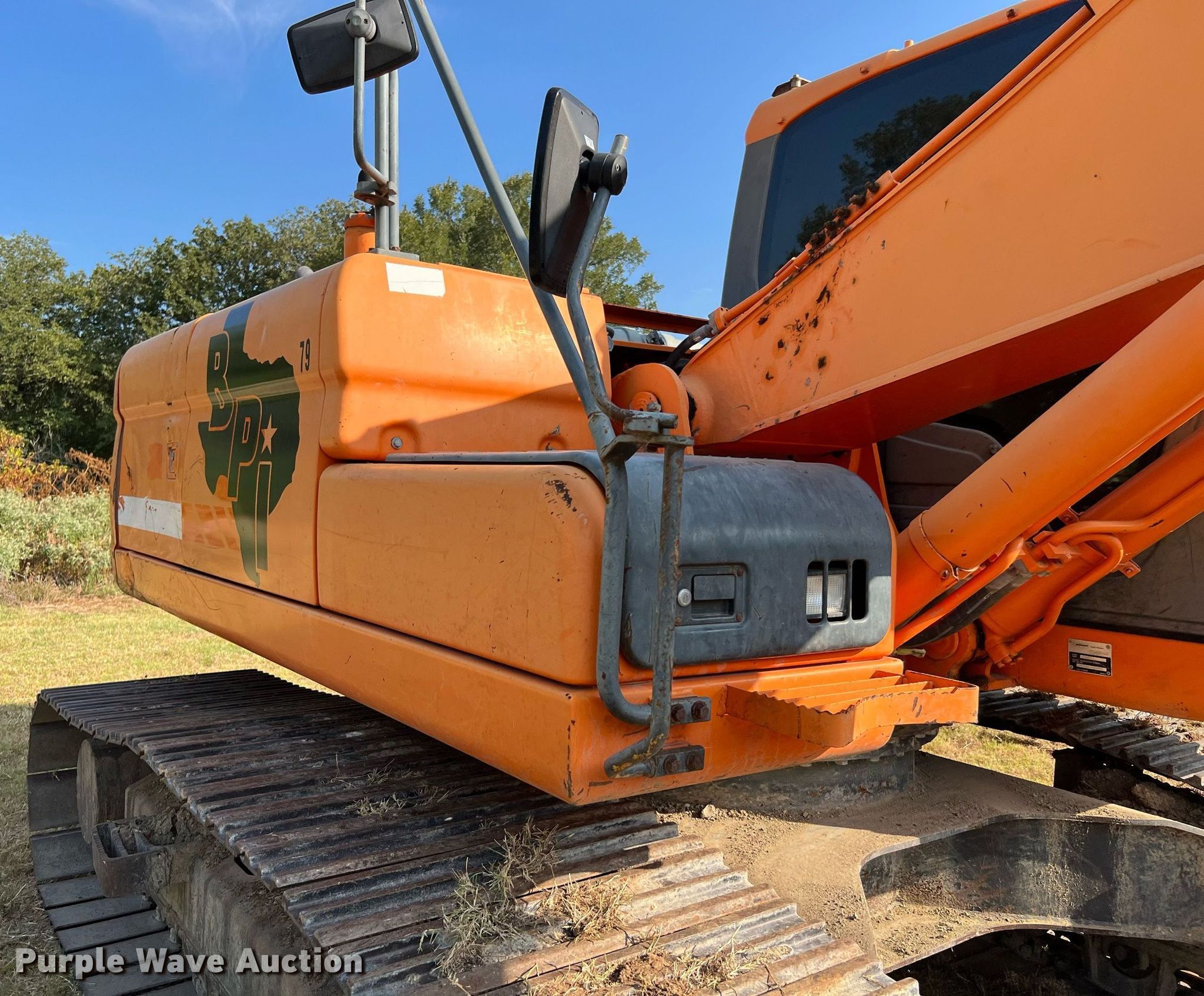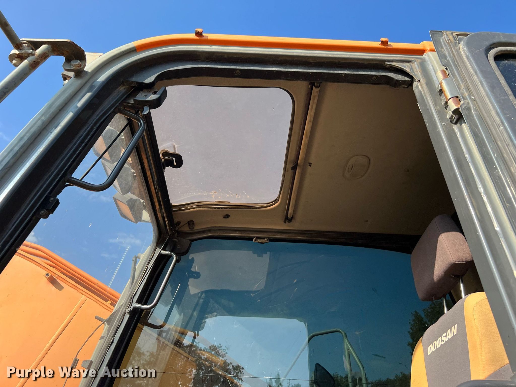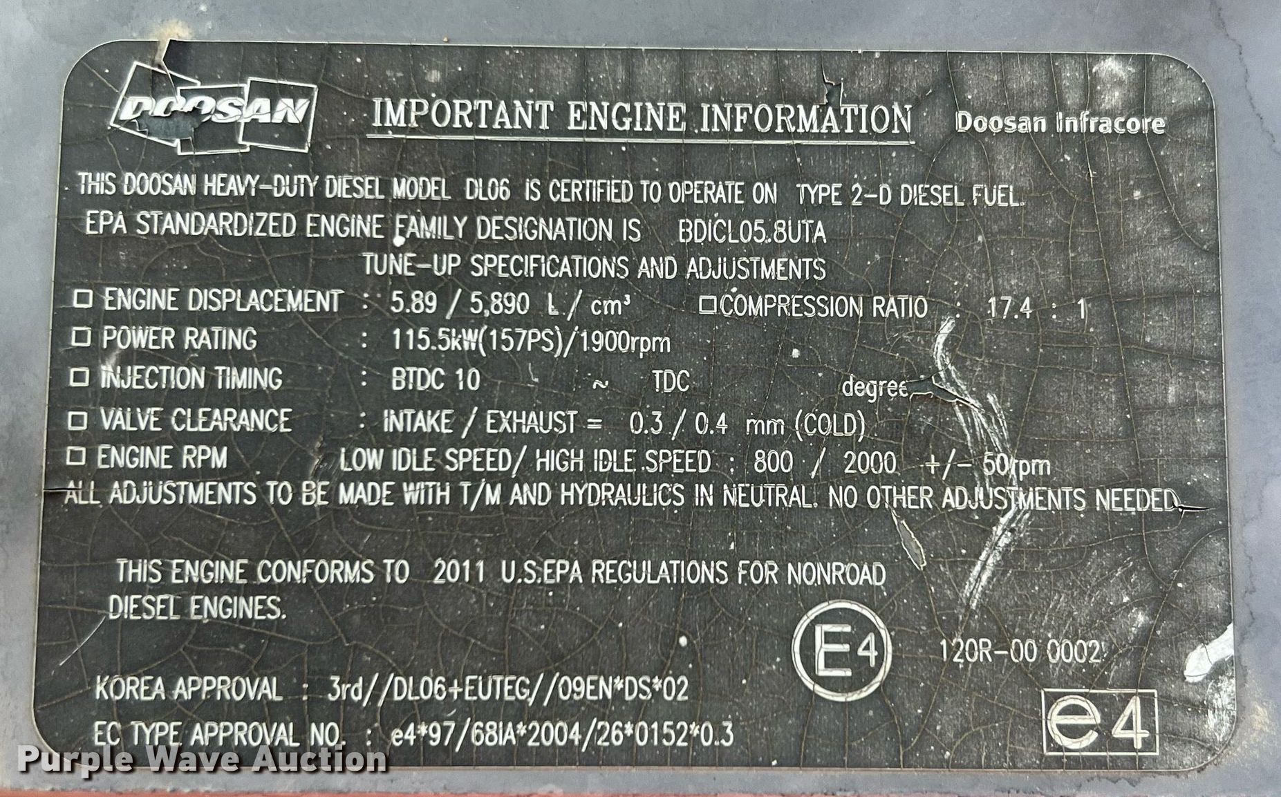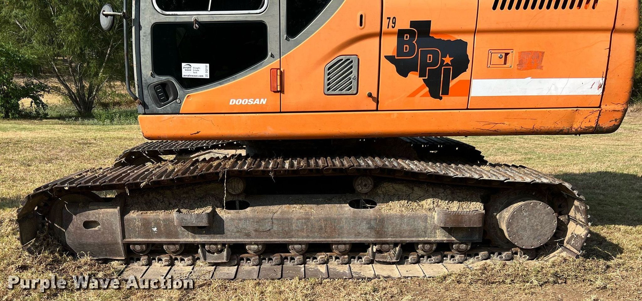 2011 Doosan DX225LC excavator. Hours: 5,832 on meter, Serial: DHKCEBADLB0006553. Engine Doosan DL06, Displacement: 5.89L, Cylinders: 6, Fuel type: Diesel, kW: 110. Transmission Hydrostatic, Two speed travel. Operators station Enclosed cab, AC, Heat, Pattern changer. Features Boom Standard, Stick Stick length: 9' 6", Thumb: Manual, Bucket Geith, Width: 42", Teeth: 5. Tracks Width: 32", Steel, Grouser pads: Triple. Notes Glass cracked. BPI. 1118 FM 153. Smithville, TX 78957