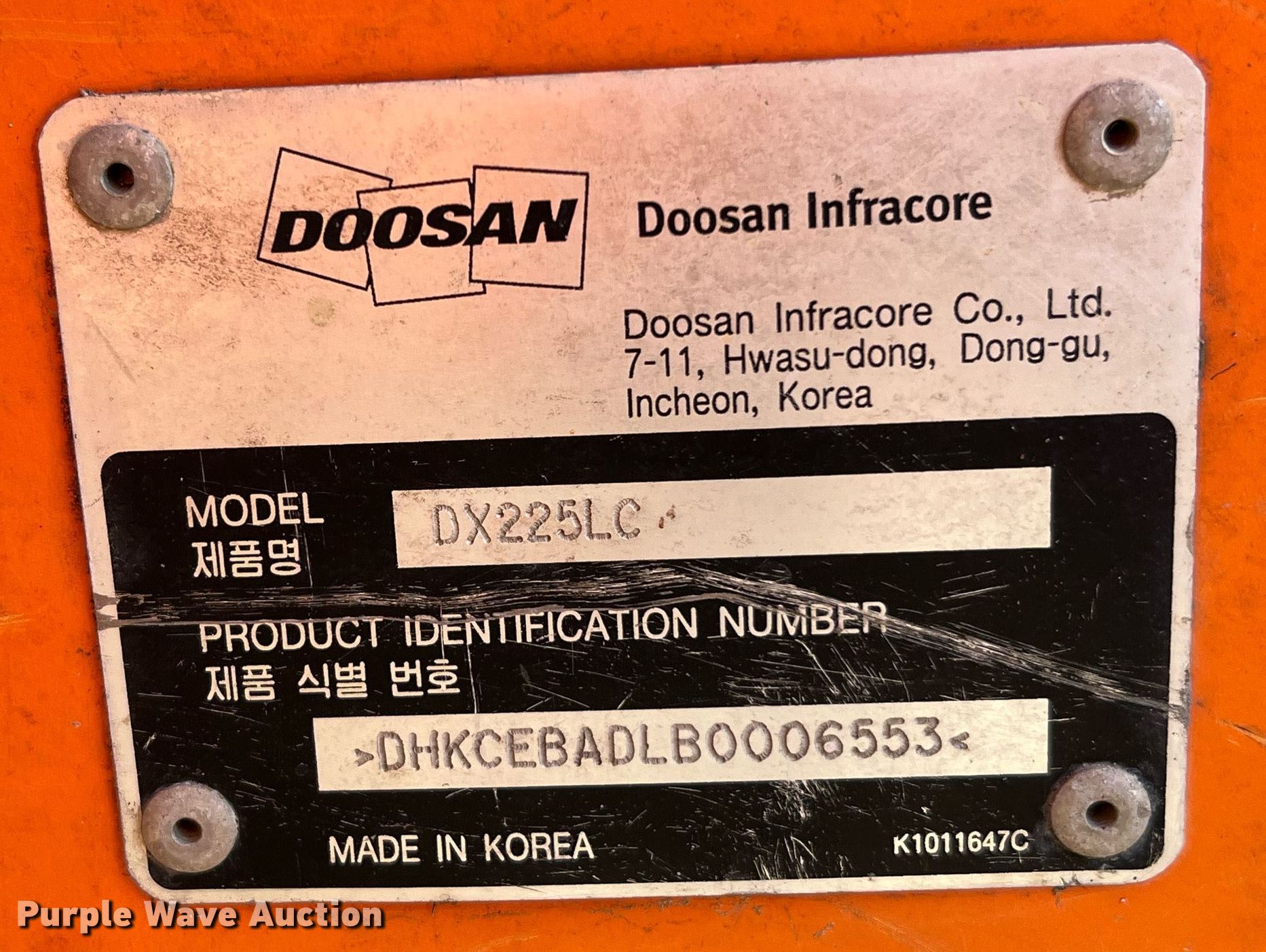 Purple Wave is selling a used Hydraulic Excavator in Texas. This item is a 2011 Doosan DX225LC excavator with the following: Hours: 5,832 on meter, Serial: DHKCEBADLB0006553