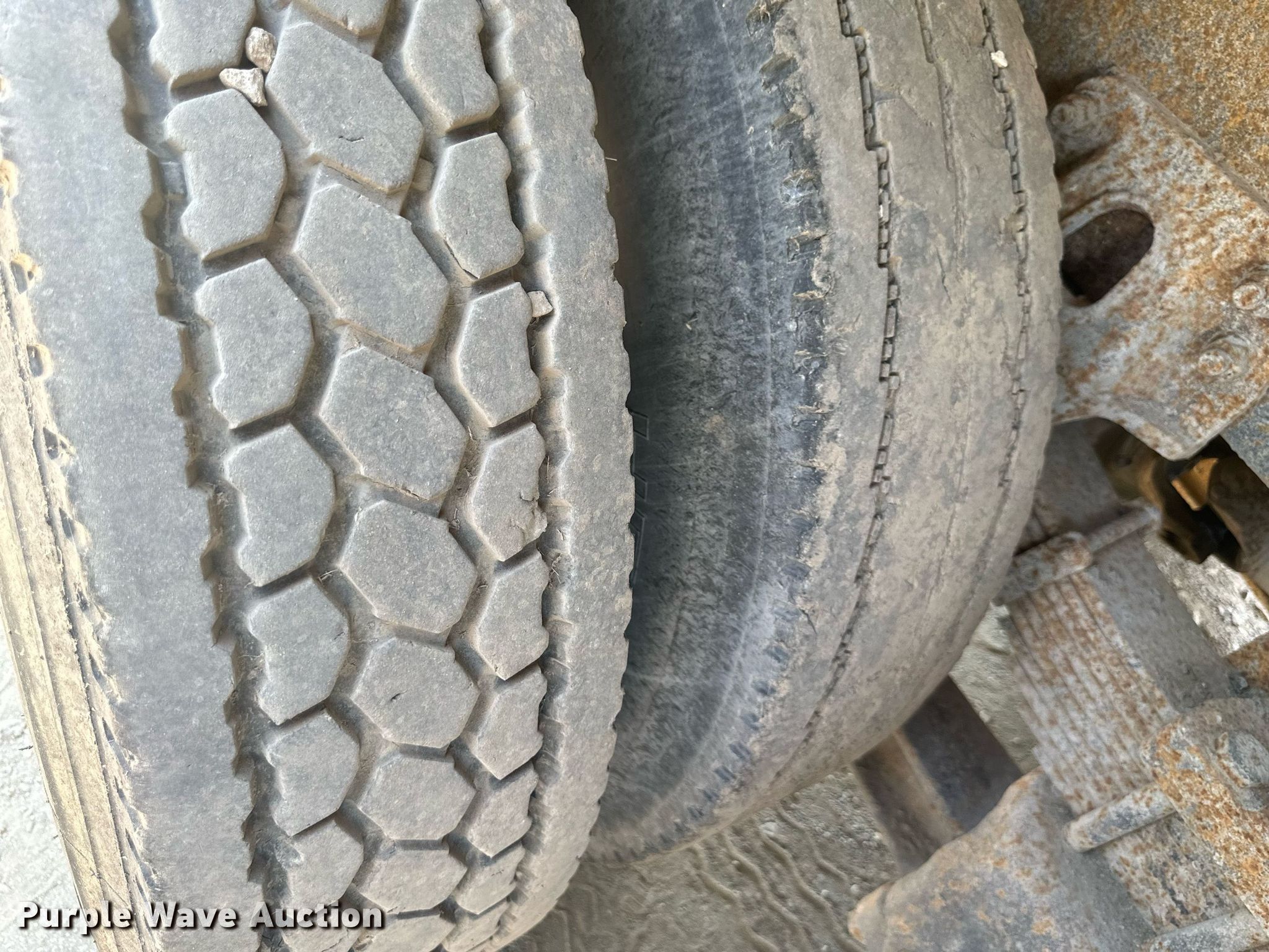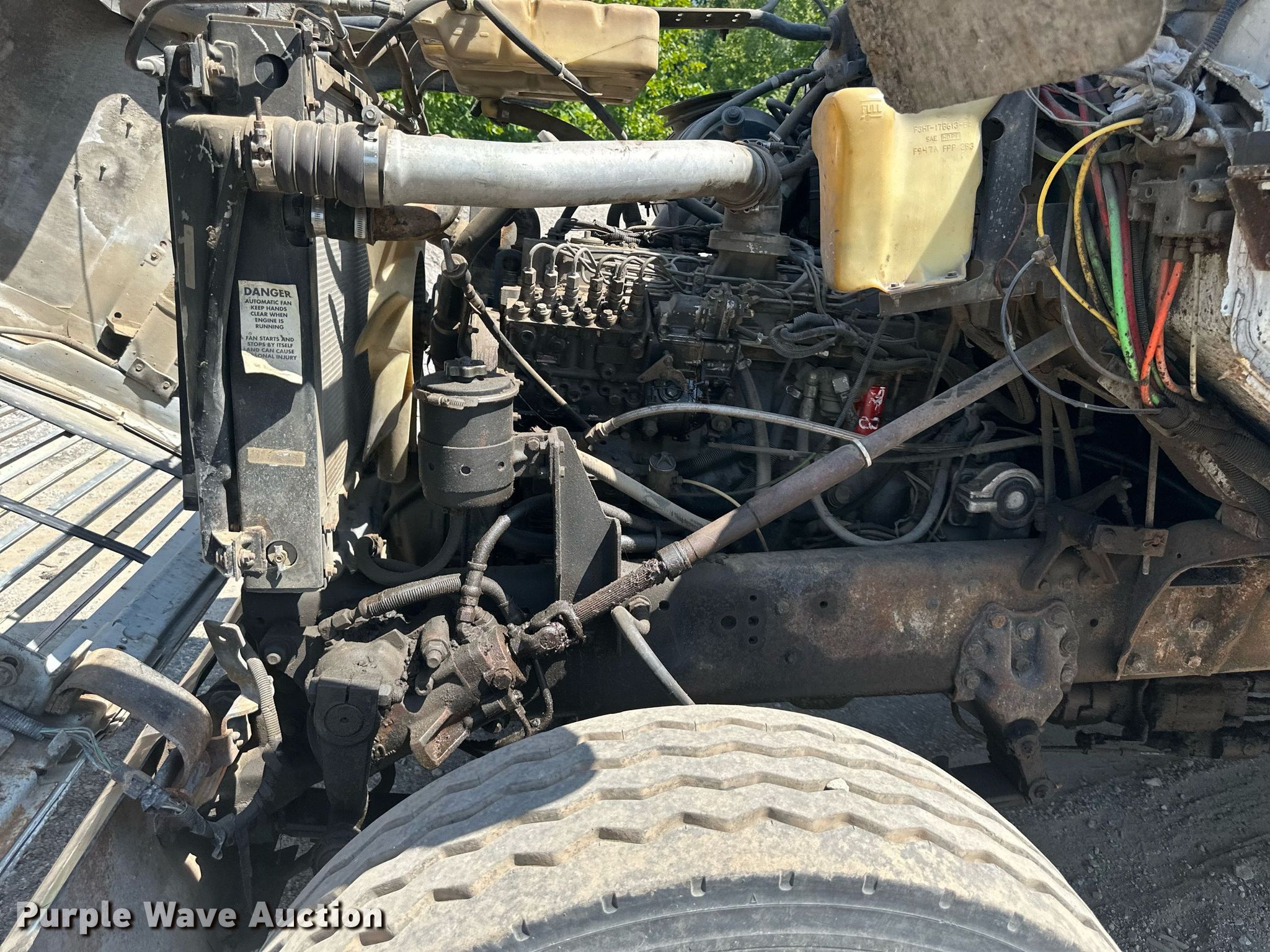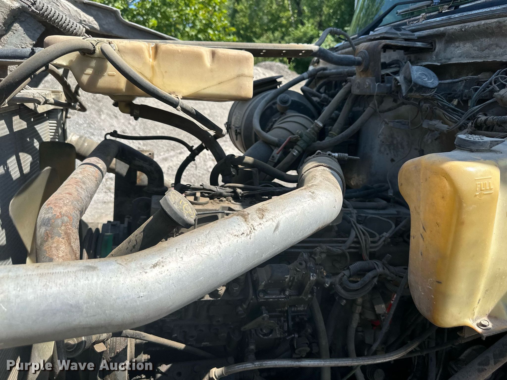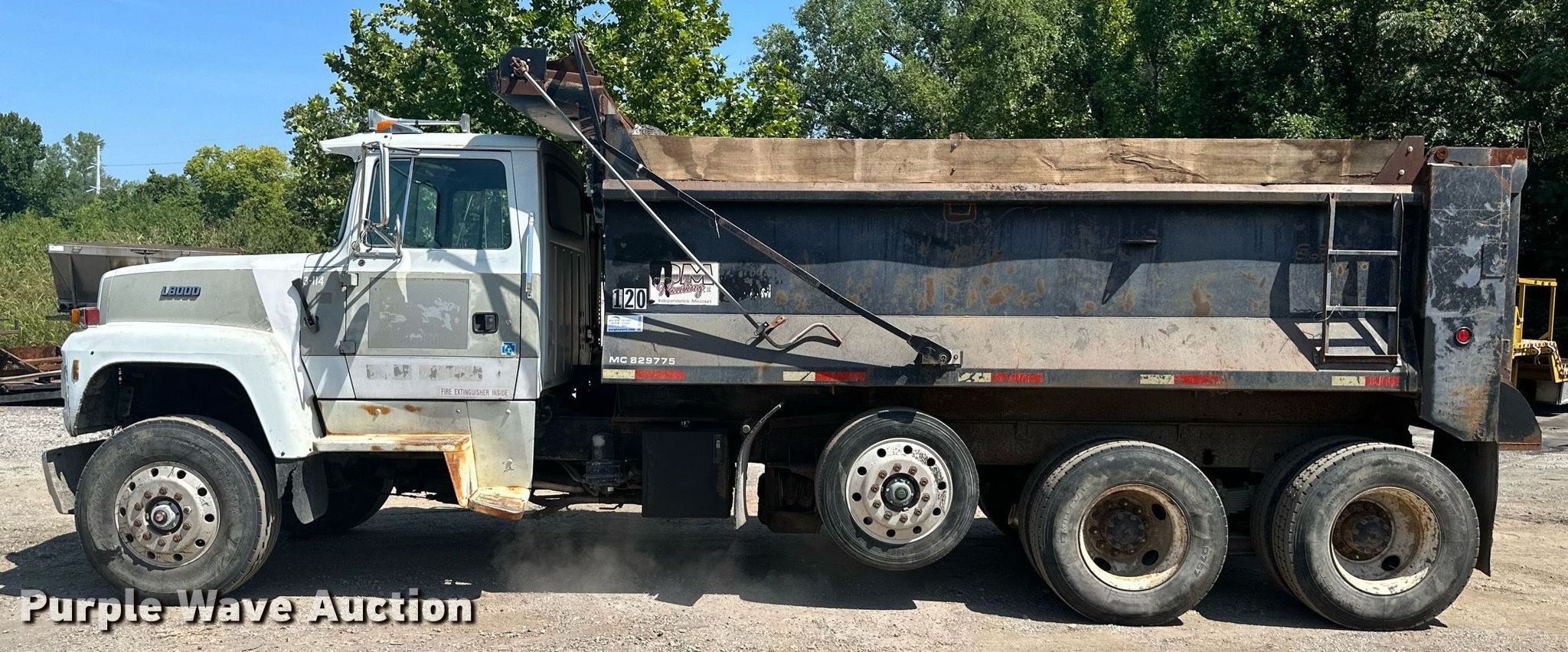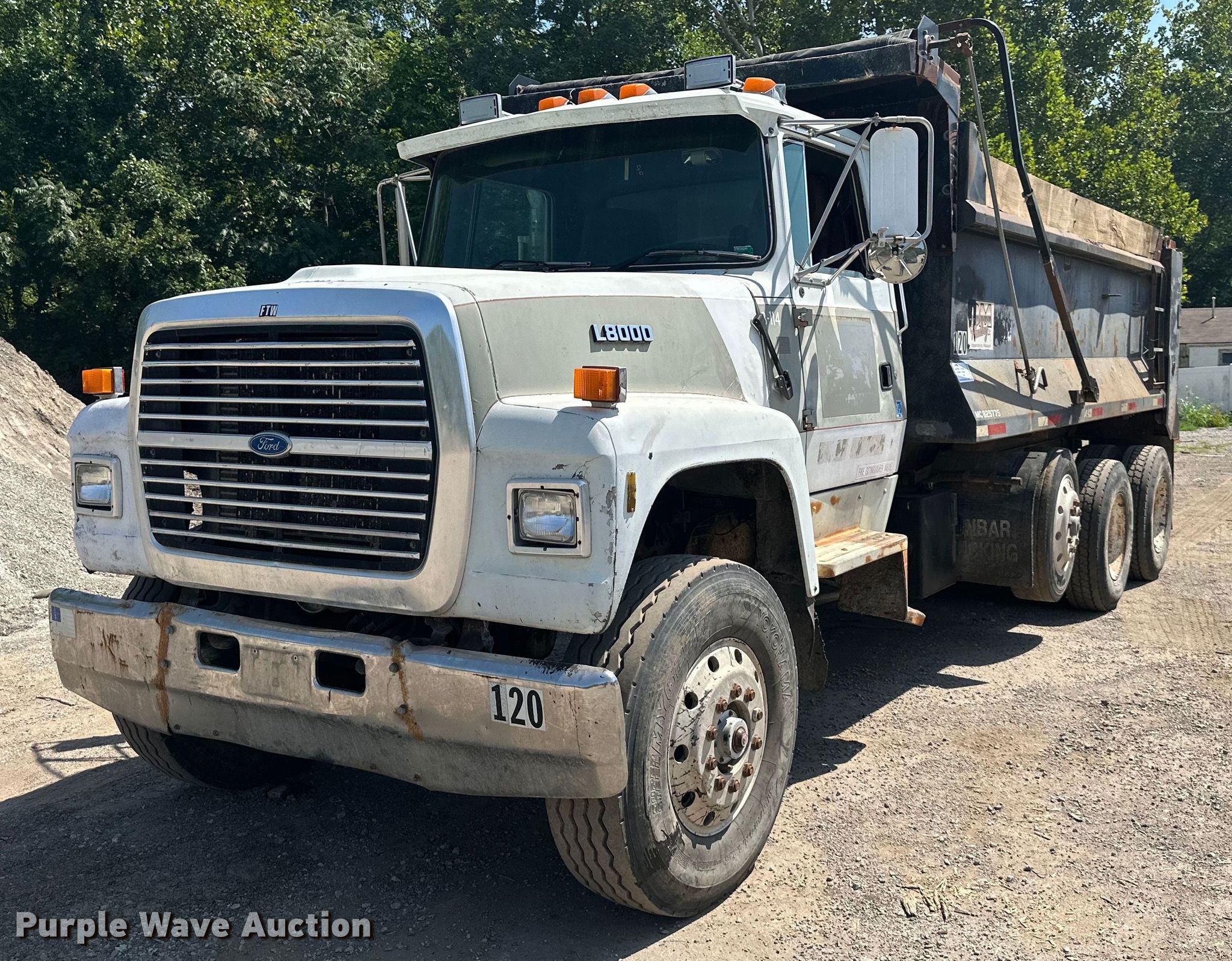 1995 Ford L8000 dump truck. Miles: 387,691 on odometer, Hours: 19,798 on meter, VIN: 1FDZU82E4SVA29442, Unit #: 120. Engine Cummins, Displacement: 8.3L, Cylinders: 6, Fuel type: Diesel. Transmission Manual, Speed: 10. Chassis Axles: Triple, Pusher axle Steerable, Differential lock: Inter-axle, Suspension: Spring over walking beam, Brakes: Air, PTO, GVWR: 56,500 lbs FAWR: 16,540 lbs, RAWR: 40,000 lbs. Interior Heat. Features Dump bed 16' L x 96" W, Side height: 42", Side board height: 10", Bed type: Steel, Roll tarp, Ram: Single , End gate: Air operated. Tires Front: 315/80R22.5, Rear: 11R22.5, Lift axle: 255/70R22.5. Missouri title. Title distribution may be delayed up to 14 days from verification of funds. 9215 East Wilson Road. Independence, MO 64053