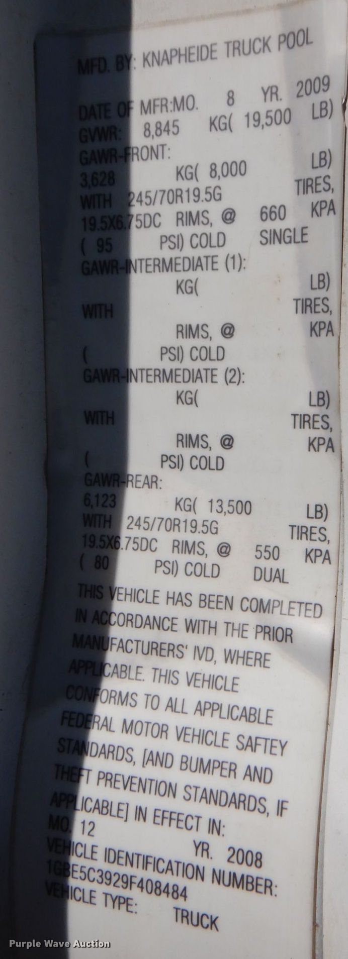2009 Chevrolet C5500 dump flatbed truck. Miles: 109,654 on odometer, VIN: 1GBE5C3929F408484. Engine Displacement: 6.6L, Cylinders: 8, Fuel type: Diesel. Transmission Automatic. Chassis Axles: Single, Differential lock: Inter-axle, Suspension: Spring, Brakes: Hydraulic, GVWR: 19,500 lbs FAWR: 8,000 lbs, RAWR: 13,500 lbs, Wheelbase: 151", Four wheel drive. Interior Heat, Cruise control. Features Dump bed 11' 2" L x 90" W, Ram: Single. * Bed Height: 53" Tires Size: 245/70R19.5. Notes Dash warning indicator: ABS, Brake. Nebraska title. Seller is a Nebraska licensed motor vehicle dealer. The buyer may be required to pay sales tax and/or registration fees to the dealer prior to taking possession. Title will be assigned and distributed by the dealer. Please contact the seller for distribution questions. Jordan Machinery / S & N Auto Sales. 25050 US Hwy 275. Waterloo, NE 68069