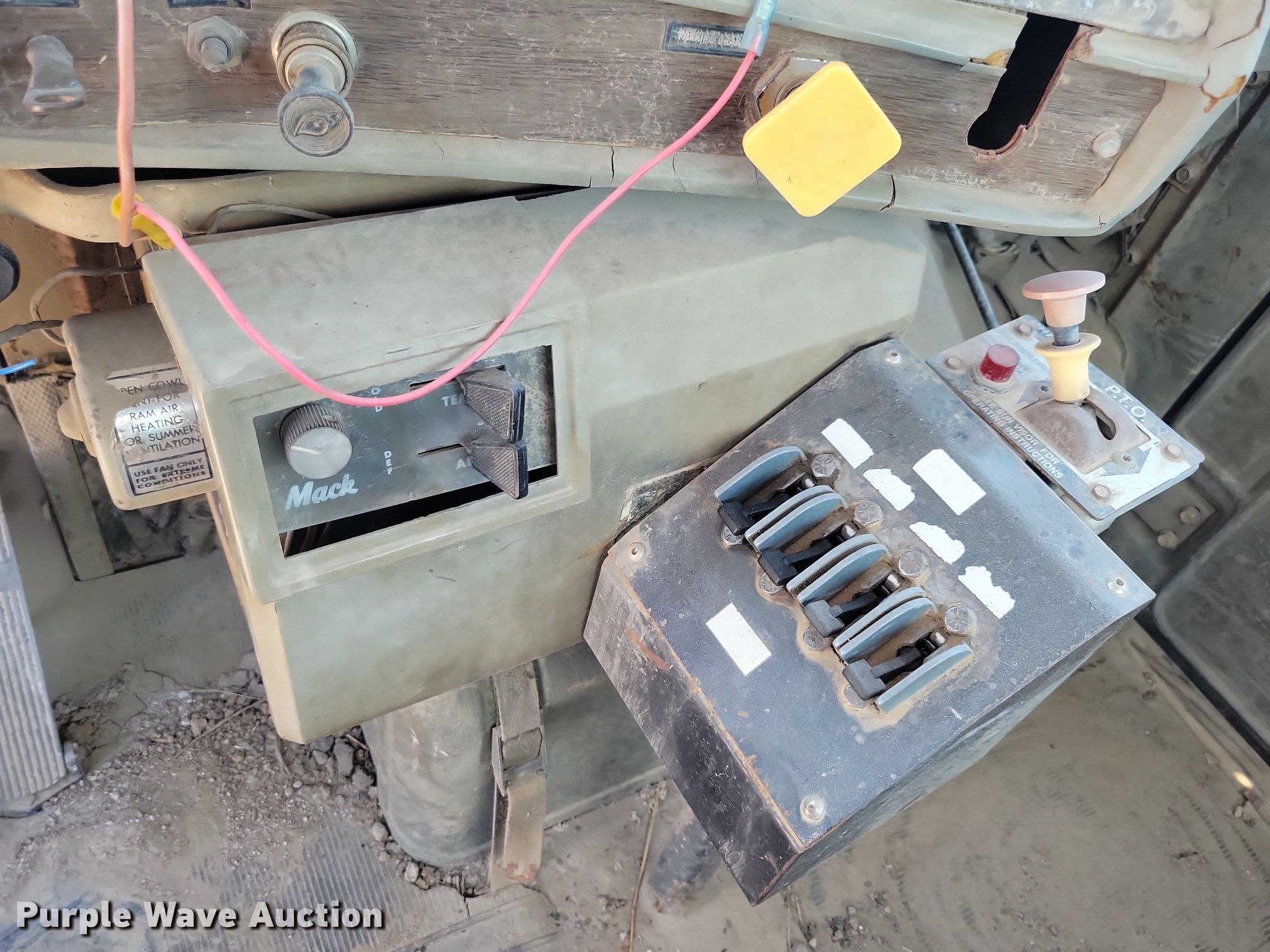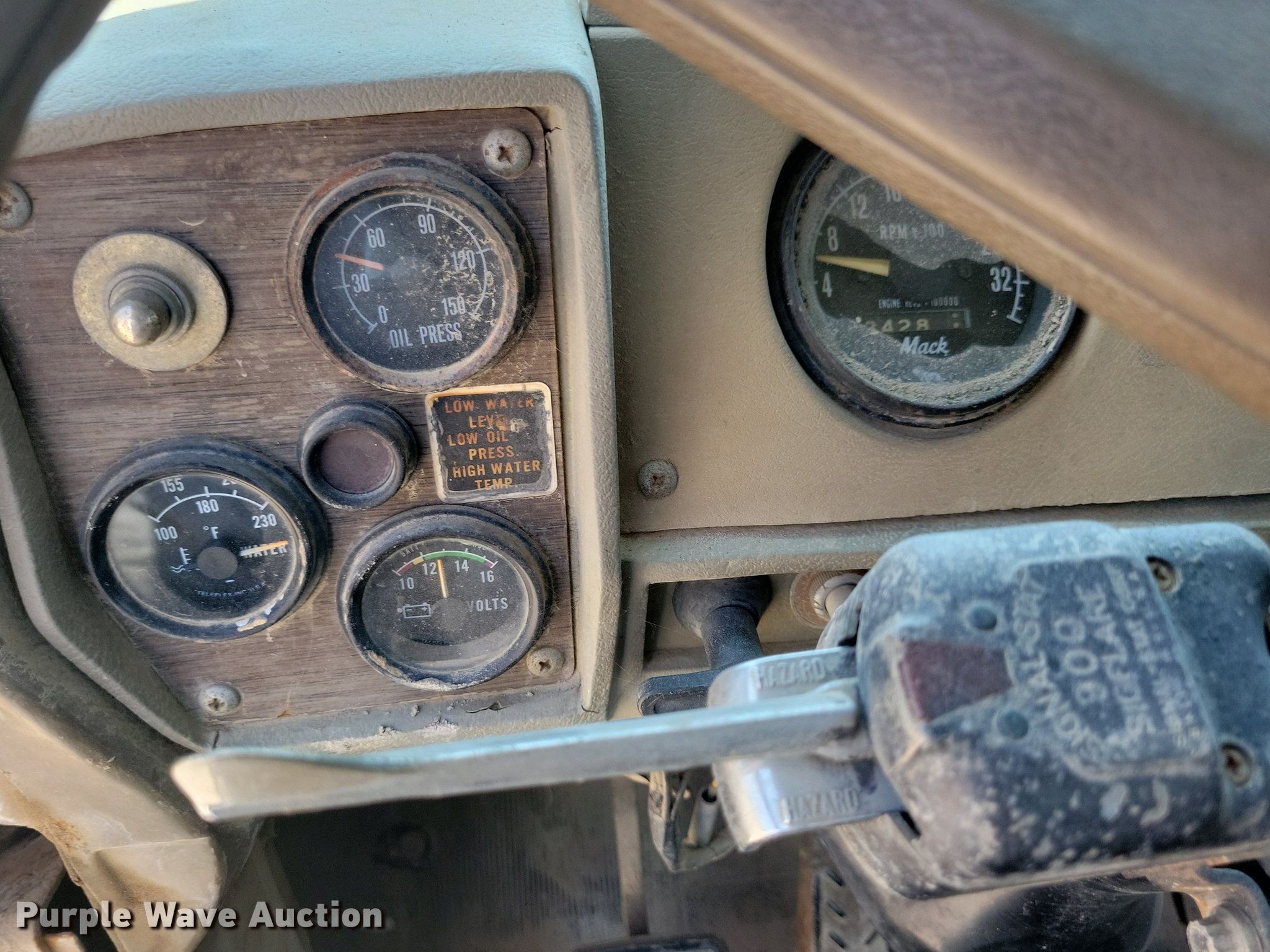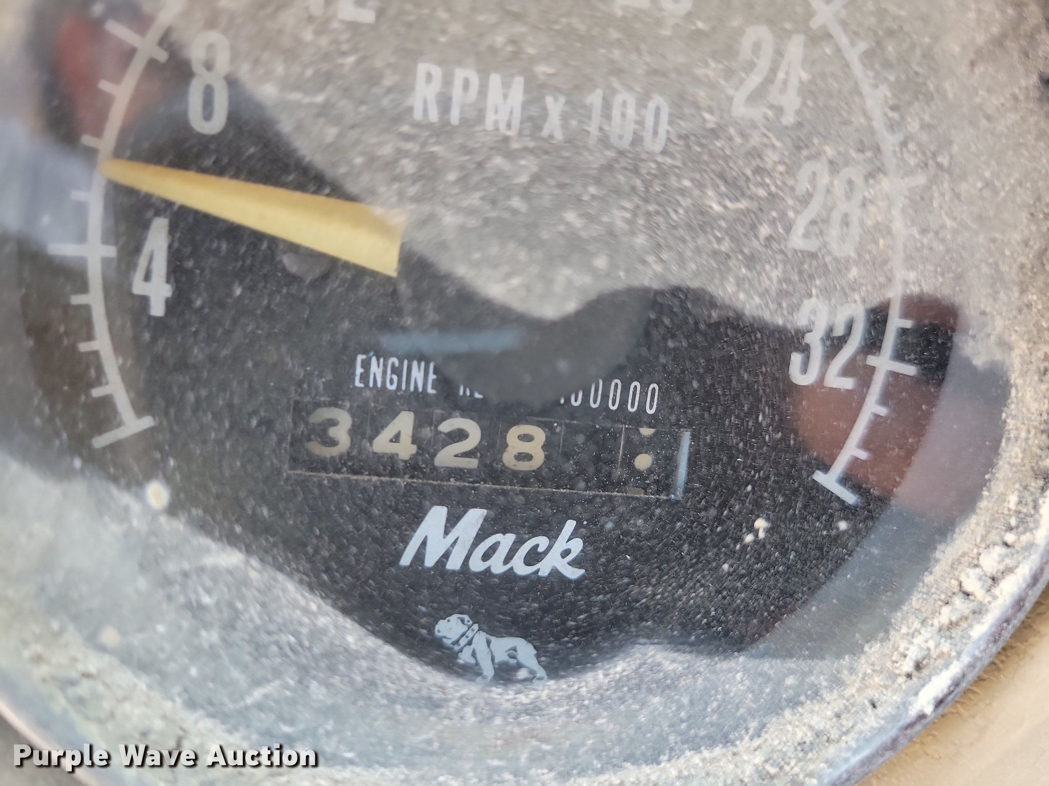 1974 Mack water truck. Miles: 212,980 on odometer, Hours: 3,428 on meter, VIN: DMM6856S2094. Engine Mack, Cylinders: 6, Fuel type: Diesel. Transmission Maxitorque, Manual, Speed: 5. Chassis Four wheel drive, Axles: Tandem, Differential lock: Inter-axle, Suspension: Spring over walking beam, Brakes: Air, PTO, Wet kit. Features Bed / tank Capacity: 5,000 gallons, 21' L x 96" W, Spray bar: Rear, Side discharge, Top fill. Tires Front: 425/65R22.5, Rear: 11R22.5. Notes Cracked elbow on pump. Iowa title. Title distribution may be delayed up to 14 days from verification of funds. Corell Contractor Inc. 1300 Lincoln Street. West Des Moines, IA 50265