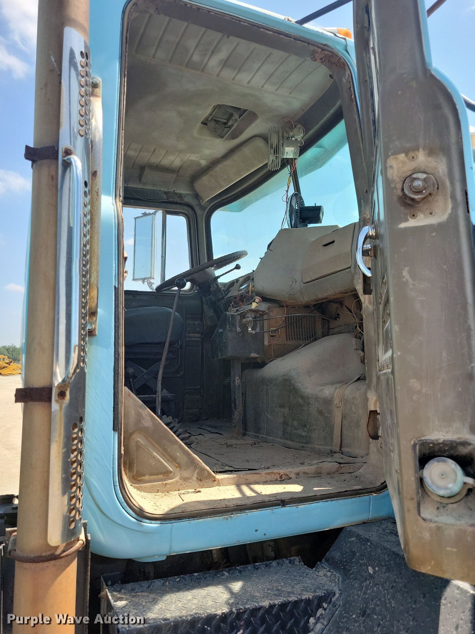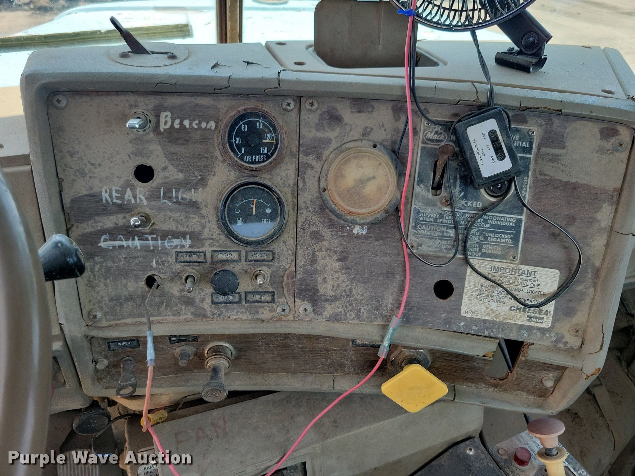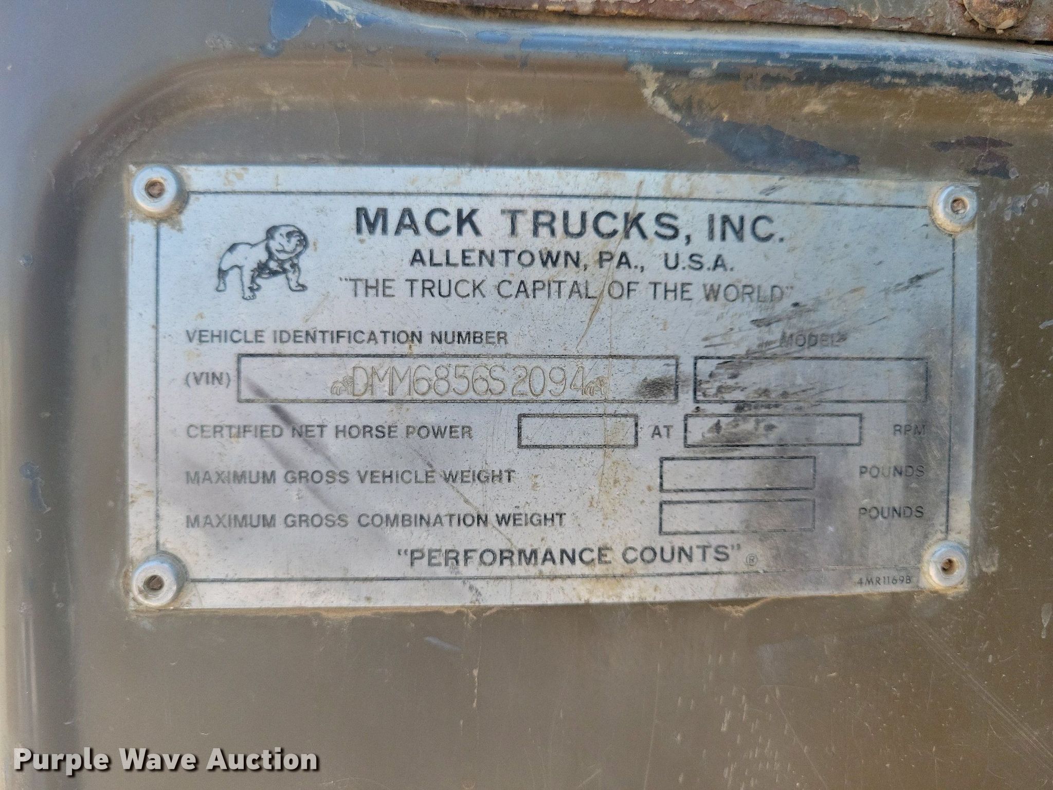 1974 Mack water truck. Miles: 212,980 on odometer, Hours: 3,428 on meter, VIN: DMM6856S2094. Engine Mack, Cylinders: 6, Fuel type: Diesel. Transmission Maxitorque, Manual, Speed: 5. Chassis Four wheel drive, Axles: Tandem, Differential lock: Inter-axle, Suspension: Spring over walking beam, Brakes: Air, PTO, Wet kit. Features Bed / tank Capacity: 5,000 gallons, 21' L x 96" W, Spray bar: Rear, Side discharge, Top fill. Tires Front: 425/65R22.5, Rear: 11R22.5. Notes Cracked elbow on pump. Iowa title. Title distribution may be delayed up to 14 days from verification of funds. Corell Contractor Inc. 1300 Lincoln Street. West Des Moines, IA 50265
