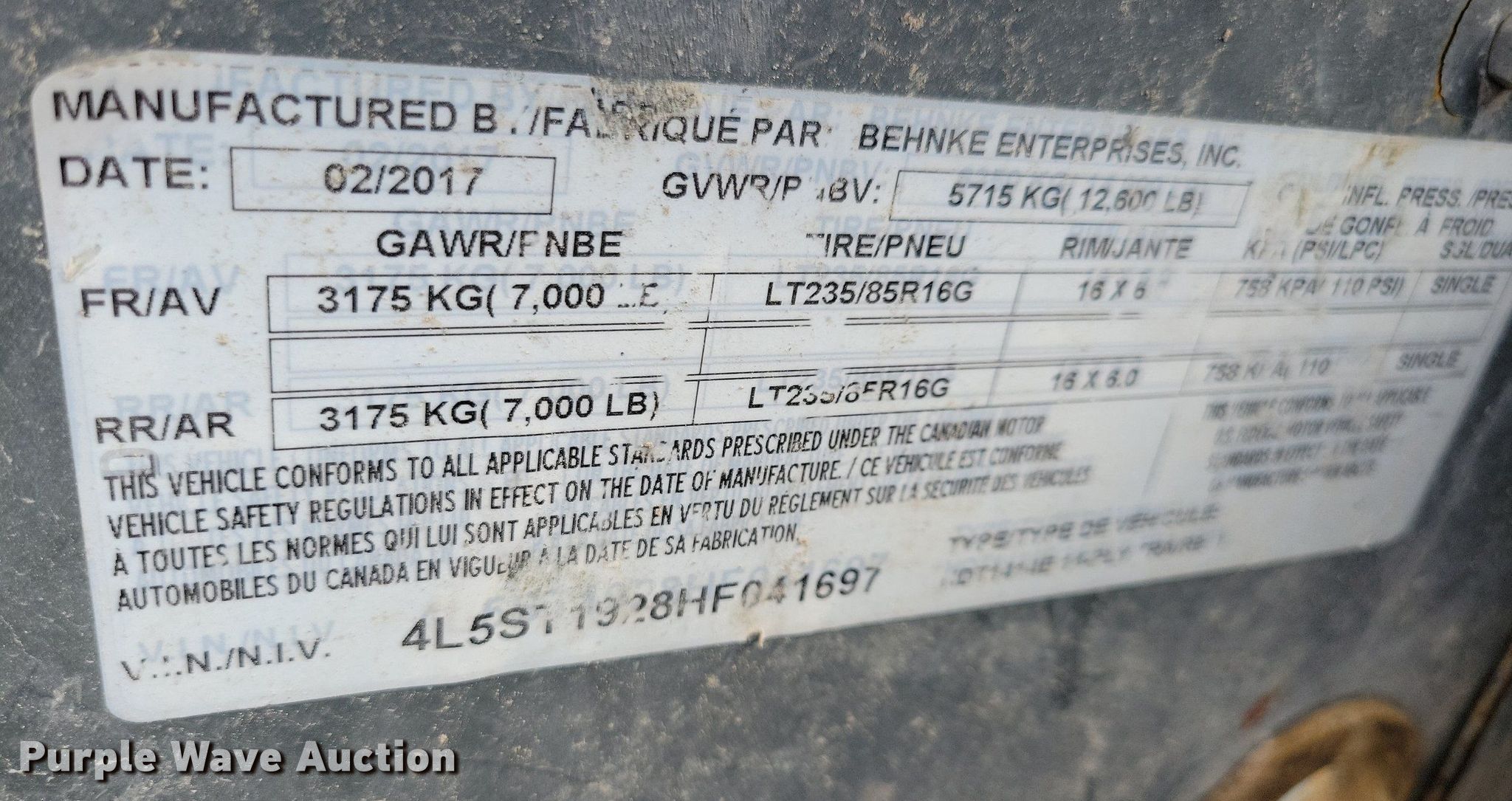 2017 Behnke Enterprises, Inc. HDT1414E equipment trailer. VIN: 4L5ST1928HF041697. Dimensions Overall: 22' L x 102" W, Deck: 14' L x 76" W, Deck height: 14", Tail length: 20". Features Hydraulic drop deck, Deck type: Steel, Hydraulic controls: Remote control. Chassis Ball hitch: 2 5/16", Landing gear: Single, Suspension: Spring, Brakes: Electric, Axles: Tandem, GVWR: 12,600 lbs, GAWR: 7,000 lbs. Tires Steel wheels, Size: ST235/85R16. Iowa title. Title distribution may be delayed up to 14 days from verification of funds. P & R Entry Door Inc. 2704 230th Street. Duncombe, IA 50532
