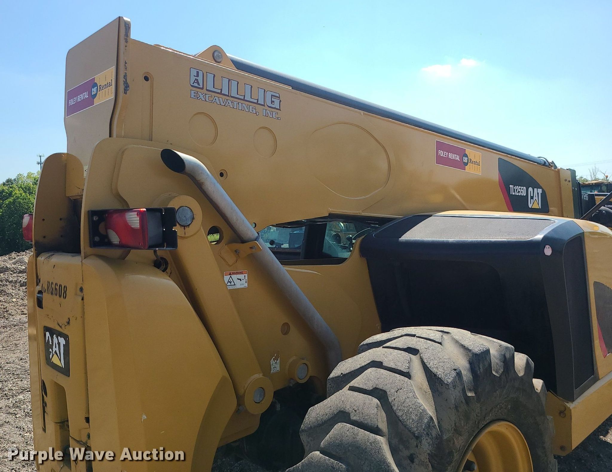 2018 Caterpillar TL1255D telehandler. Hours: 3,292 on meter, Serial: ML701332. Engine Caterpillar C4.4 Acert, Cylinders: 4, Fuel type: Diesel. Transmission Powershift, 4F - 4R, Four wheel drive. Operators station Enclosed cab, AC, Heat, Steering: Crab, Four wheel. Features Maximum lift capacity: 12,000 lbs, Maximum lift height: 54.9', Boom stages: 4, Fork length: 68", Auxiliary hydraulics, Hydraulic outriggers, Hydraulic leveling, Quick attach: Hydraulic. Tires Size: 17.5-25, Foam filled. J.A. Lillig Excavating, Inc. - Open inspection Sept. 22 and 27. 4507 Blue Ridge Cutoff. Kansas City, MO 64133