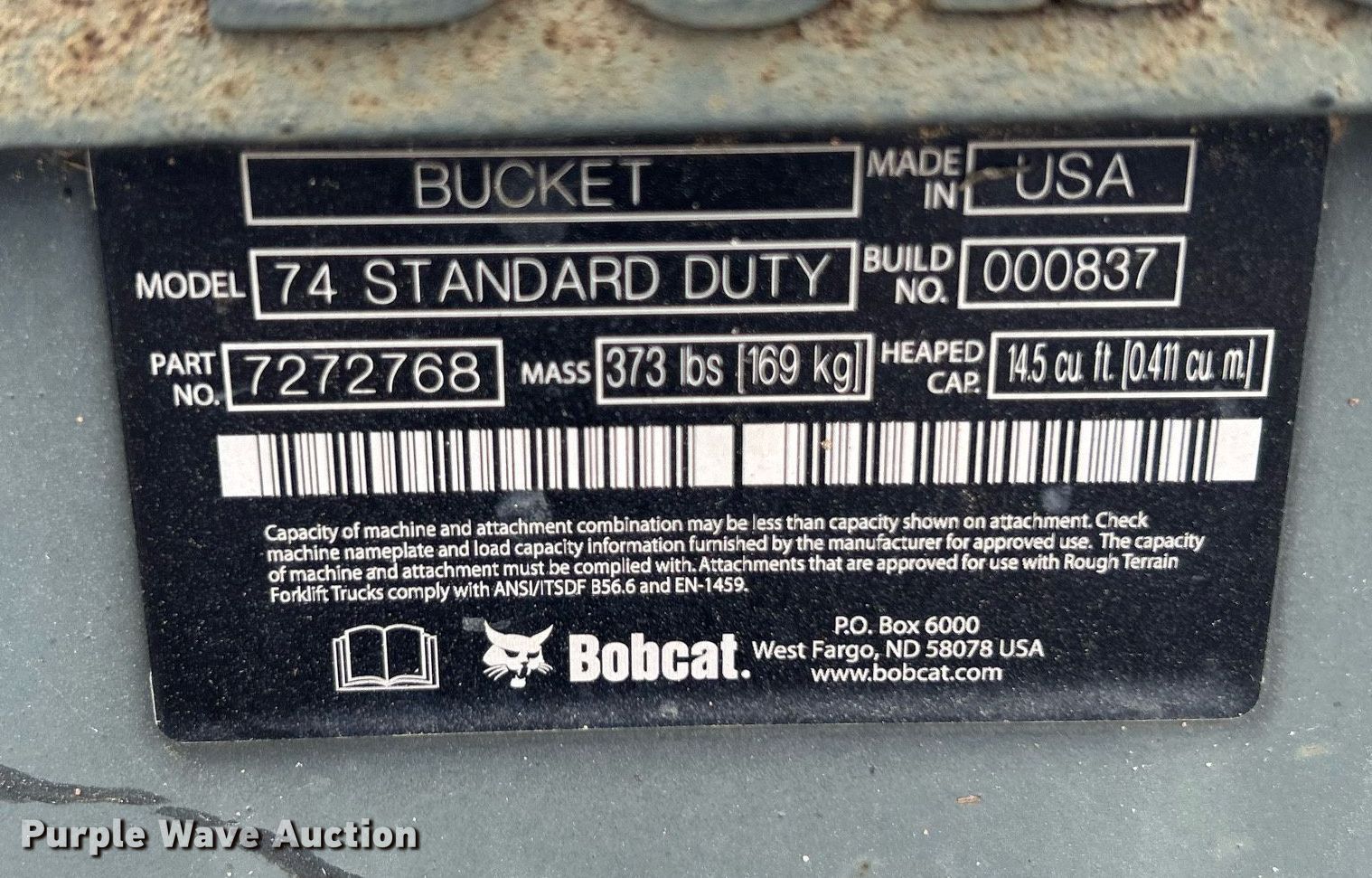 Purple Wave is selling a used Skid Steer Attach. in Oklahoma. This item is a Bobcat 72 Standard Duty skid steer bucket with the following: Width: 73"