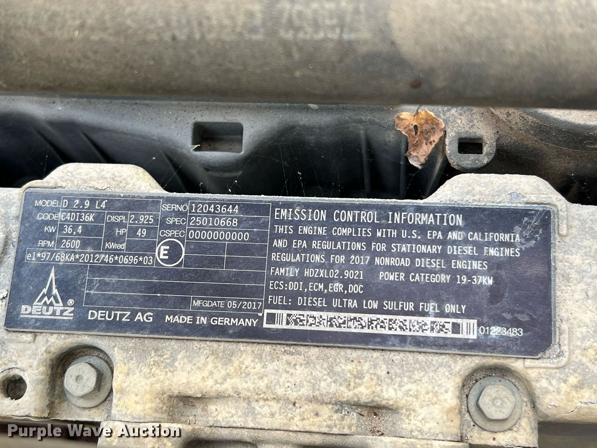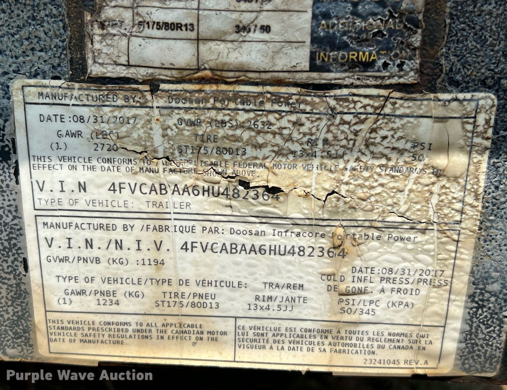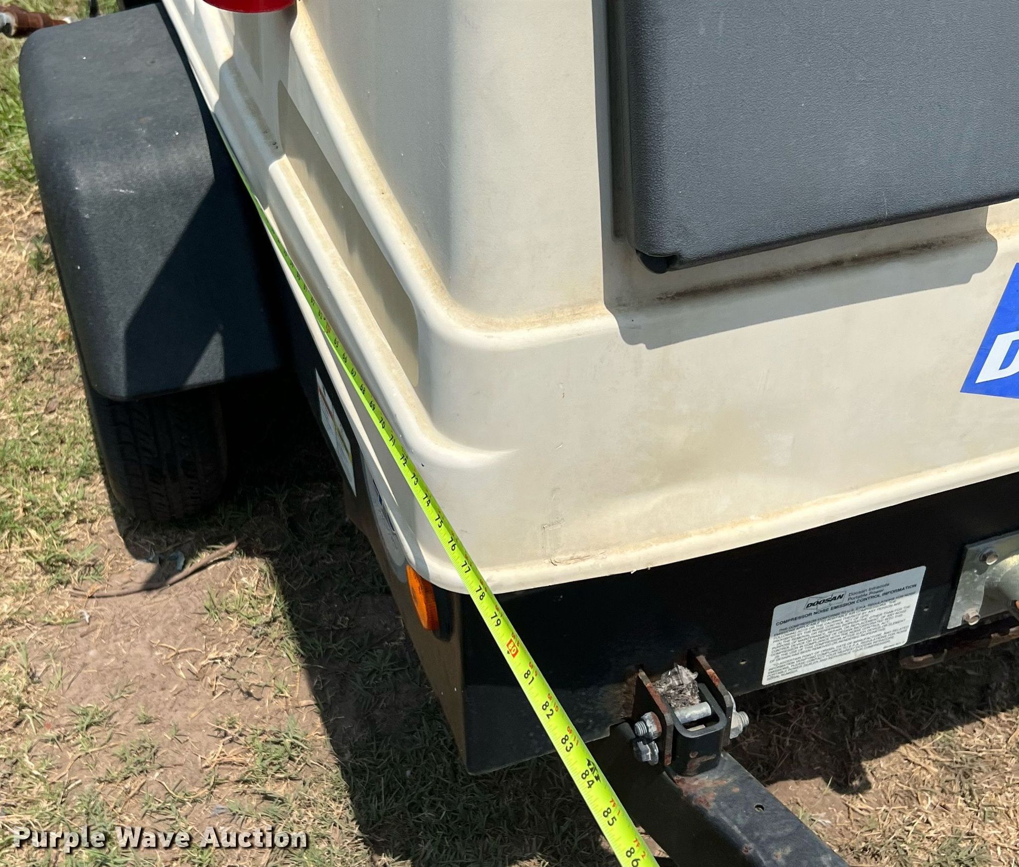 2017 Doosan C185 air compressor. Hours: 3,408 on meter, VIN: 4FVCABAA6HU482364, Serial: 482364UHABG07, Unit #: 10694356. Engine Deutz, Serial: 12043644, Displacement: 2.925L, Cylinders: 4, Fuel type: Diesel, HP: 49. Trailer 11.5' L x 64" W, Axles: Single, Tire size: 175/80D13. Notes Starter issues , Non-operational unit. This is worksite support equipment and will not come with a title. Transfer of ownership documentation will be a bill of sale. Plunkett Enterprises. 995 South Front Street. Angleton, TX 77515