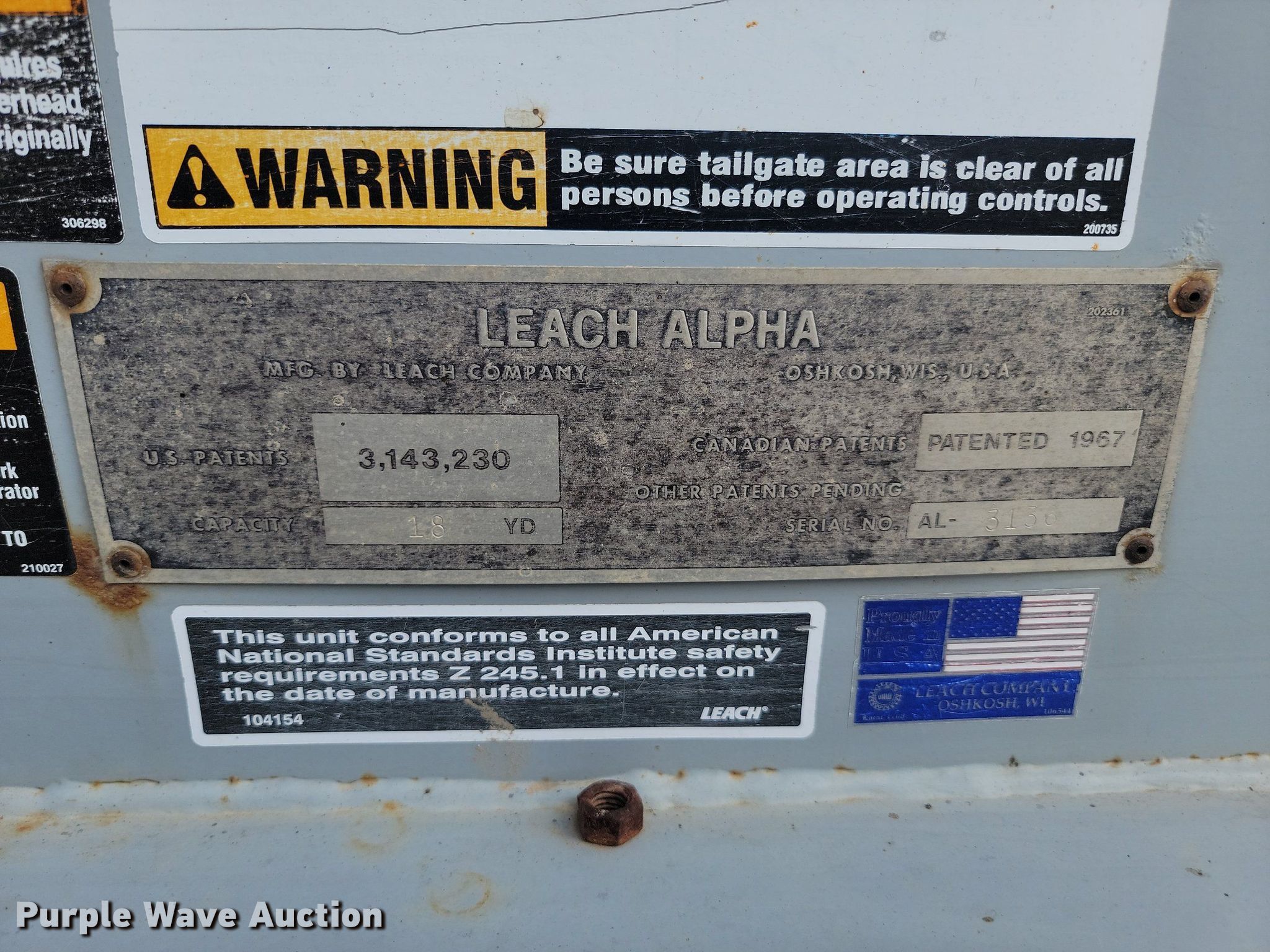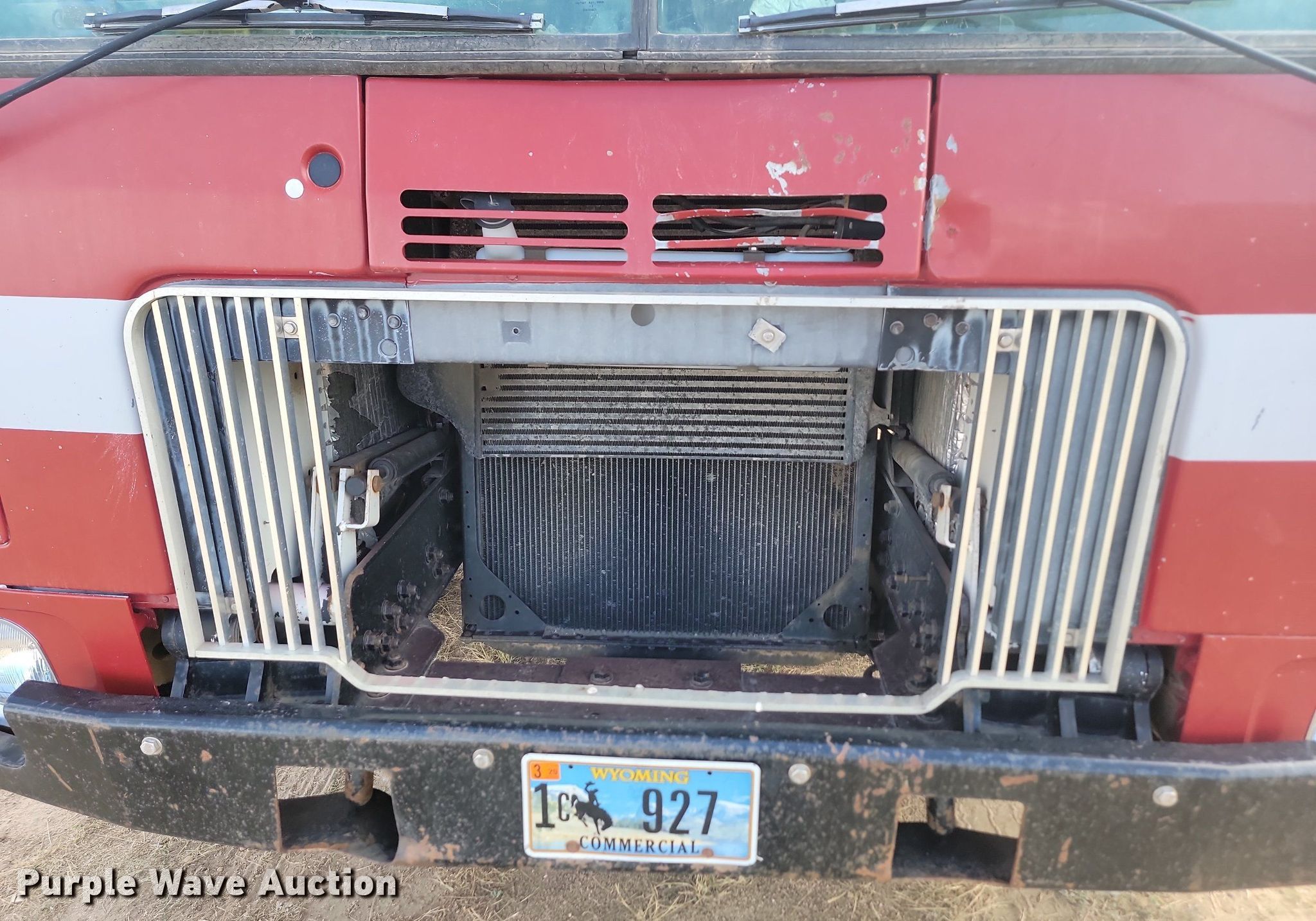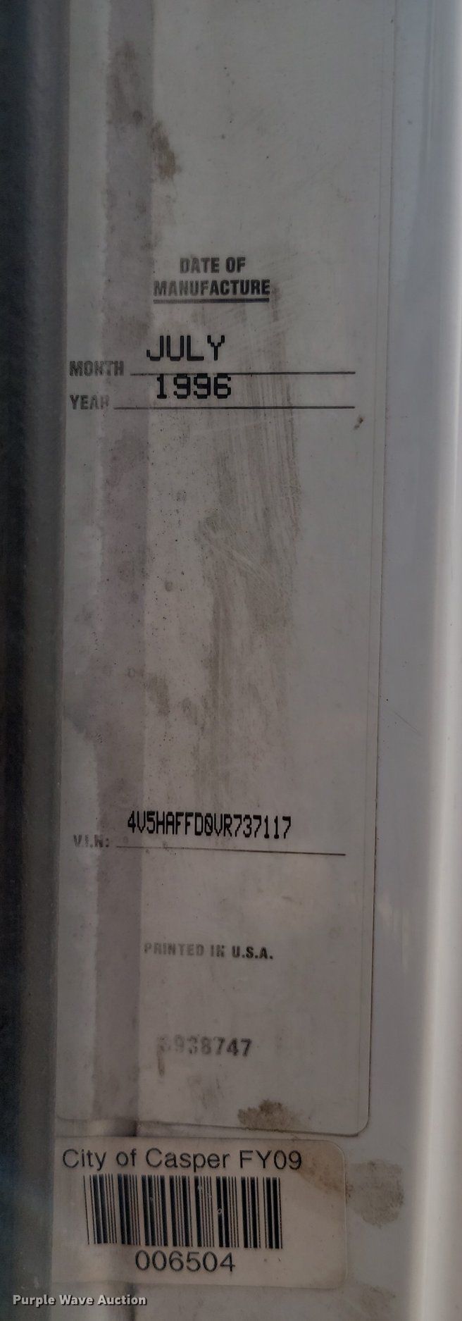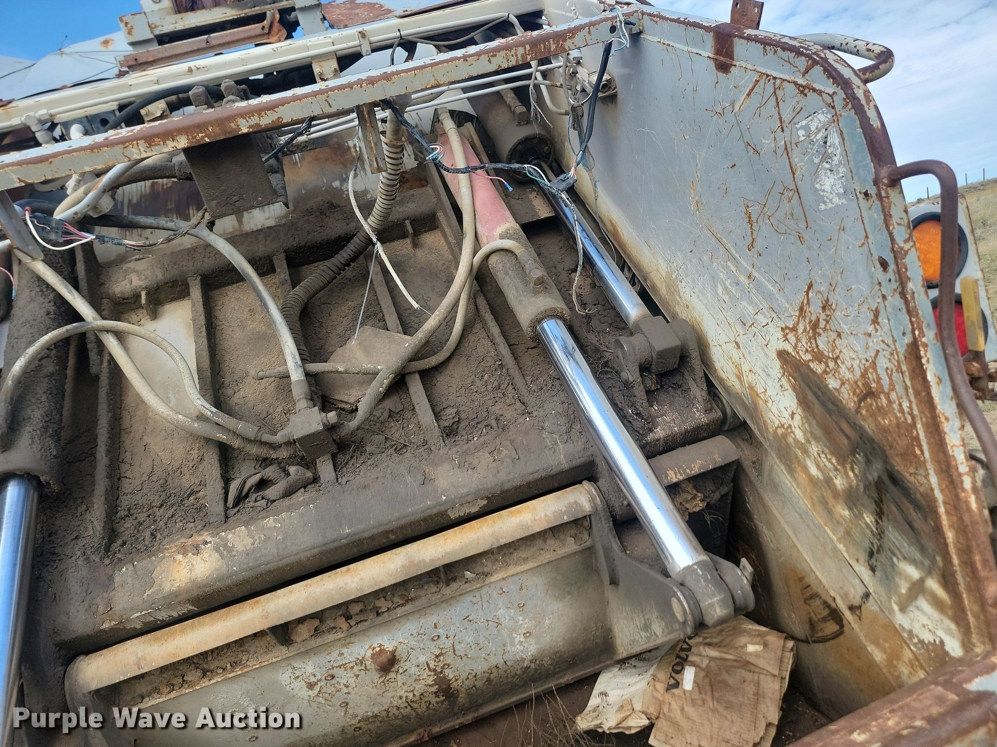 1997 Volvo WXLL refuse truck. Unknown miles on odometer, Miles: Unknown, VIN: 4V5HAFFD0VR737117. Engine Volvo VE D7, Displacement: 6.7L, Cylinders: 6, Fuel type: Diesel. Transmission Automatic. Chassis Axles: Single, Suspension: Spring, Brakes: Air, PTO. Interior Heat. Features Refuse bed Leach Alpha, Serial: AL-3136, Capacity: 18 cu.yd., Load: Rear, Cart tipper, Winch. Tires Size: 295/75R22.5. Notes Non-operational winch , Non-operational cart tipper , Non-operational odometer, Door latch issues, Fuel filter issues, Windshield chipped or cracked. Wyoming title. Title distribution may be delayed up to 14 days from verification of funds. Blackburn Cattle Co Inc. 81 Inez Road. Douglas, WY 82633