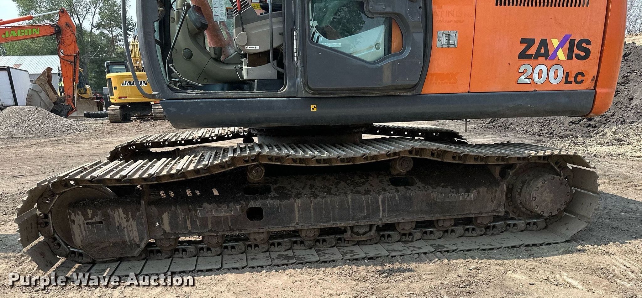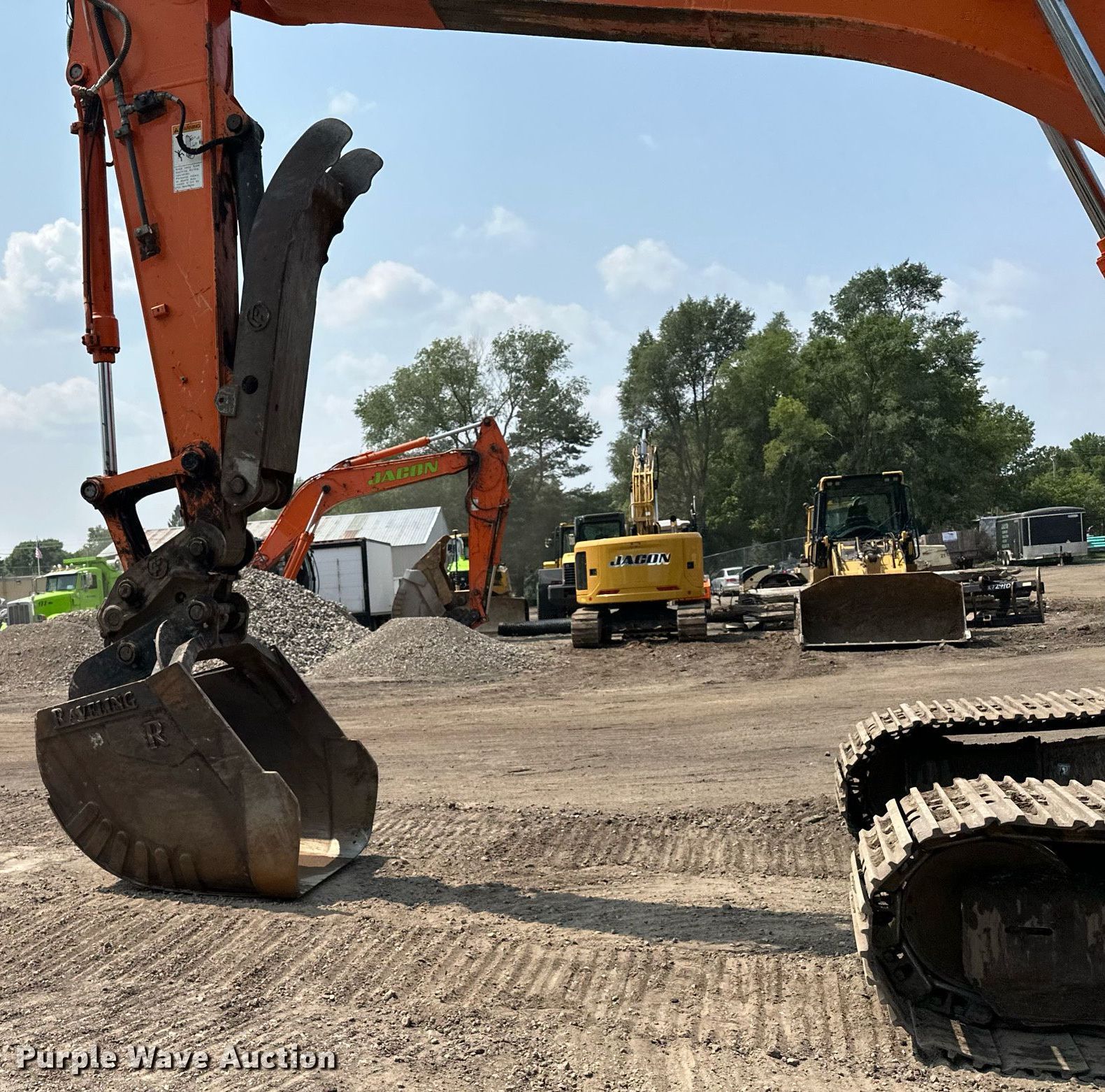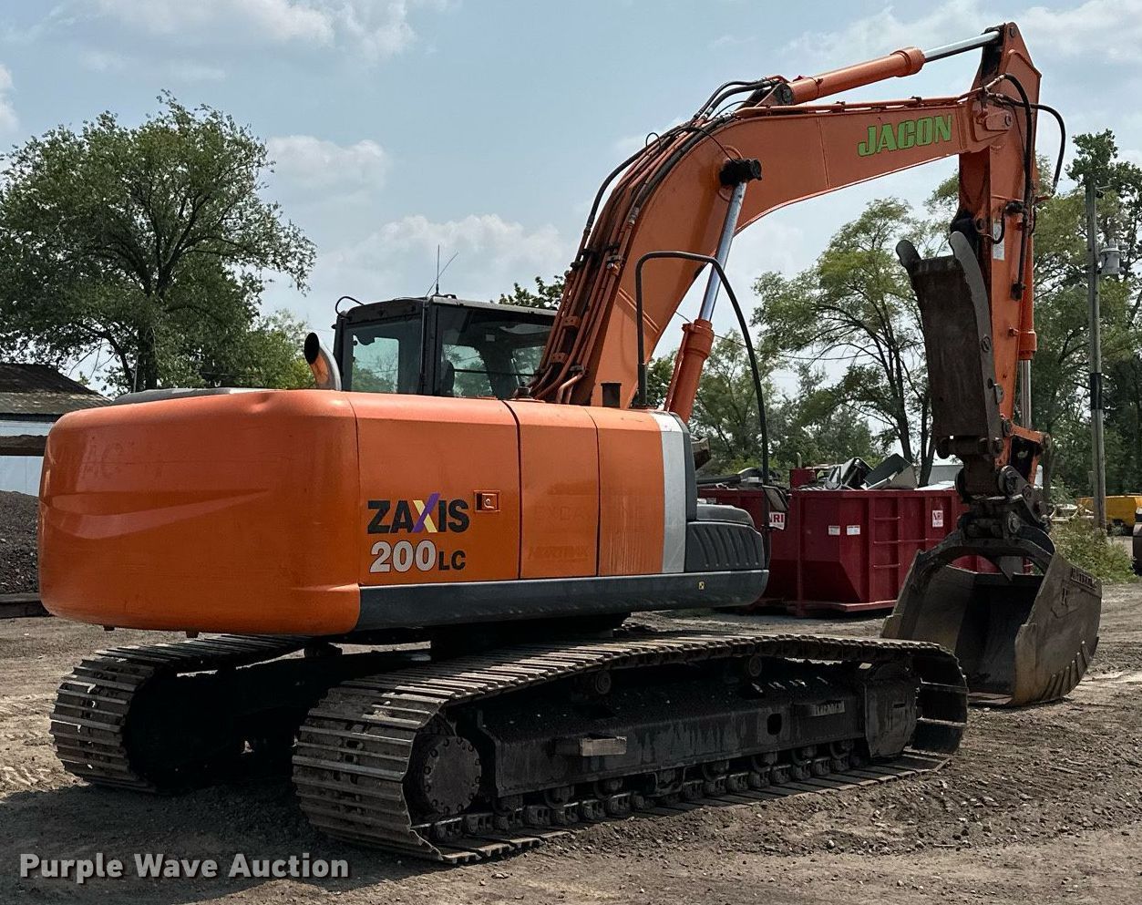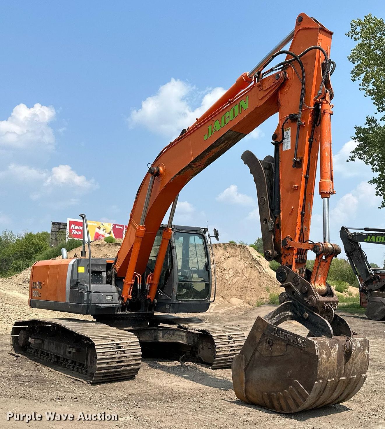 2012 Hitachi ZX200LC-3 excavator. Hours: 7,337 on meter, Serial: 1FFAST0XLCD321079. Engine Isuzu, Cylinders: 6, Fuel type: Diesel. Transmission Hydrostatic, Two speed travel. Operators station Enclosed cab, AC, Heat. Features Auxiliary hydraulics, Boom Standard, Stick Stick length: 9' 7", Thumb: Hydraulic, Weld-on Cf, Bucket Raveling, Width: 48", Cutting edge: Weld-on. Tracks Width: 31.5", Grouser pads: Triple. JACON LLC.. 1101 South Birch Lake Boulevard. White Bear Lake, MN 55127