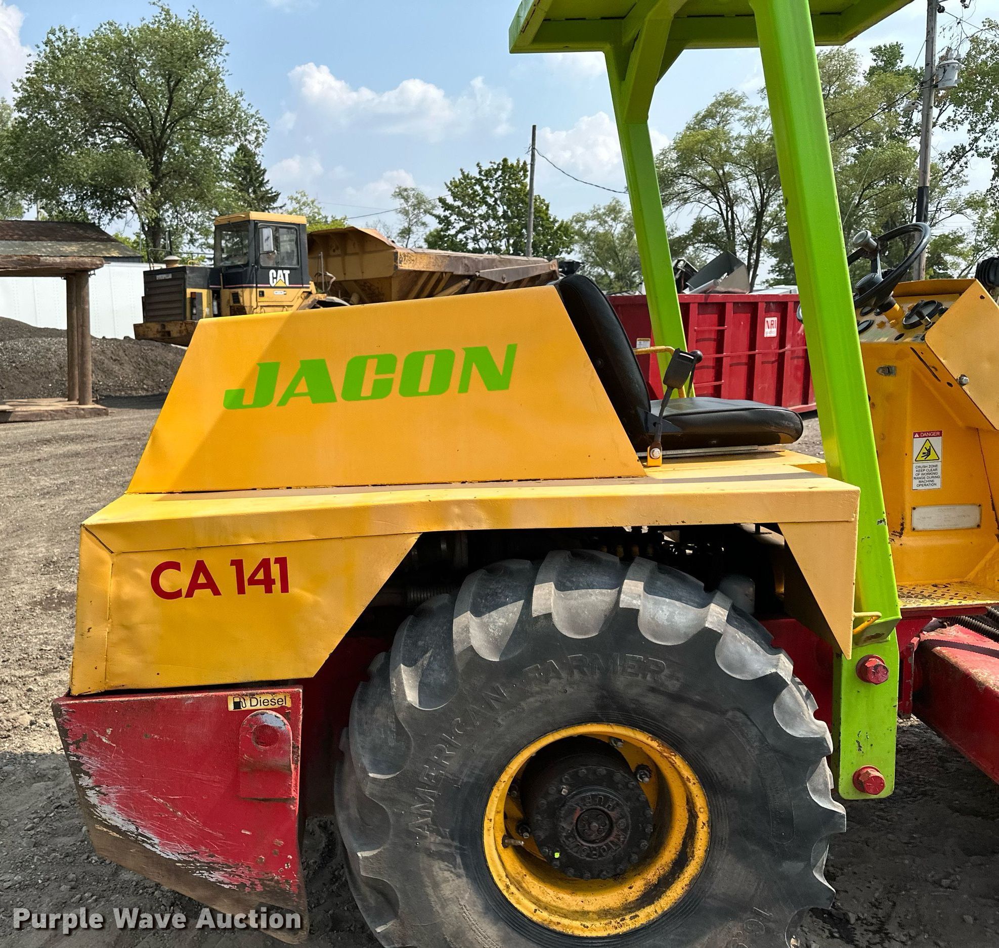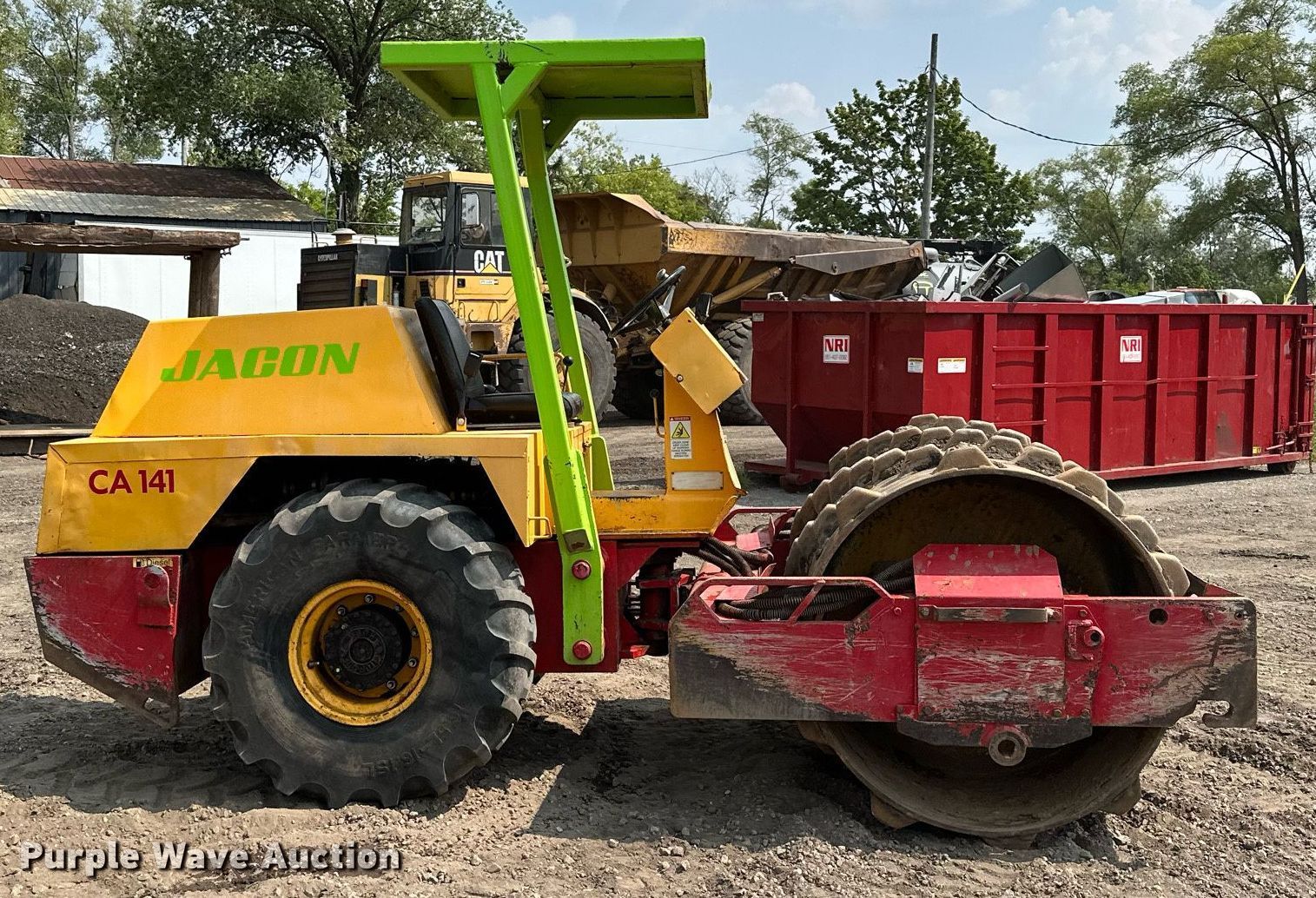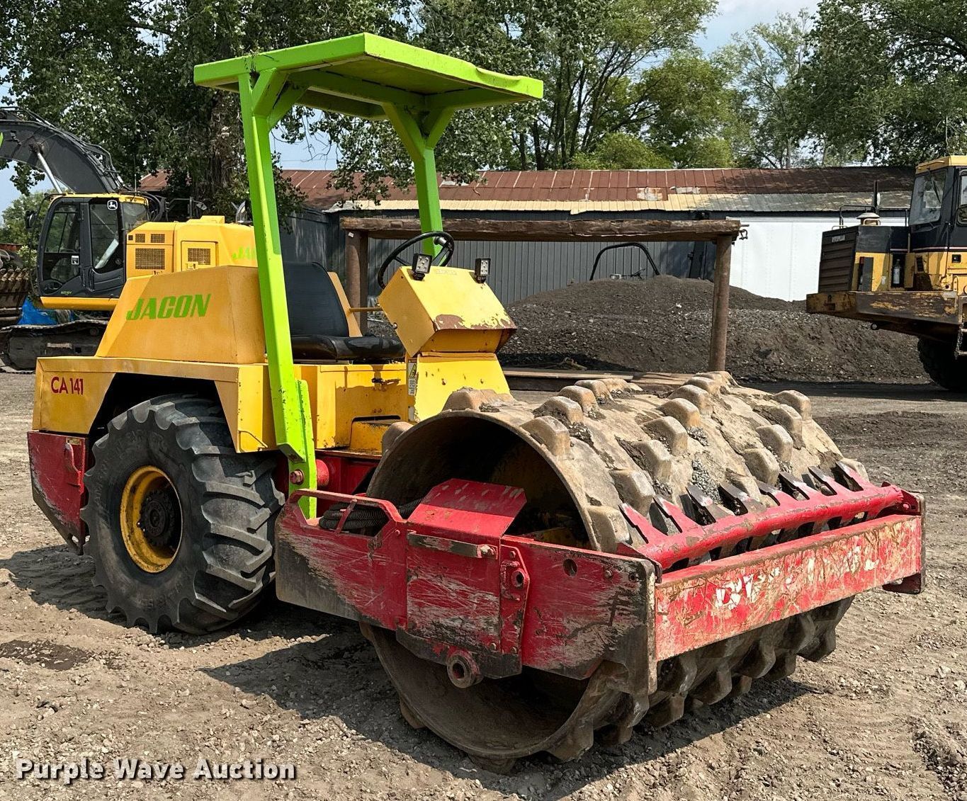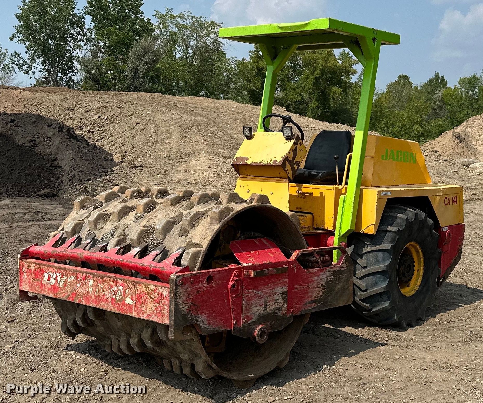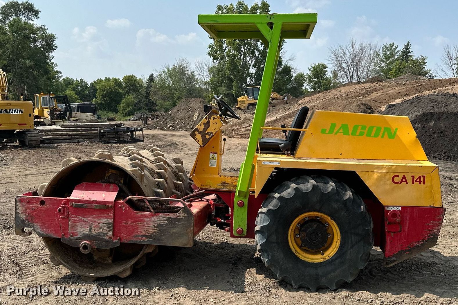 1995 Dynapac CA141 single drum vibratory roller. Hours: 3,537 on meter, Serial: 60410190. Engine John Deere, Cylinders: 3, Fuel type: Diesel. Transmission Hydrostatic. Operators station OROPS, Vandal cover. Features Drum: Sheepsfoot, Vibratory system: Single, Front drum Width: 60", Diameter: 45", Drum scrapers: Front. Tires Size: 16.5L-16.1SL. JACON LLC.. 1101 South Birch Lake Boulevard. White Bear Lake, MN 55127