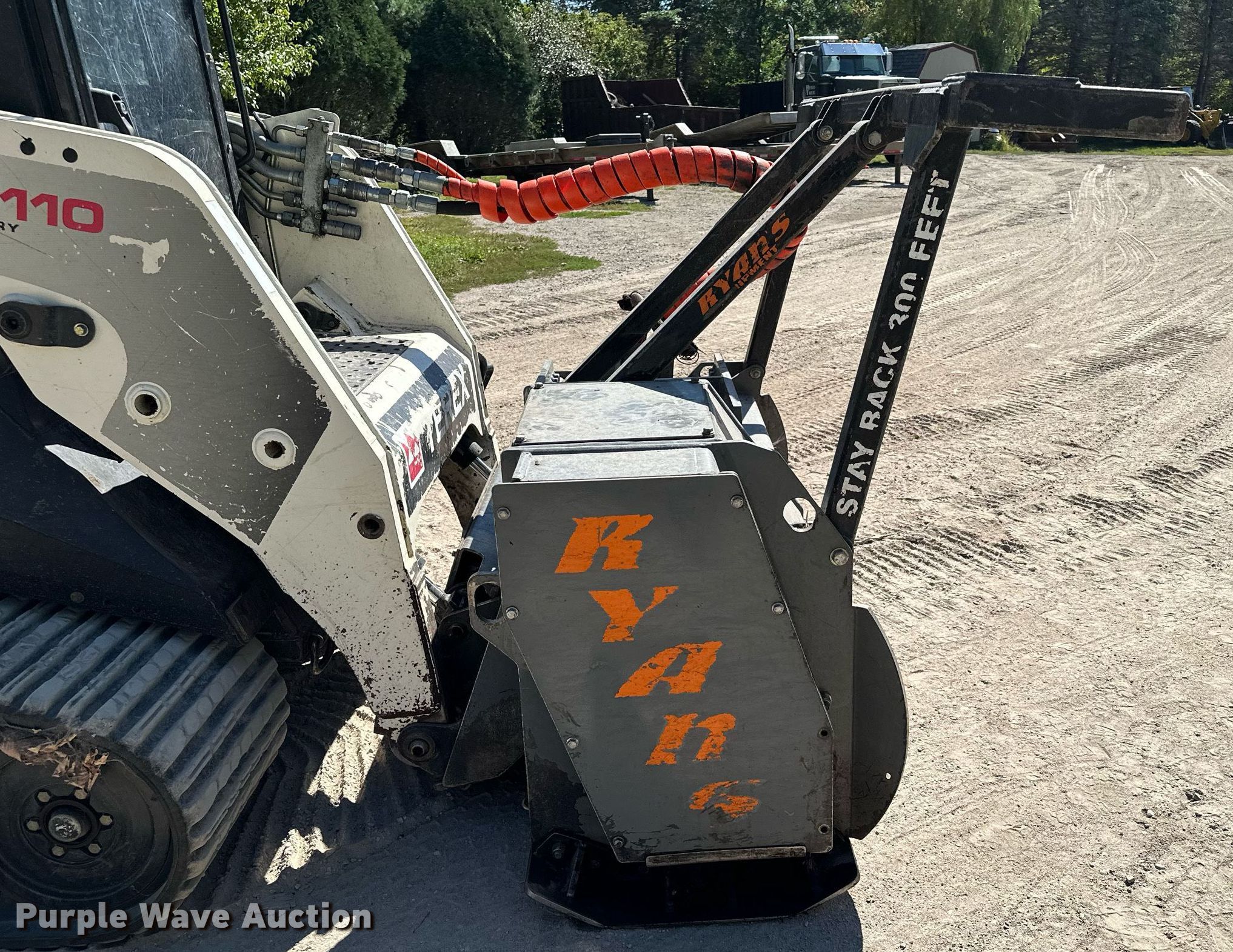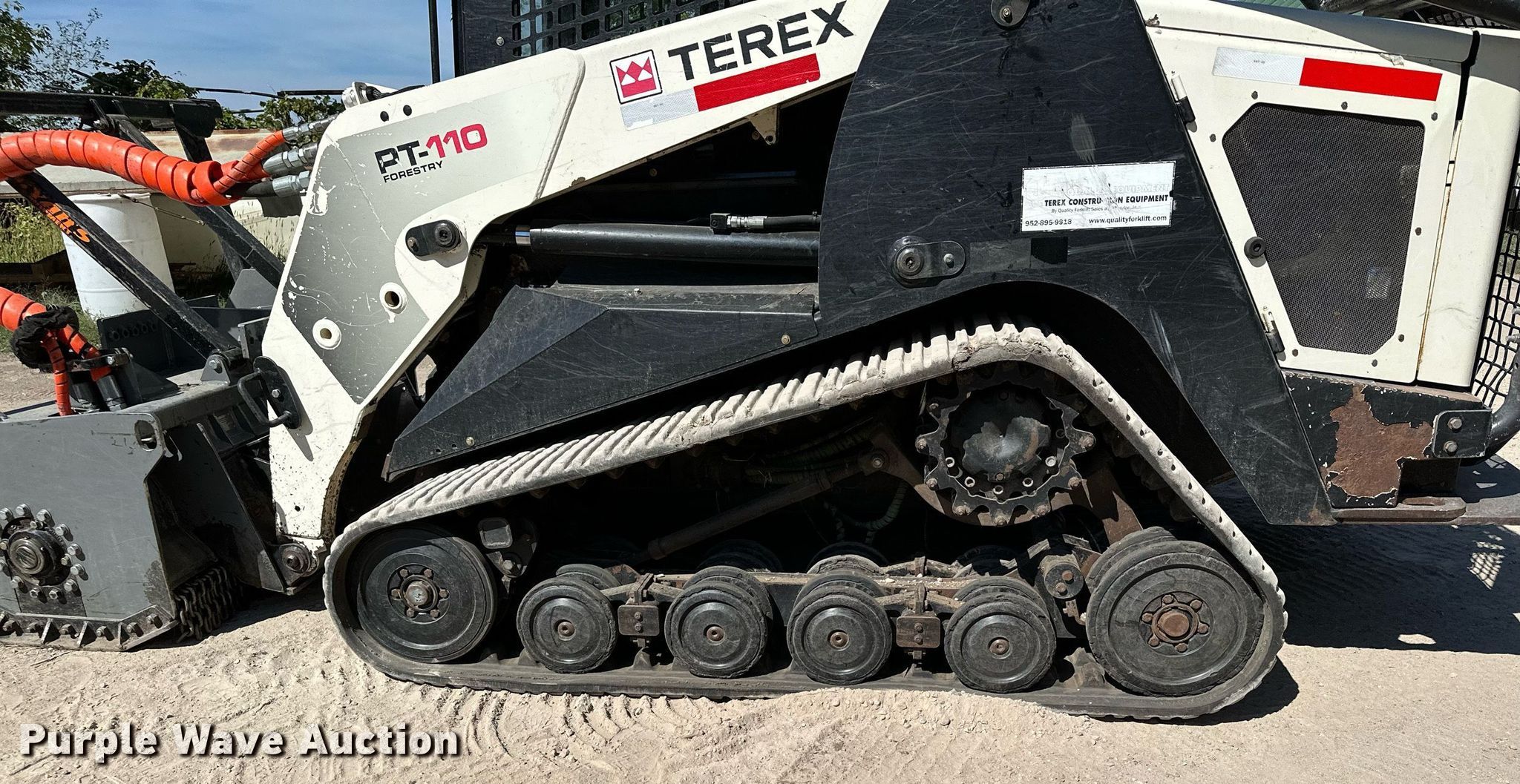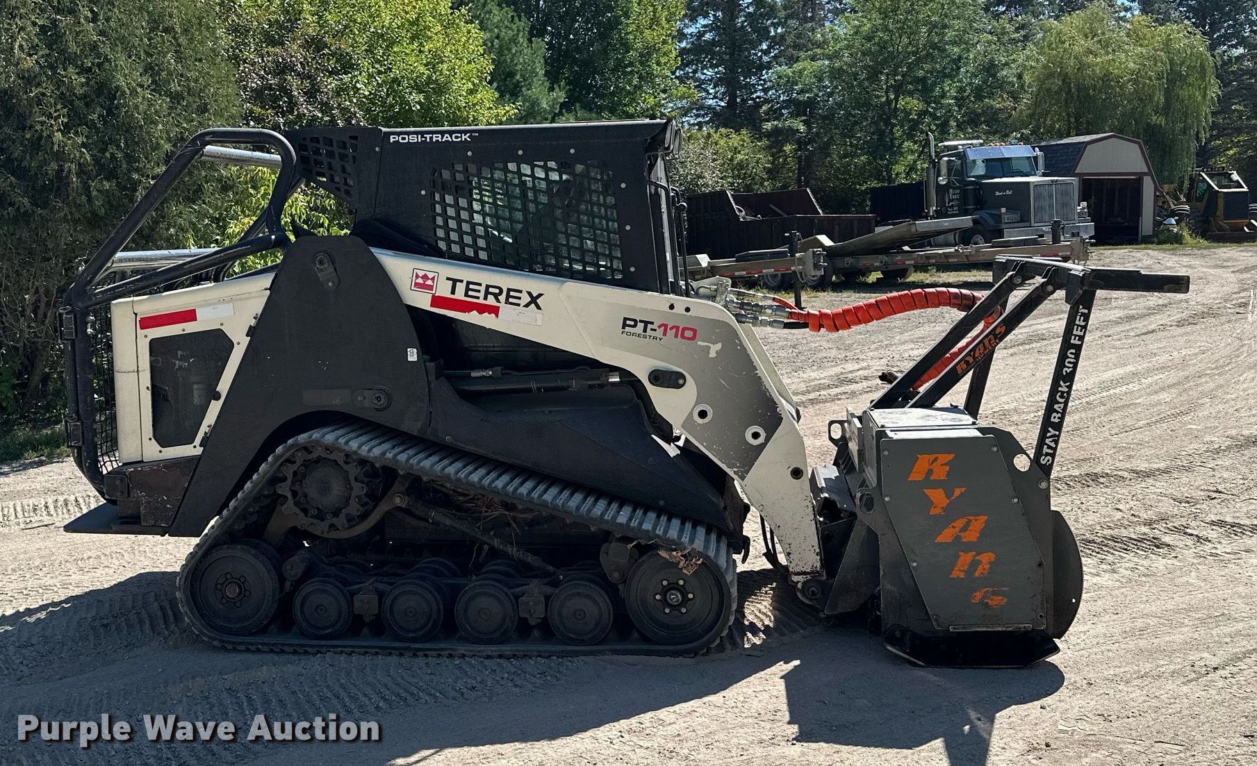 2015 Terex PT-110 tracked skid steer loader. Hours: 1,701 on meter, Serial: A9VPT110C5WF00615. Engine Cylinders: 4, Fuel type: Diesel. Transmission Hydrostatic. Operators station Enclosed cab, AC, Heat, Bucket control: Hand, Electronic Monitoring System panel. Features Auxiliary hydraulics, Auxiliary electrical outlet, Quick coupler: Hydraulic, Mulcher Ryans 560, Serial: 034, Width: 61". Tracks Width: 12". Hugo Tree. 14728 Irish Avenue North. Hugo, MN 55038