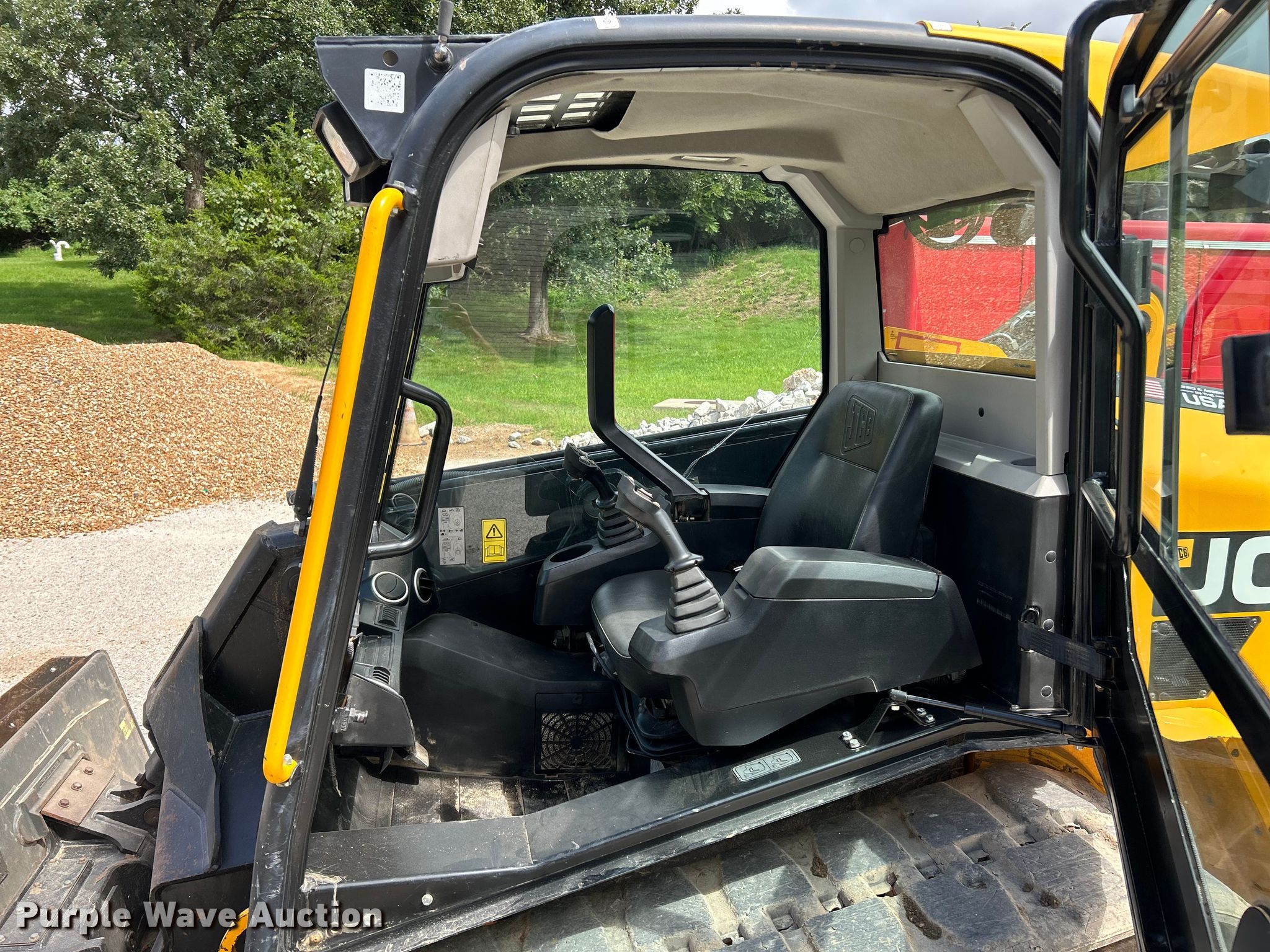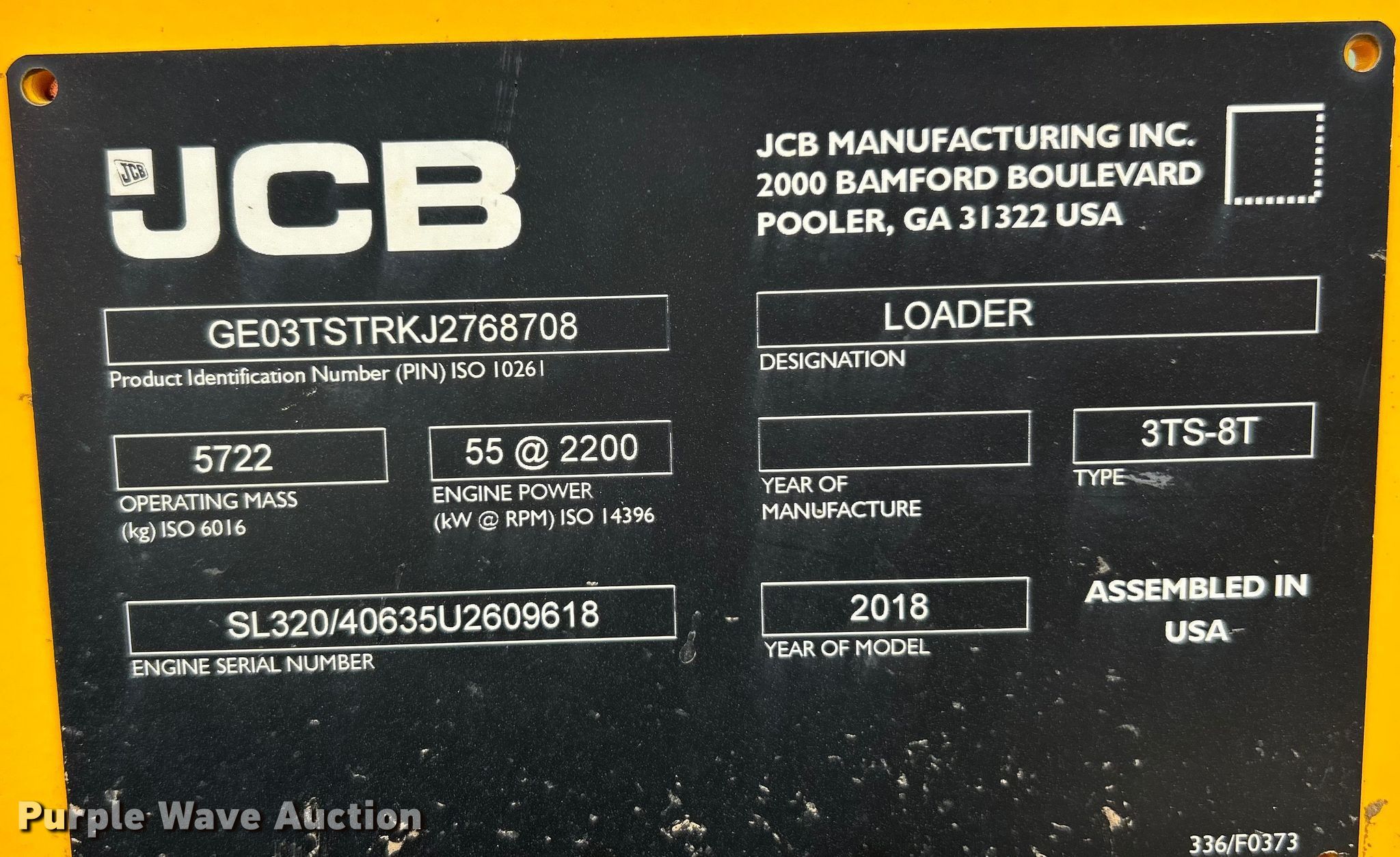 2018 JCB 3TS-8T tracked skid steer loader. Hours: 1,990 on meter, Serial: GE03TSTRKJ2768708. Engine EcoMAX TCAE-55, Serial: SL320/40635U2609618, Cylinders: 4, Fuel type: Diesel, HP: 74. Transmission Hydrostatic, Two speed travel. Operators station Enclosed cab, AC, Heat, Bucket control: Hand, Pattern changer. Features Auxiliary hydraulics, Auxiliary electrical outlet, Quick coupler: Hydraulic, Extendable boom, Bucket Bobcat , Width: 80", Teeth: Bolt-on. Tracks Width: 17.5". Notes Side glass cracked. Kelpe Contracting, Inc.. Wildwood, MO 63038