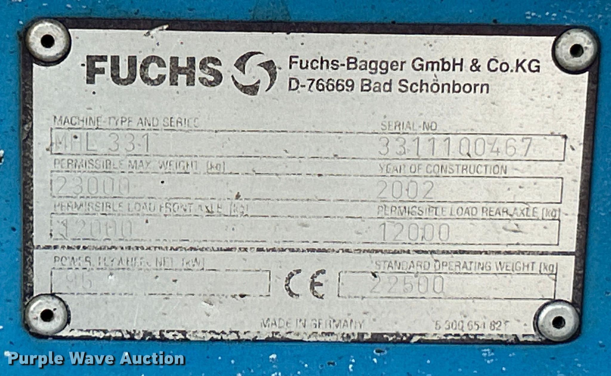 Purple Wave is selling a used Wheeled Excavator in Illinois. This item is a 2002 Fuchs MHL331 material handler with the following: Hours: 21,908 on meter, Serial: 3311100487