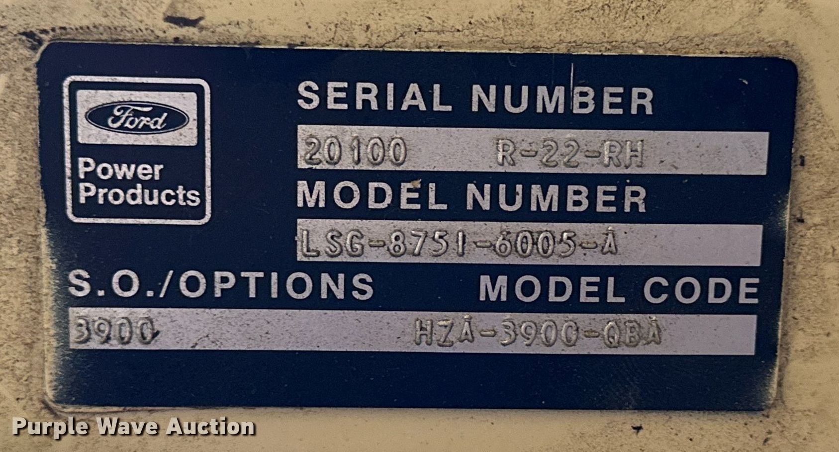 Kohler 60RZ262 generator. Hours: 338 on meter, Serial: 392882. Engine Ford LSG-8751-6005-A, Serial: 20100, Cylinders: 8, Fuel type: Natural gas. Features Generator kW: 60, Phase: Single, Backup start, Electric start, Skid mounted, Kohler transfer switch Serial: K77405, Amps: 225, Hz: 60. Notes Possible radiator issues, heating issues. Golden Belt Telephone Assn.. 103 Lincoln Street. Rush Center, KS 67575