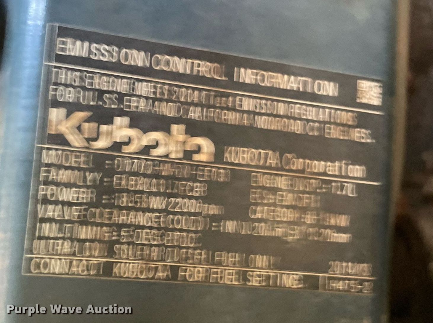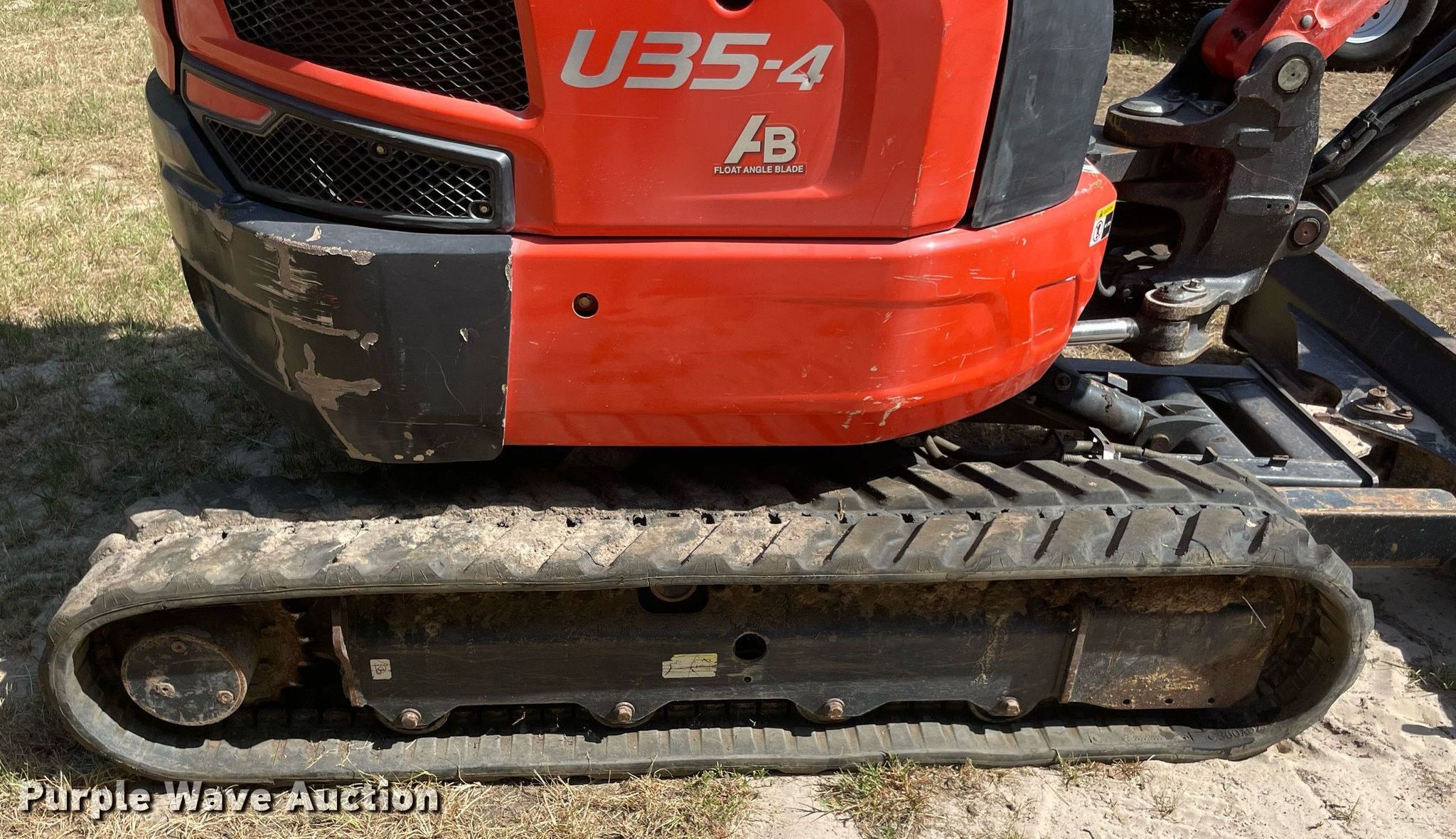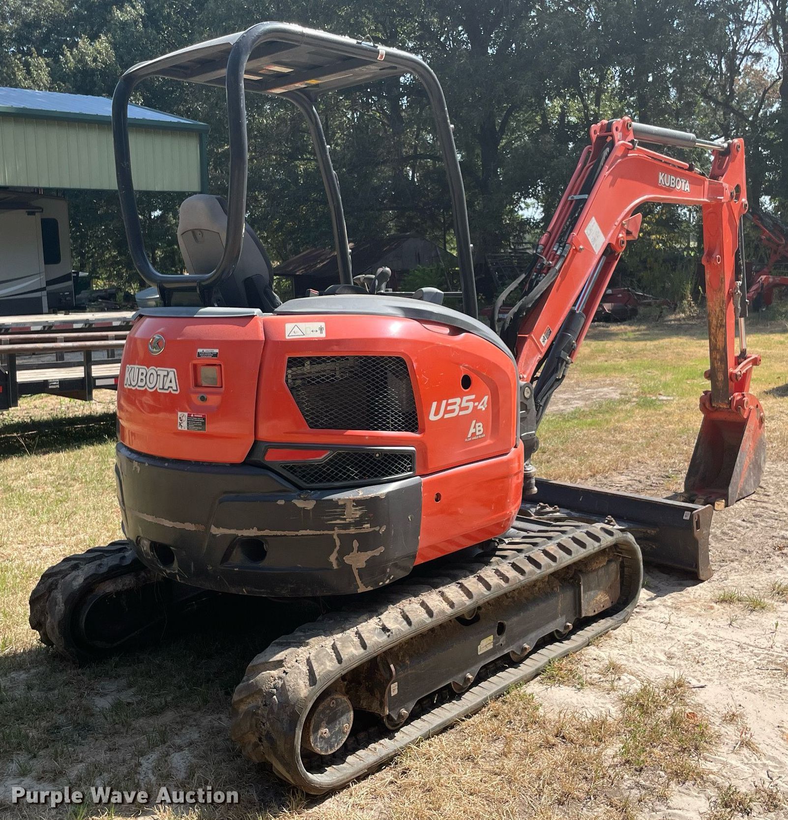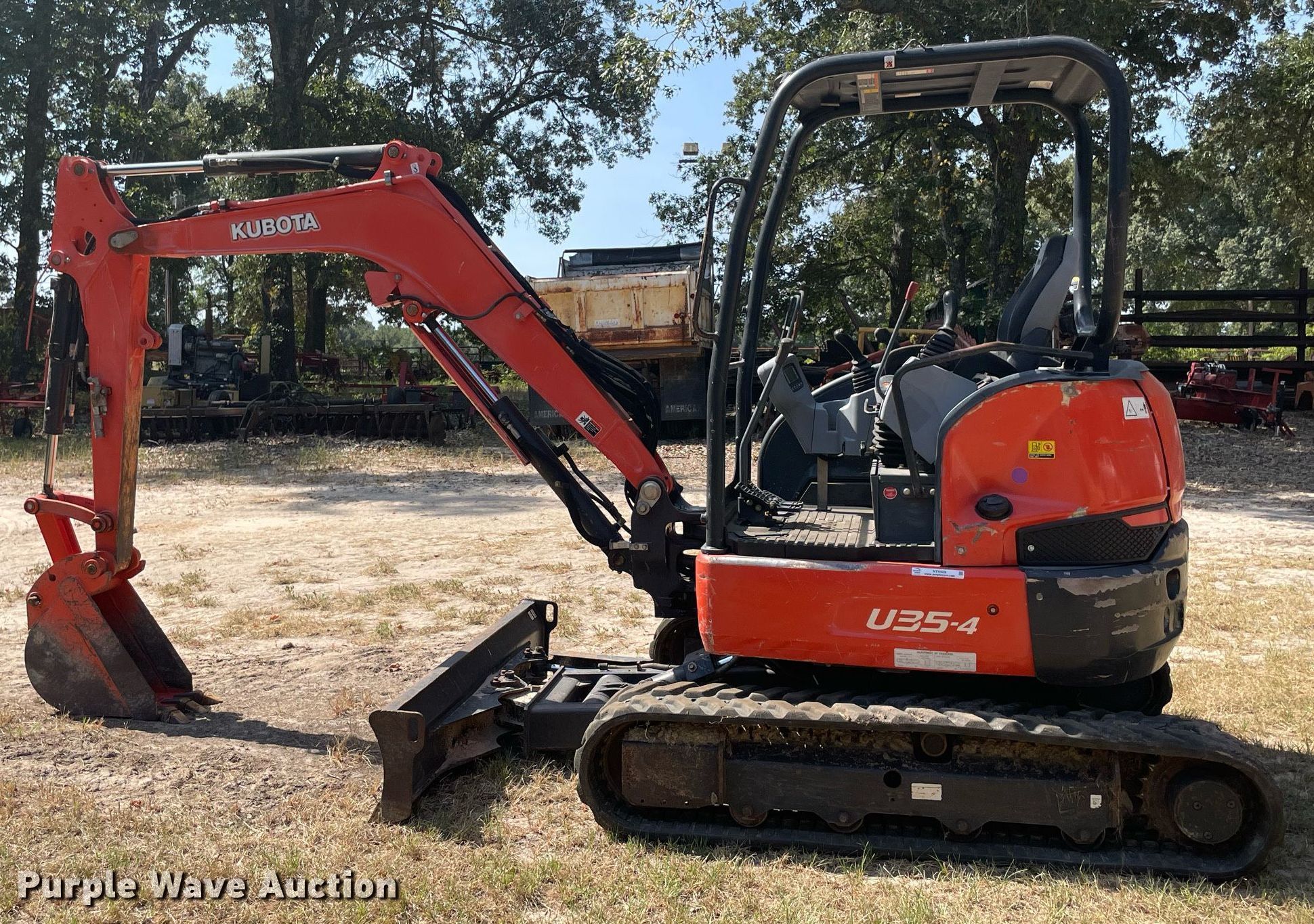 2014 Kubota U35-4 mini excavator. Hours: 3,886 on meter, Serial: 10710. Engine Cylinders: 3, Fuel type: Diesel. Transmission Hydrostatic, Two speed travel. Operators station OROPS, Pattern changer. Features Auxiliary hydraulics, Backfill blade Width: 67", Boom Swing, Stick Stick length: 4' 6", Quick coupler: Mechanical, Bucket Width: 11", Cutting edge: Weld-on, Teeth: 3. Tracks Width: 12", Rubber. Ballards Tractor. 1231 County Road 2385. Alba, TX 75410
