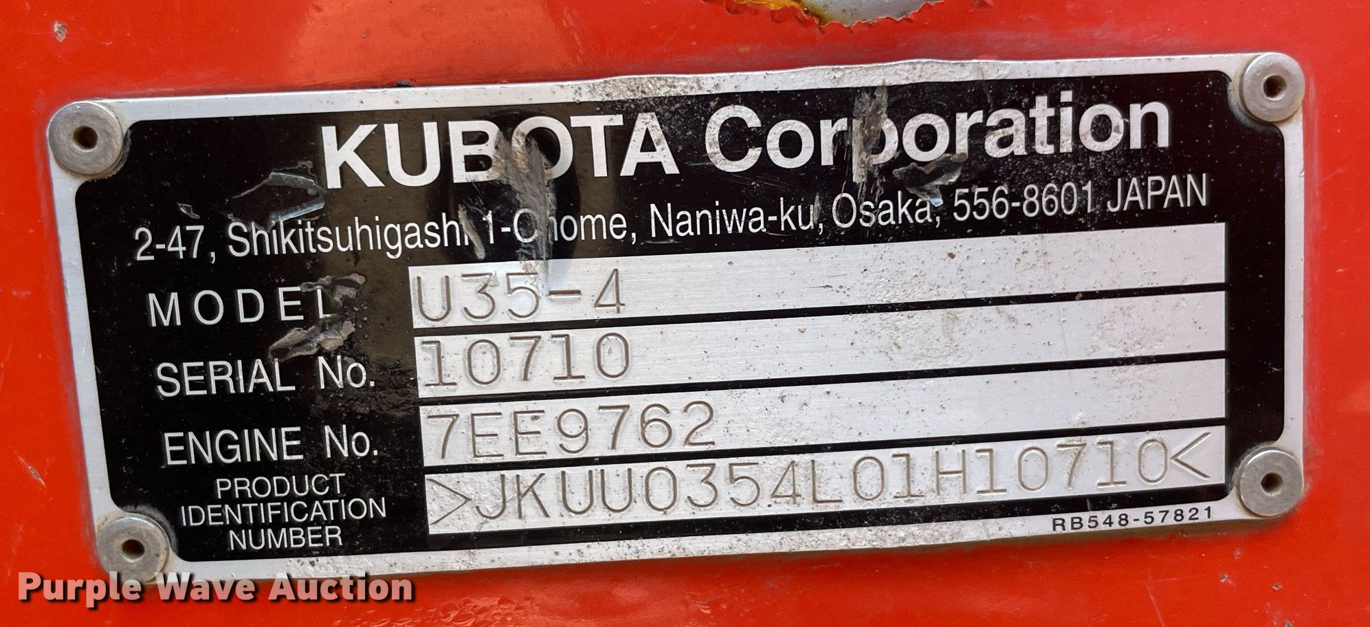 Purple Wave is selling a used Mini Excavator in Texas. This item is a 2014 Kubota U35-4 mini excavator with the following: Hours: 3,886 on meter, Serial: 10710