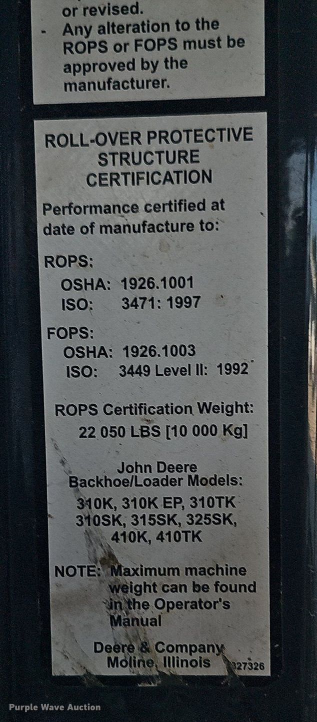 2013 John Deere 310SK backhoe. Hours: 10,149 on meter, Serial: 1TO310SKJDE245169, Unit #: 45-411. Engine John Deere , Cylinders: 4, Fuel type: Diesel. Transmission Powershift, 5F - 3R. Chassis Differential lock. Operators station Enclosed cab, AC, Heat, Backhoe controls: Pilot control, Pattern changer. Features Loader Auxiliary electrical outlet, Bucket John deere , Width: 90", Cutting edge: Bolt-on, Backhoe Extendable stick, Bucket Width: 24", Cutting edge: Weld-on, Teeth: 5.. Tires Front: 12.5/80/18, Rear: 19.5L-24. Emery Sapp & Sons, Inc.. 5350 E State Hwy AA. Springfield, MO 65803