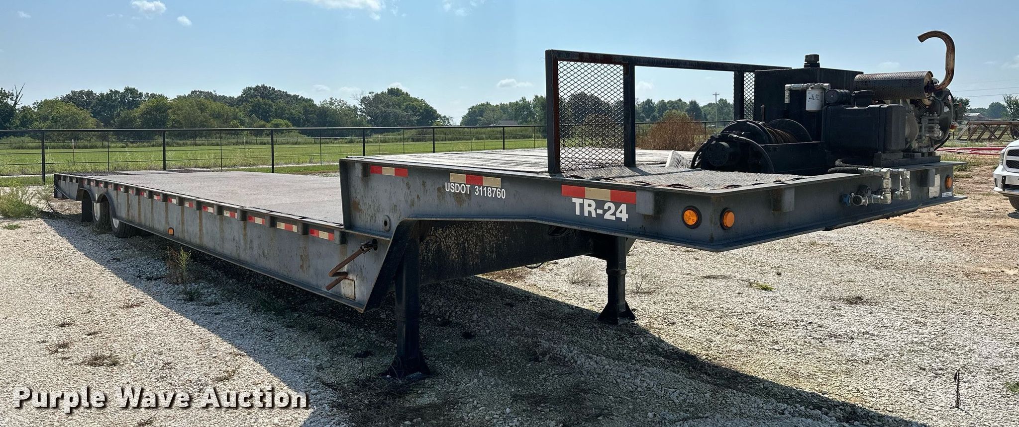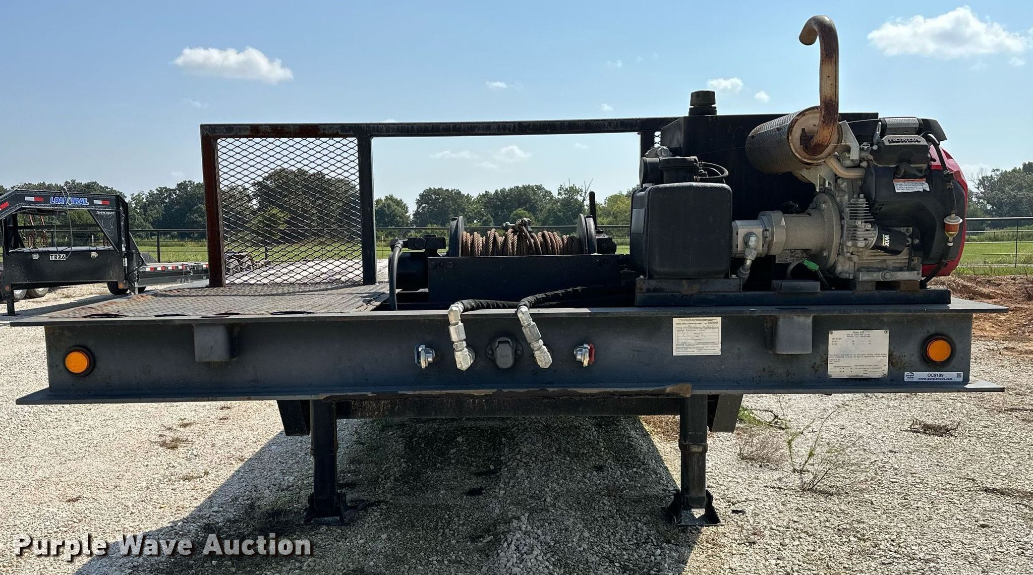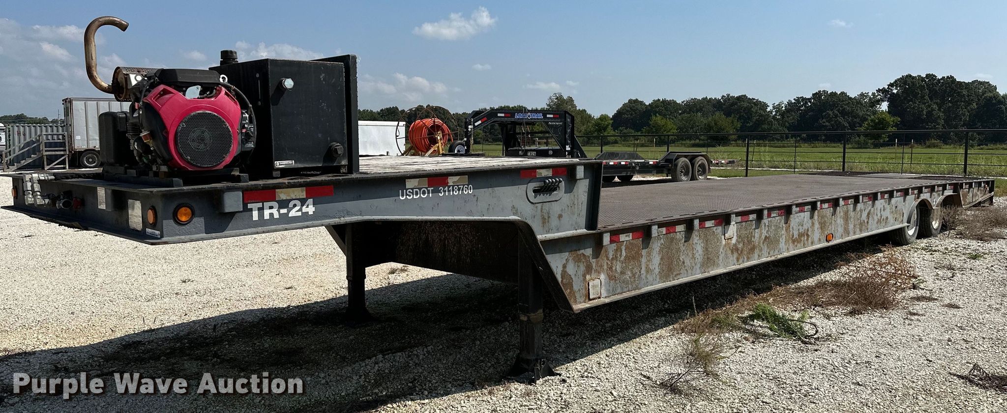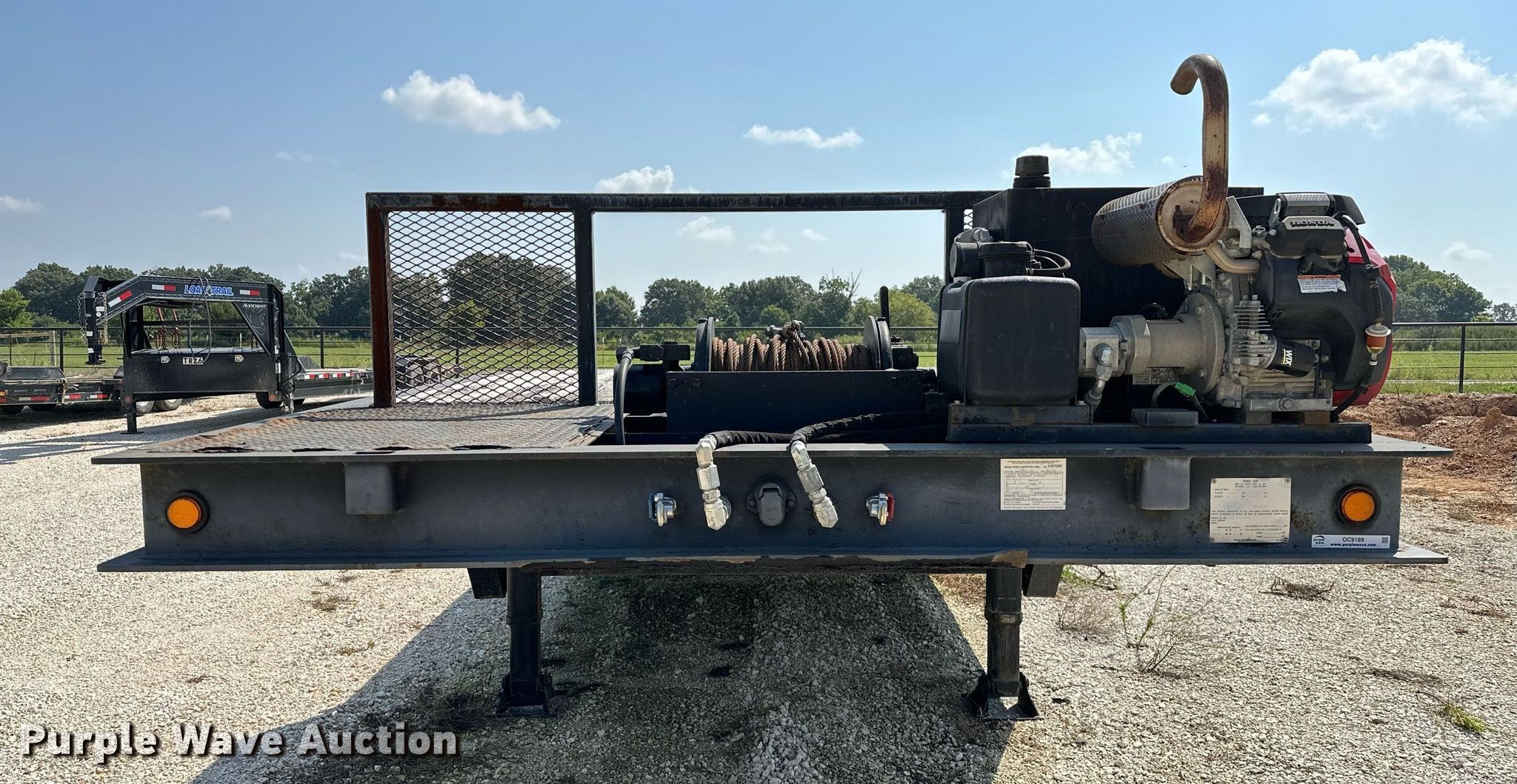 2000 Dakota Trail-EZE drop deck equipment trailer. VIN: 1DA72C733YC014947. Dimensions Overall: 48' L x 102" W, Deck: 38' 3" L x 96" W, Top deck length: 6' 3", Deck height: 20", Hydratail length: 96", Ramps: Hydraulic Length: 48". Features Deck type: Steel, Wood, Board size: 9", Self-contained hydraulics, Winch. Engine Honda, Fuel type: Gas, Cylinders: 2, Hours: 133 on meter. Chassis Landing gear: Dual, Suspension: Air, Brakes: Air, Axles: Tandem, GVWR: 43,591 lbs, GAWR: 9,716 lbs. Tires Steel wheels, Size: 235/75R17.5. Arkansas title. Title distribution may be delayed up to 14 days from verification of funds. 13316 Rheas Mill Road. Farmington, AR 72730