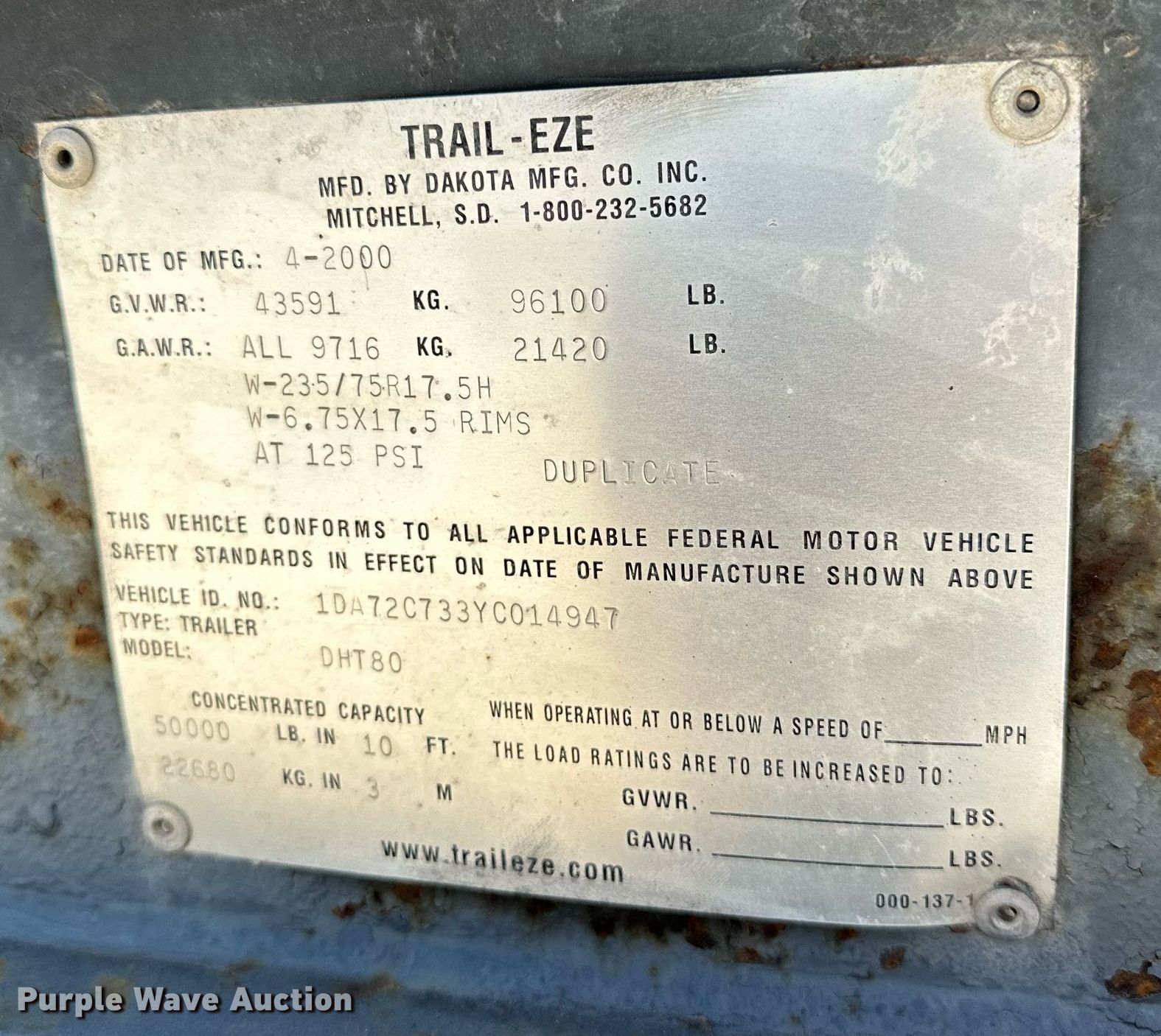 Purple Wave is selling a used Flat or Drop Deck Trailer in Arkansas. This item is a 2000 Dakota Trail-EZE drop deck equipment trailer with the following: VIN: 1DA72C733YC014947