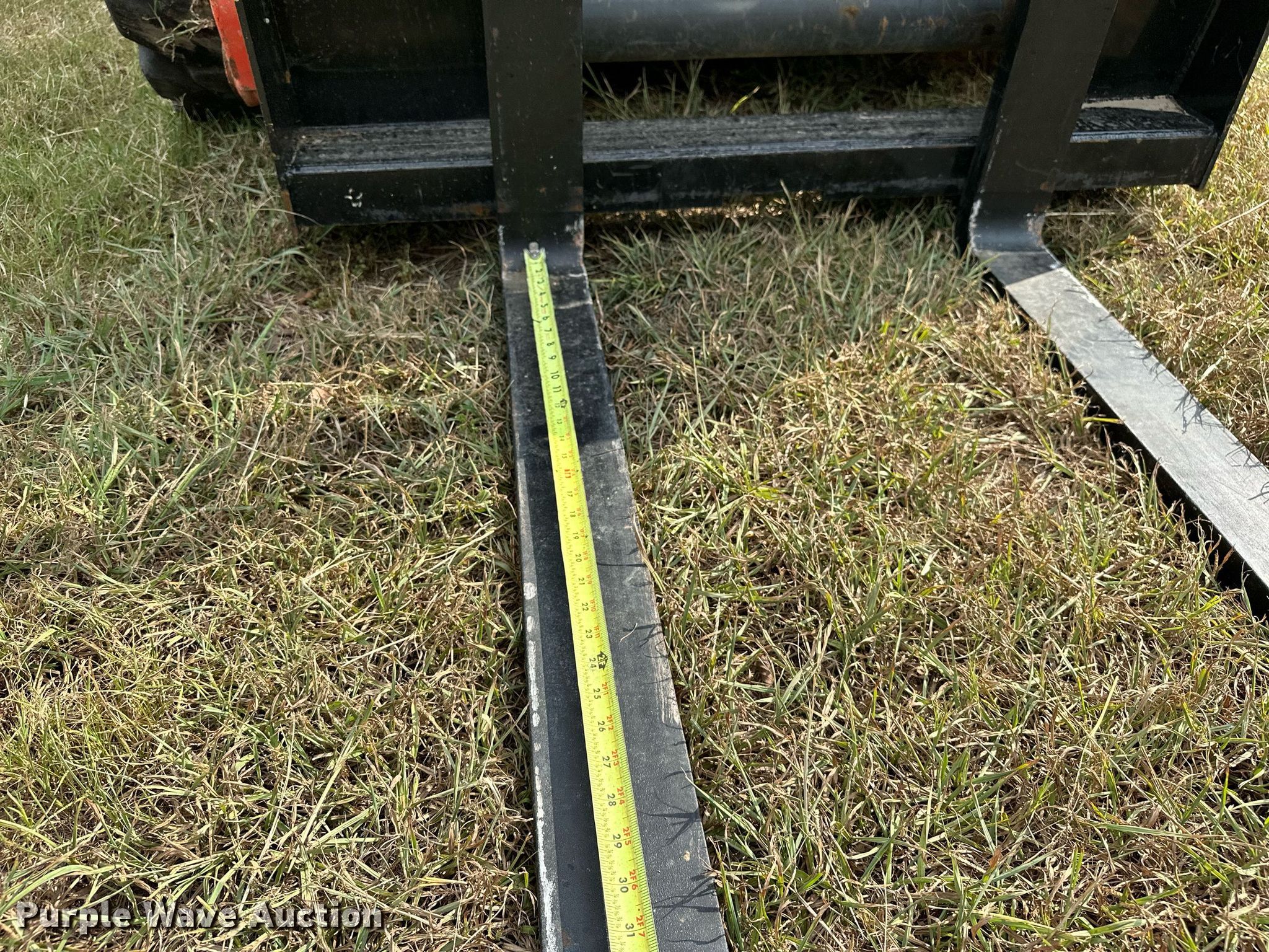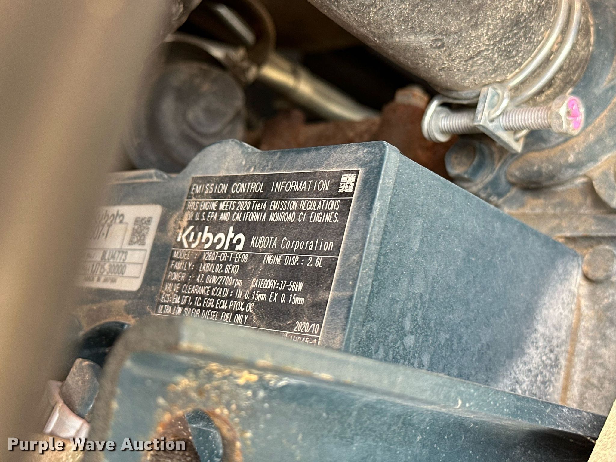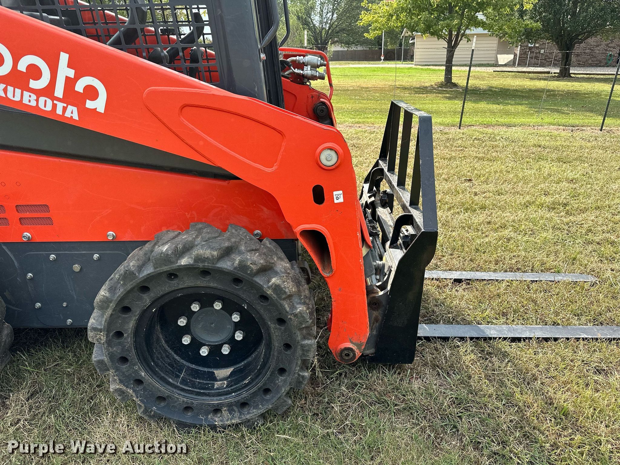 2021 Kubota SSV65 skid steer loader. Hours: 515 on meter, Serial: KBCZ131CCL3K53745. Engine Kubota V2607-CR-T-EF08, Serial: 8LU4773, Displacement: 2.6L, Cylinders: 4, Fuel type: Diesel. Transmission Hydrostatic, Two speed travel. Operators station OROPS, Bucket control: Hand. Features Auxiliary hydraulics, Quick coupler: Manual, Bucket Width: 72", Cutting edge: Weld-on, Teeth: Weld-on, Forks Length: 48". Tires Size: 30X10-16, Solid. 5300 Lamb Road. Alma, AR 72921