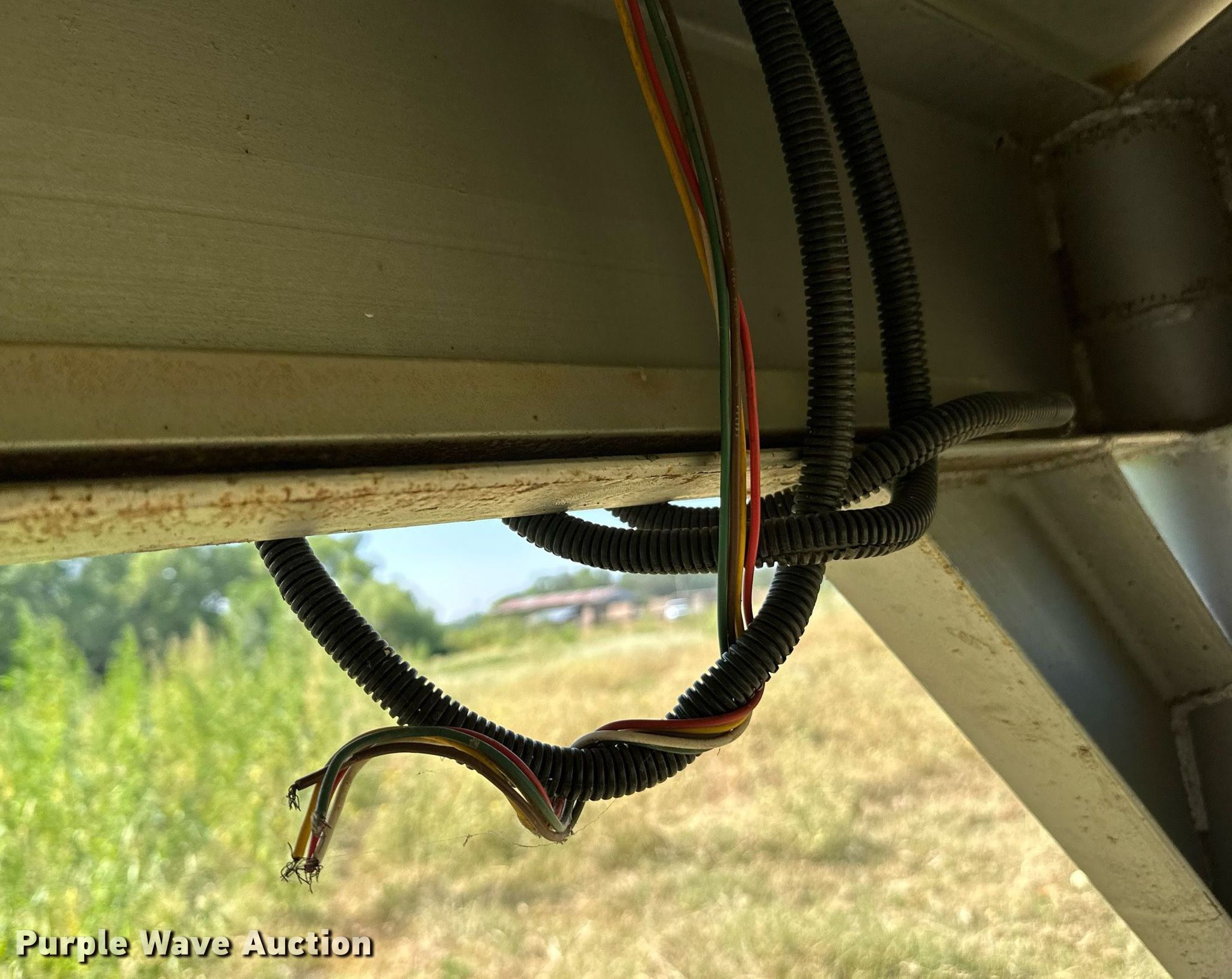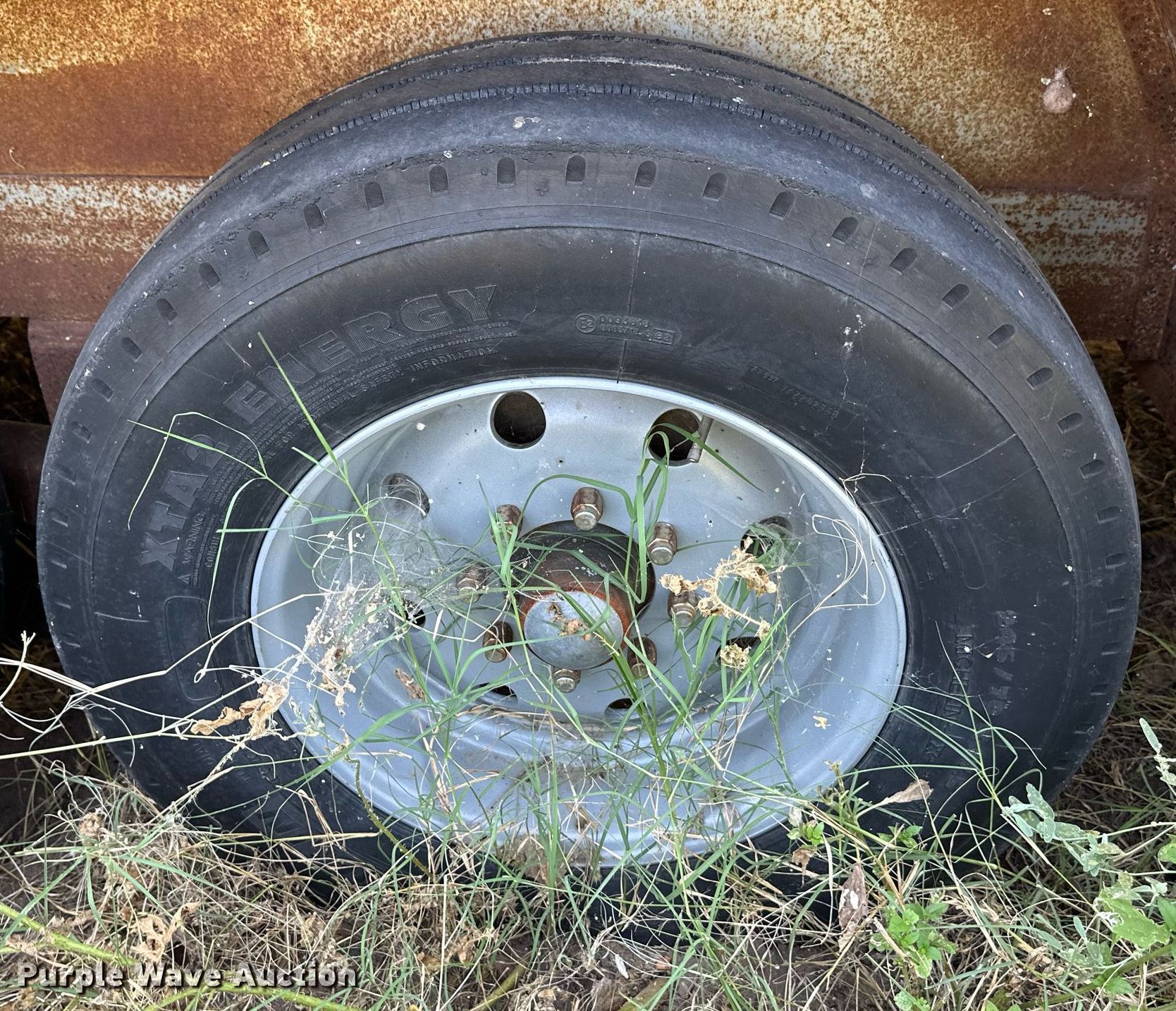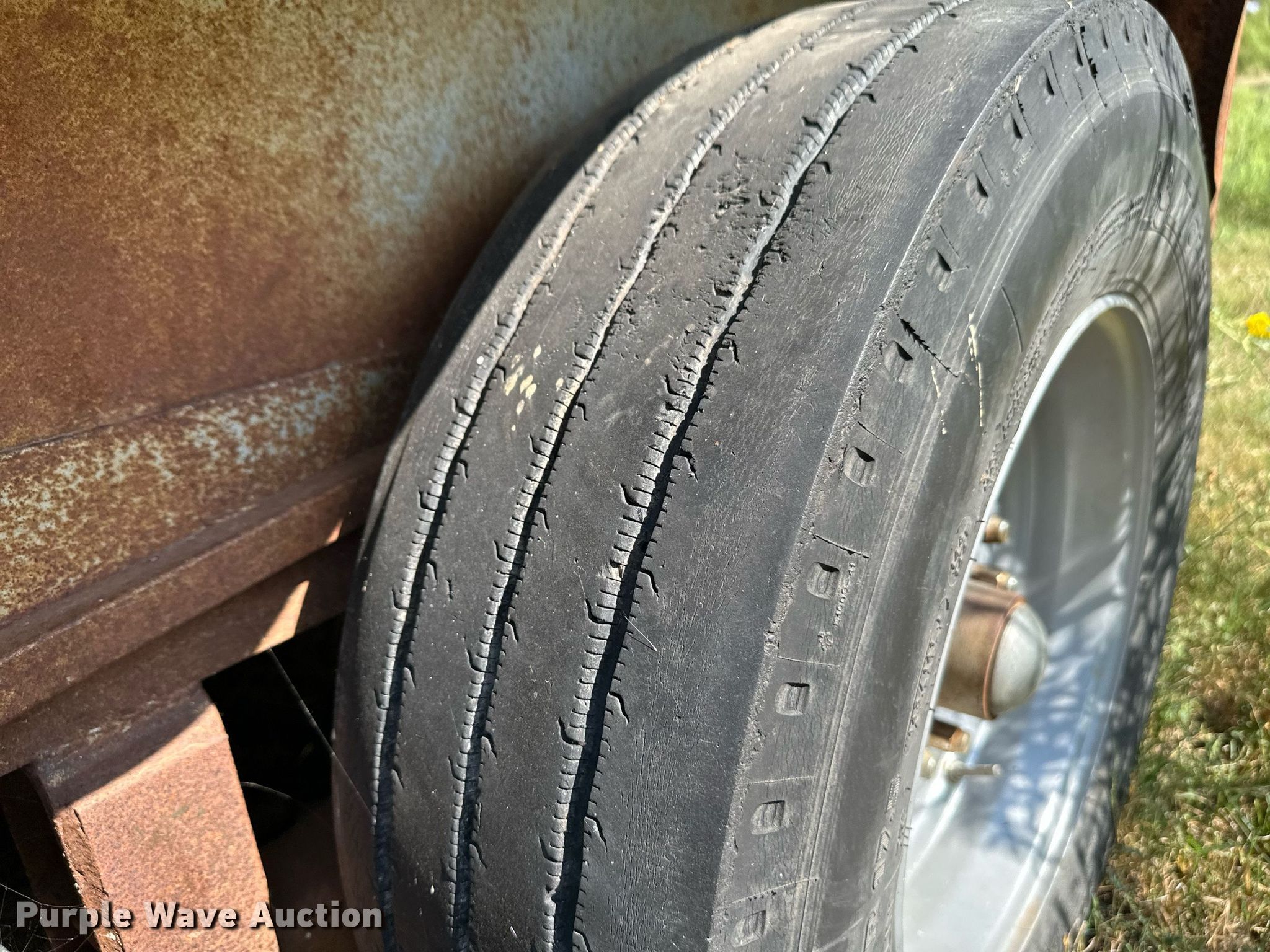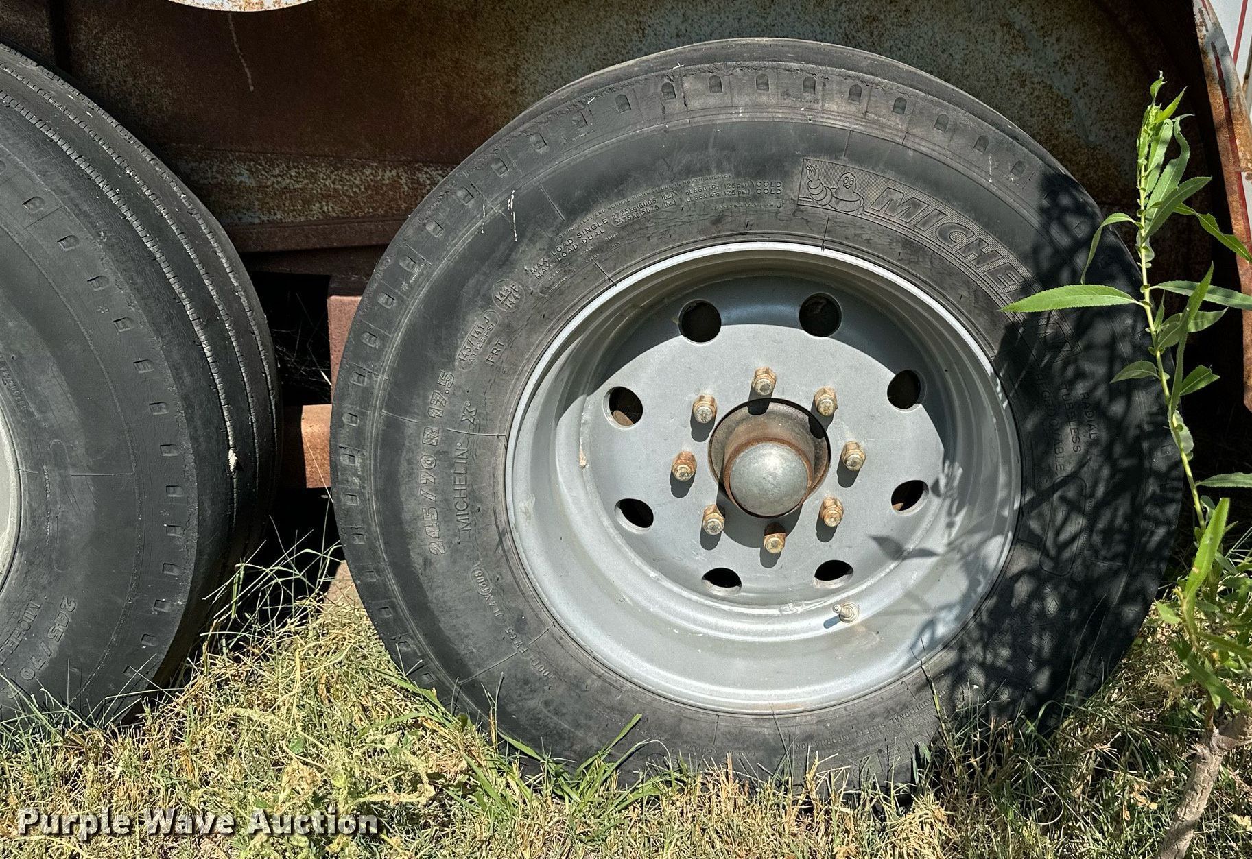 1988 Travalong livestock trailer. VIN: 138GS2023J1007296. Dimensions Overall: 27' 6" L x 102" W, Body: 20' L x 82" W. Features Center gates: 1. Chassis Hitch: Gooseneck, Landing gear: Single, Suspension: Spring, Brakes: Electric, Axles: Tandem, GVWR: 14,500 lbs, GAWR: 7,000 lbs. Tires Steel wheels, Size: 245/70R17.5. Notes Trailer wiring plug missing. Kingman, KS 67068