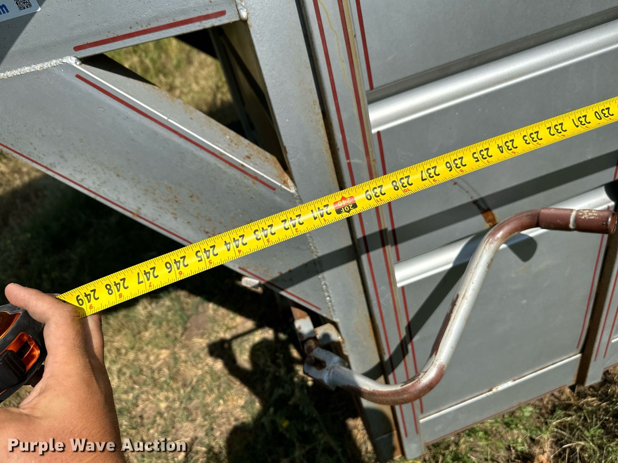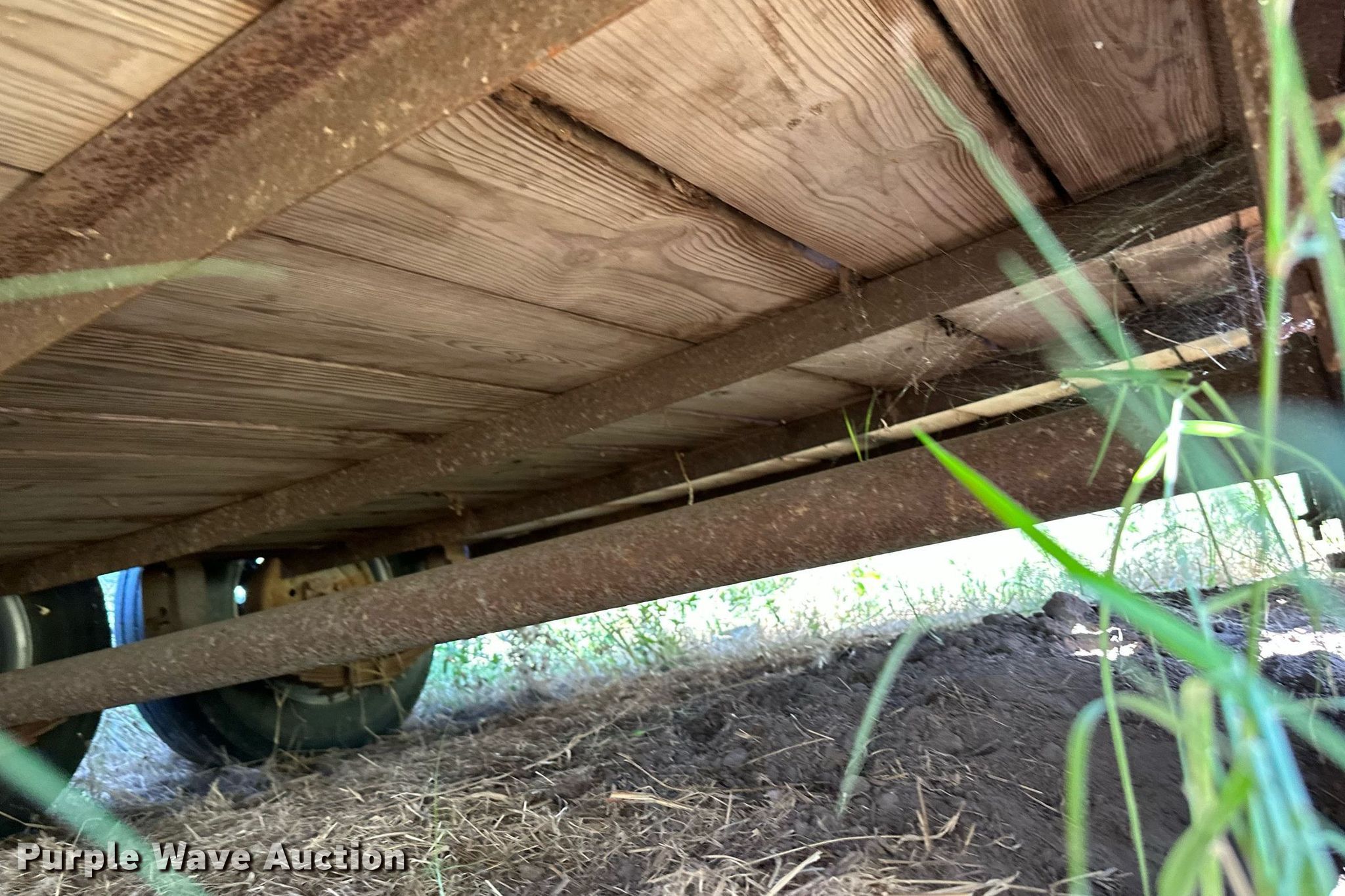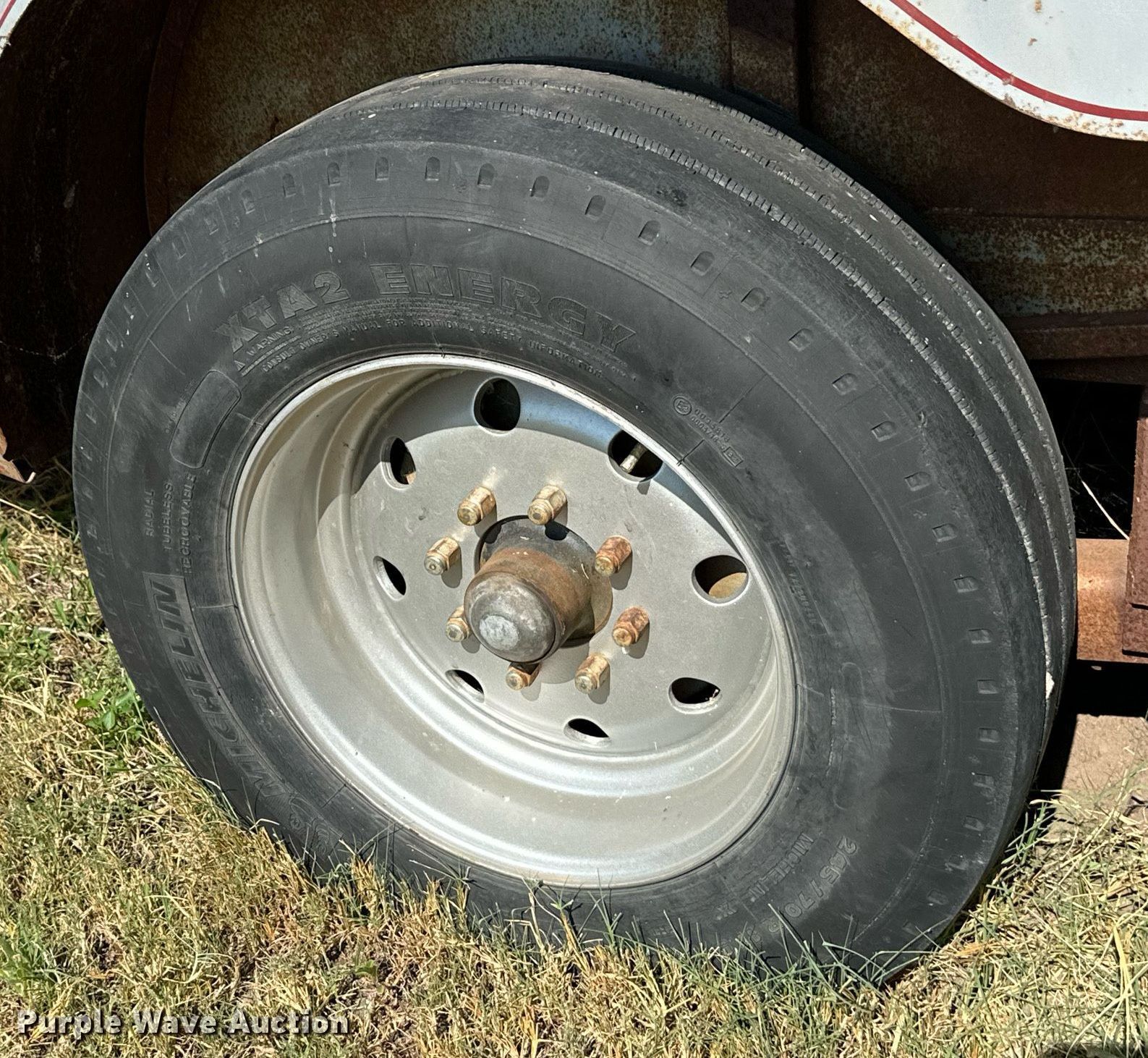 1988 Travalong livestock trailer. VIN: 138GS2023J1007296. Dimensions Overall: 27' 6" L x 102" W, Body: 20' L x 82" W. Features Center gates: 1. Chassis Hitch: Gooseneck, Landing gear: Single, Suspension: Spring, Brakes: Electric, Axles: Tandem, GVWR: 14,500 lbs, GAWR: 7,000 lbs. Tires Steel wheels, Size: 245/70R17.5. Notes Trailer wiring plug missing. Kingman, KS 67068
