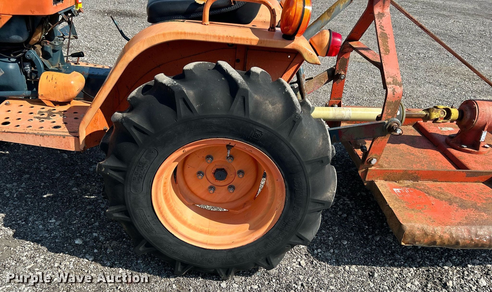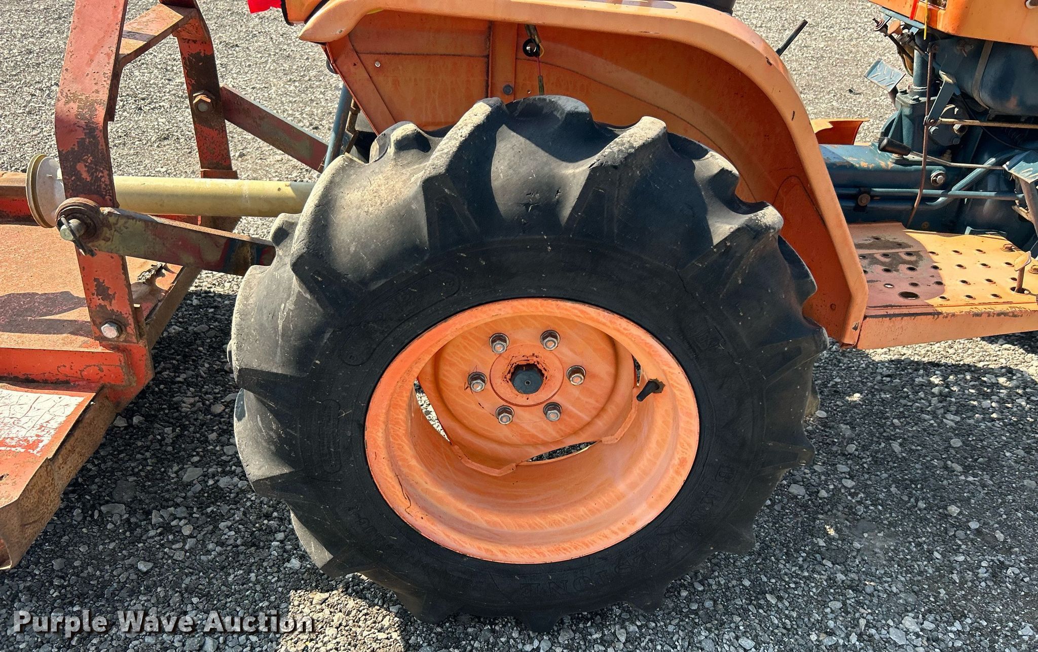 1984 Kubota B7200 MFWD tractor. Hours: 596 on meter, Serial: B7200D60162. Engine Kubota, Cylinders: 3, Fuel type: Diesel. Transmission Manual, 6F - 2R, Differential lock. Features PTO: 540, Three point Top link, Suitcase weights: 3, Rotary mower Width: 48". Tires Front: 6-12, Rear: 9.5-16. 15107 North 137th East Avenue. Collinsville, OK 74021