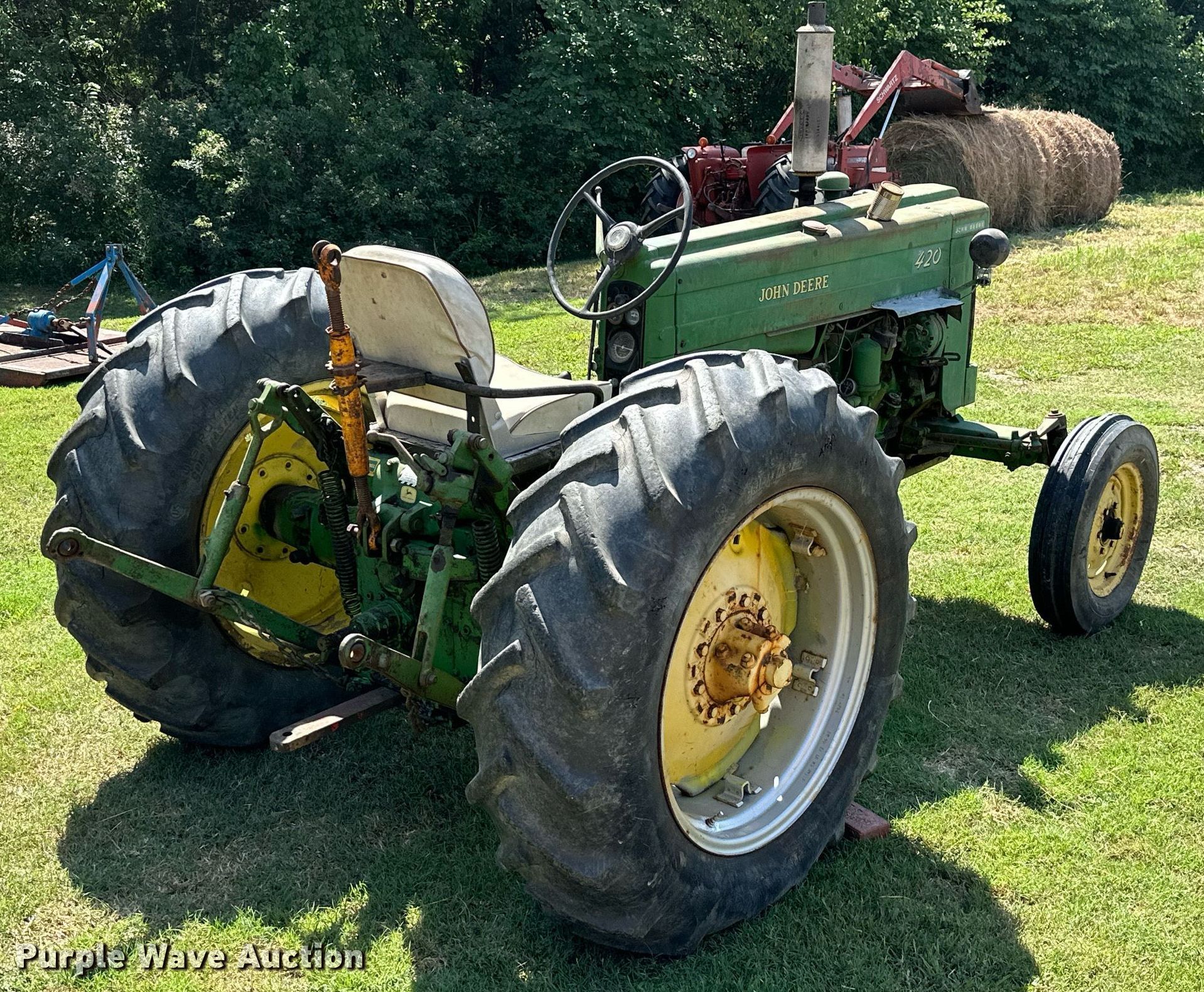 1958 John Deere 420 tractor. Hours: 931 on meter, Serial: 136803. Engine John Deere, Cylinders: 2, Fuel type: Gas. Transmission Manual, 5F - 1R. Features PTO: 540, Three point Top link. Tires Front: 6.00-16SL, Rear: 13.6-28. Notes Three point hydraulic leak. Dearing, KS 67340