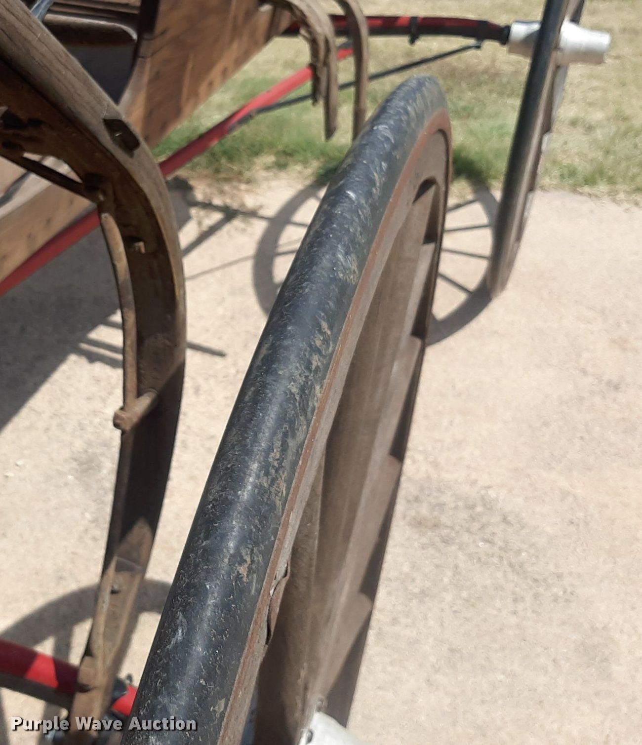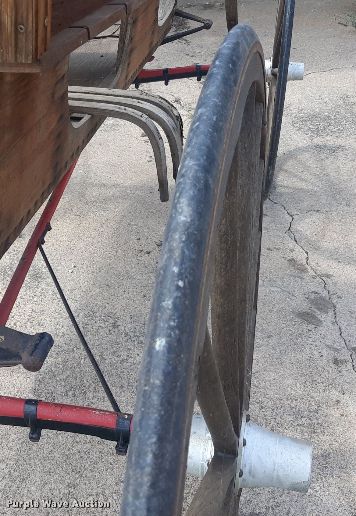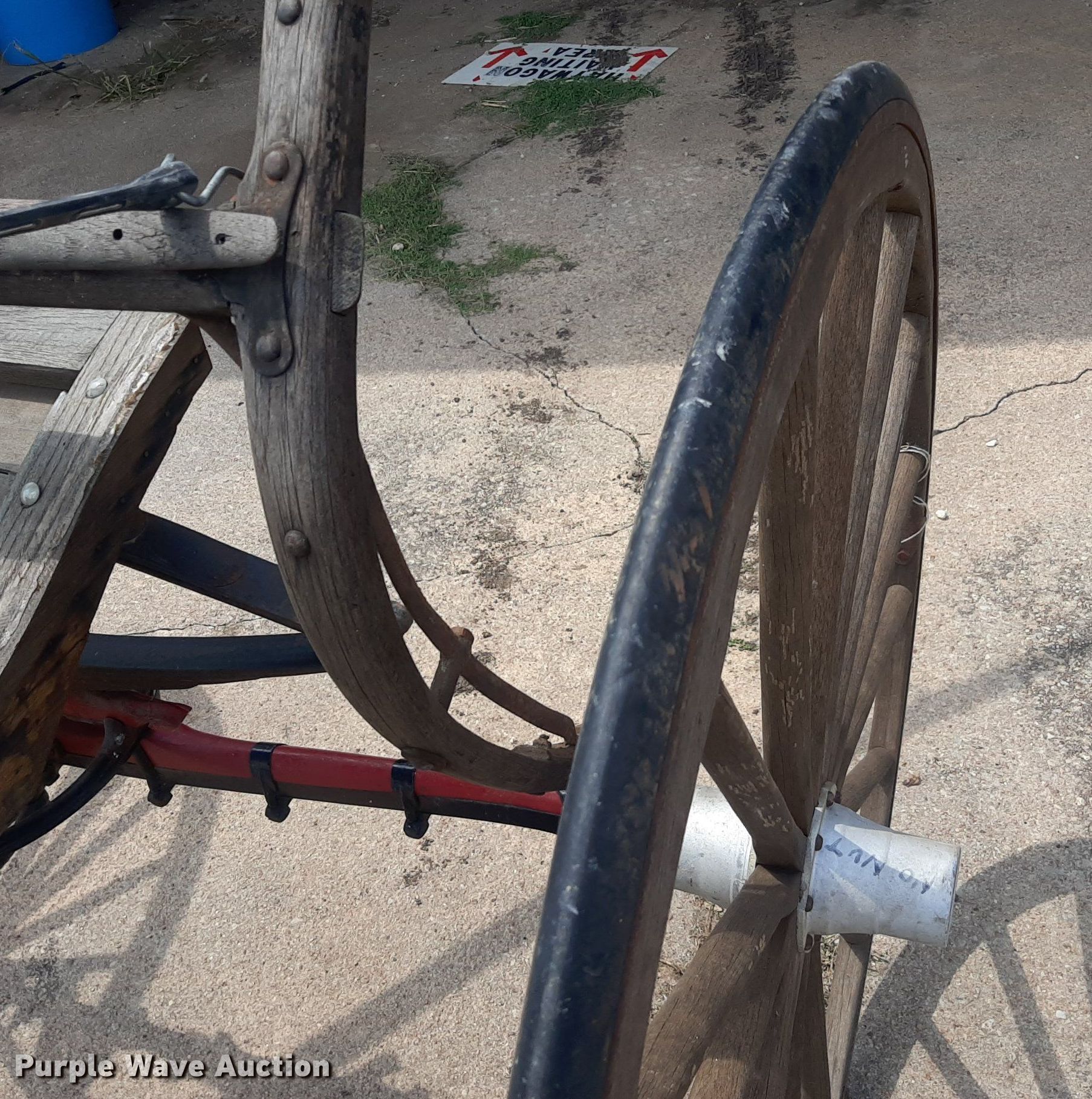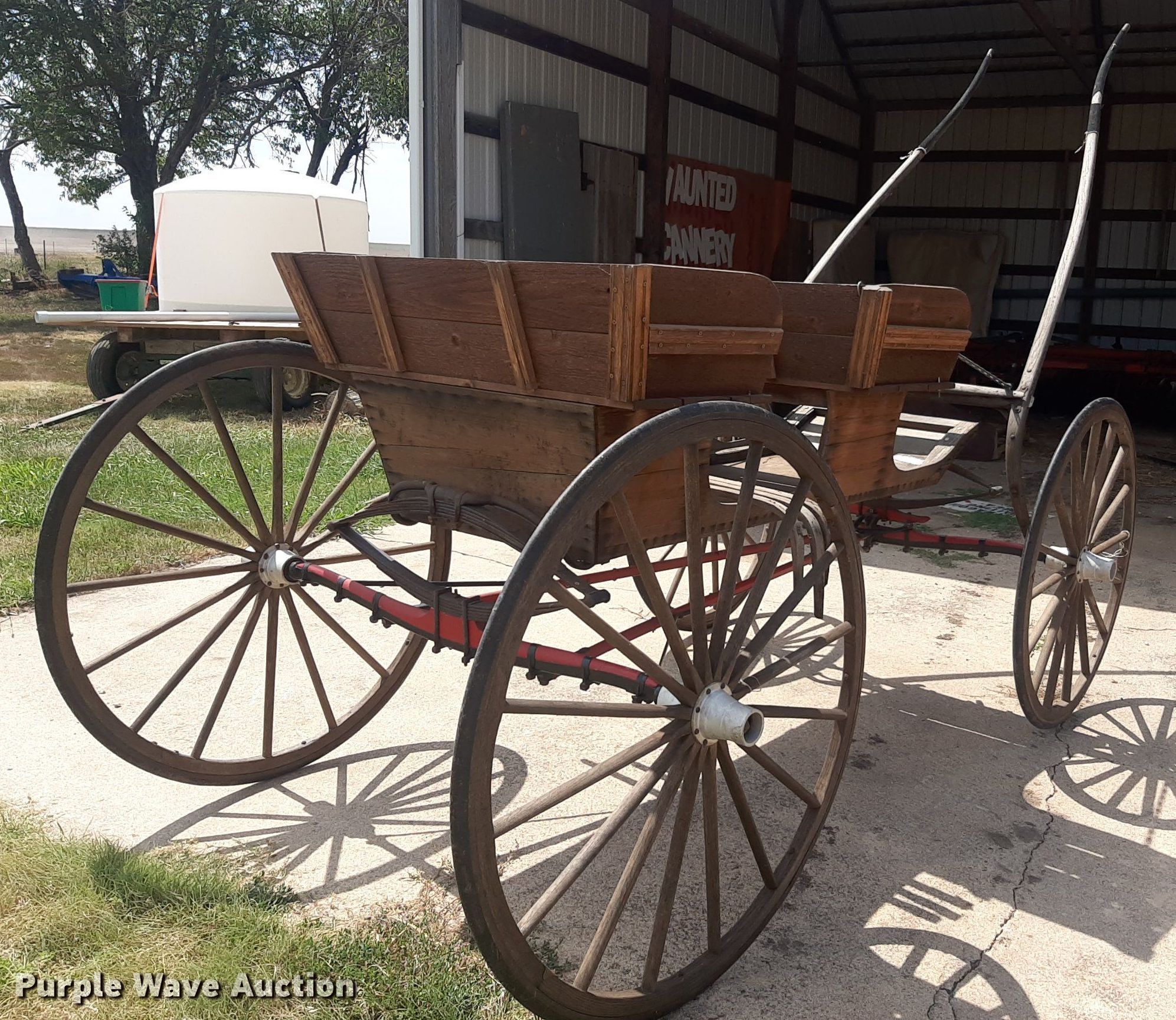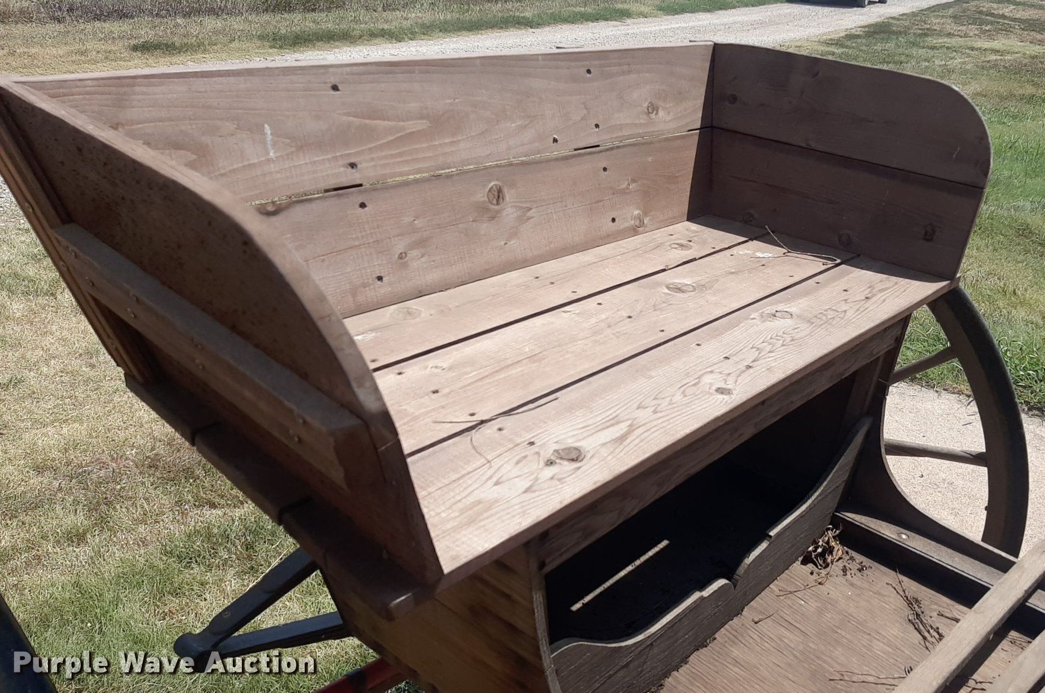 Purple Wave is selling a used Livestock Equip. in Kansas. This item is a Wooden wagon with the following: Approx. 10' L x 5' W, Wheels: 42"
