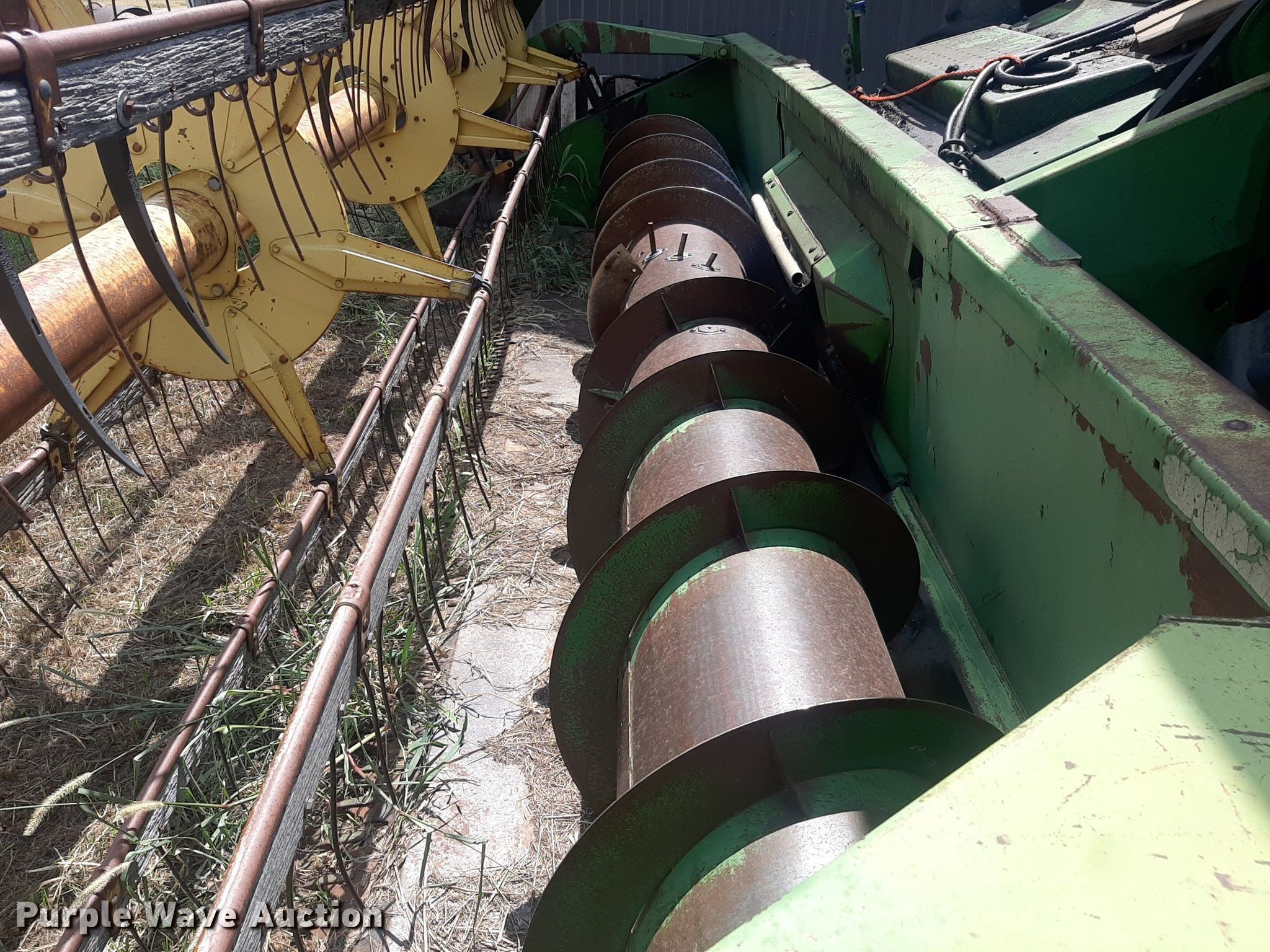 John Deere 4400 combine. Engine hours: 5,213 on meter, Serial: 152866H. Engine Cylinders: 6, Fuel type: Diesel. Transmission Manual, 4F - 1R. Interior AC, Heat. Features Straw chopper, Unloading auger length: 11' 4", Header John Deere, Serial: 218876, Row crop head Drivelines: Dual, Platform head Width: 16', Reel: Finger Hydraulic reel height control, Drivelines: Dual. Tires Front: 18.4-26, Rear: 10.00-16. Notes Dead battery, Non-operational unit. 10001 NW 77 Hwy. Burns, KS 66840