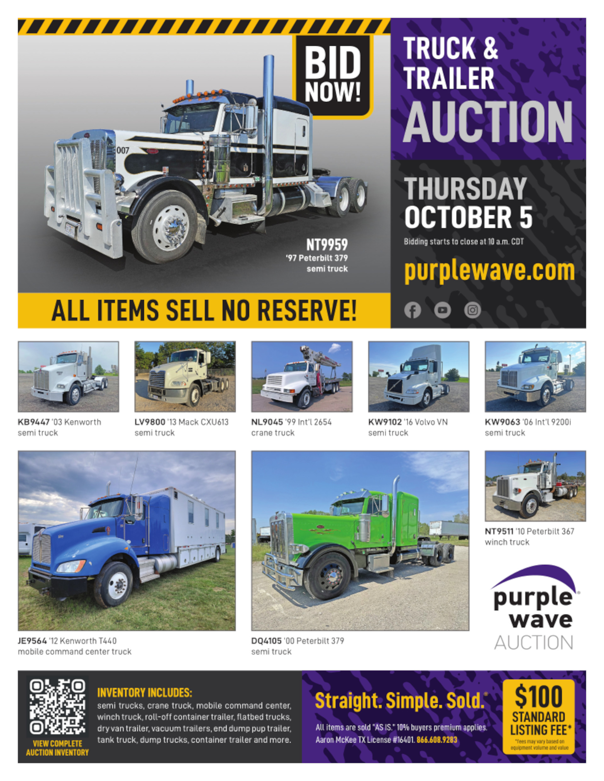 Purple Wave Shipping, LLC provides shipping and transportation services to winning bidders on ag, construction and fleet type assets. Purple Wave Shipping, LLC does not provide shipping on items weighing less than 1,000 pounds.