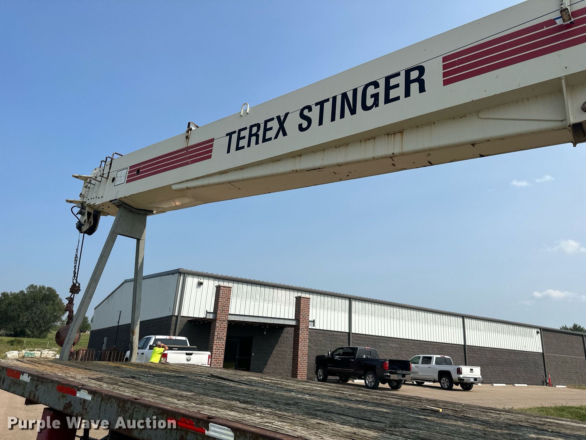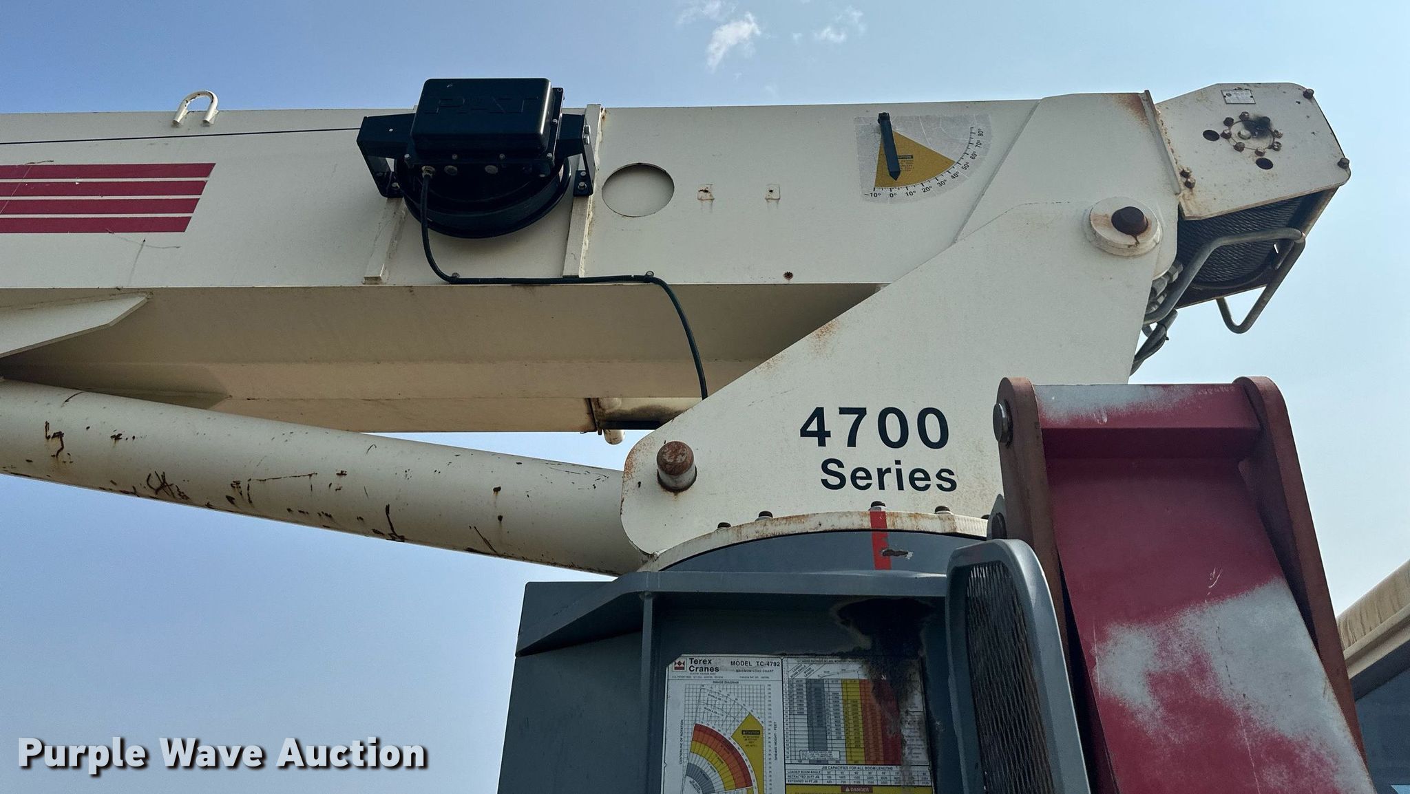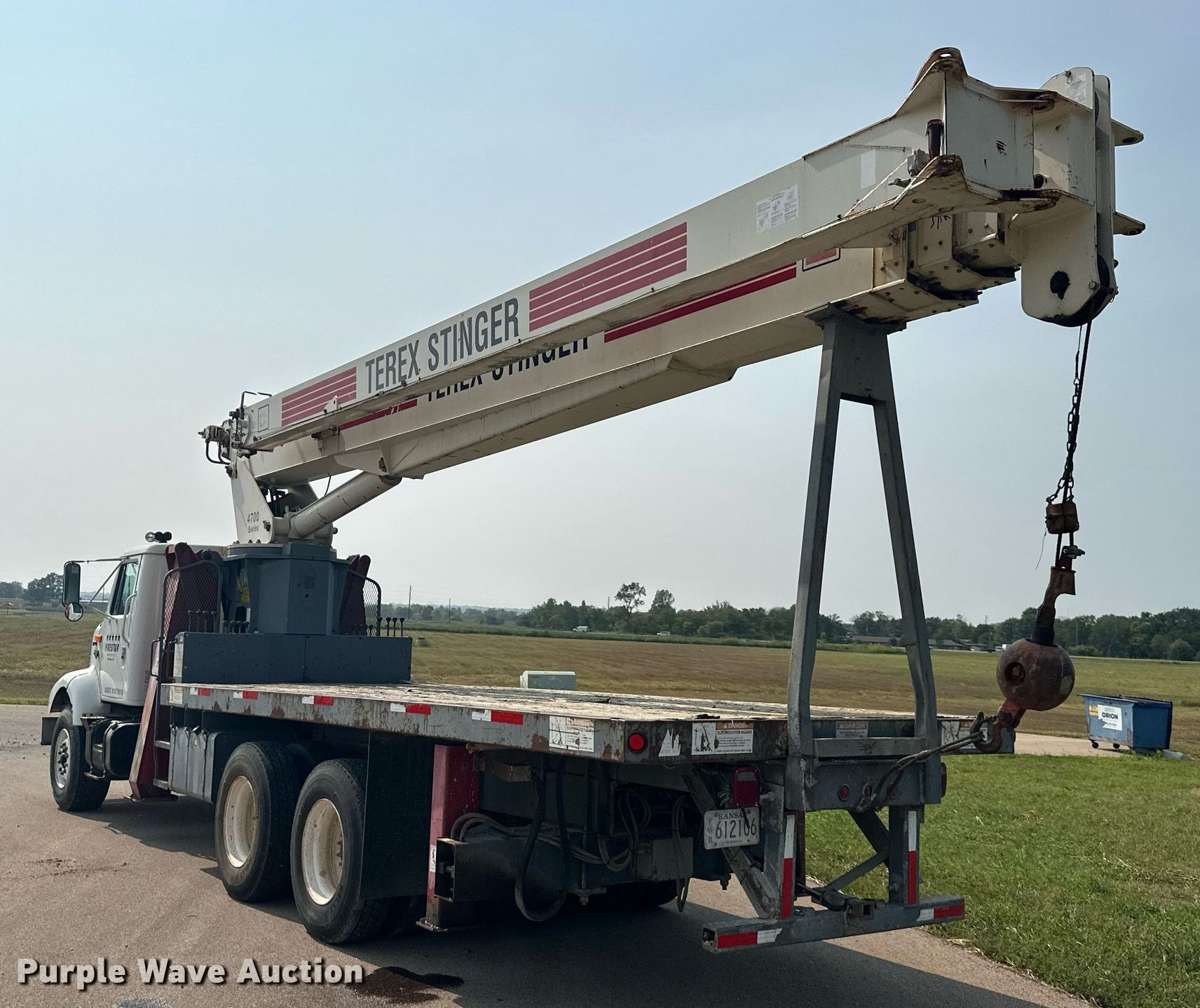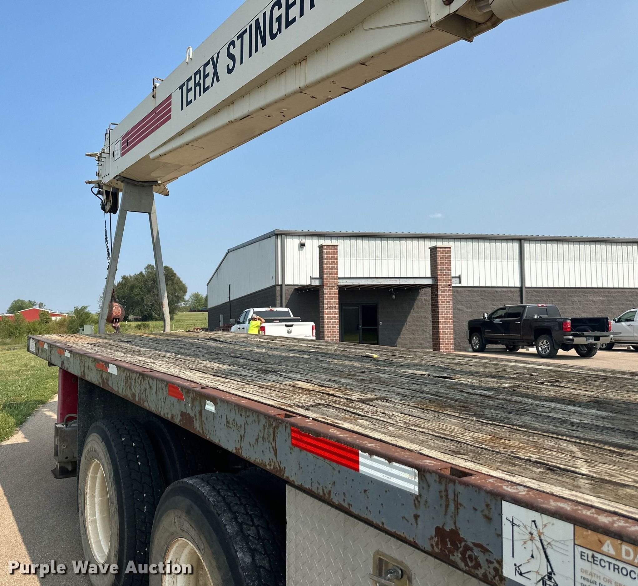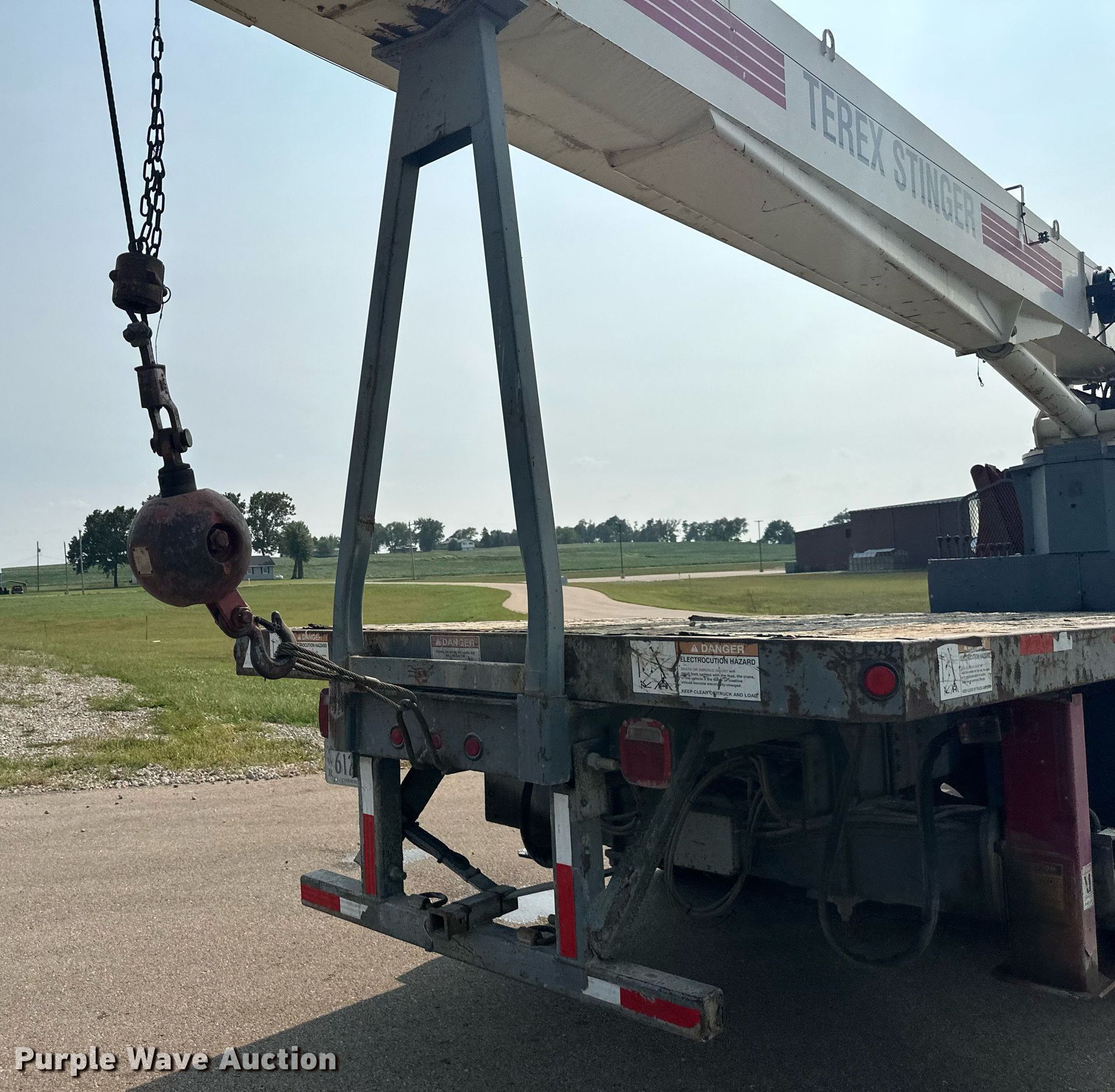 1999 International 2654 crane truck. Miles: 60,965 on odometer, Hours: 1,690 on meter, VIN: 1HTGHADT7XH602524. Engine International, Displacement: 8.7L L6, Cylinders: 6, Fuel type: Diesel. Transmission Spicer, Manual, Speed: 10. Chassis Axles: Tandem, Suspension: Spring over walking beam, Brakes: Air, PTO. Interior AC, Heat. Features Flatbed 21' L x 102" W, Crane Terex stinger TC4792 Serial: 4900798679, Boom Telescopic, Maximum boom length: 92' Maximum lift capacity: 47,000 lbs, Jib: 134', Boom controls Ground, Crane ball & hook. Tires Front: 385/65R22.5, Rear: 11R22.5. Kansas title. Five Star Masonry. Meriden, KS 66512