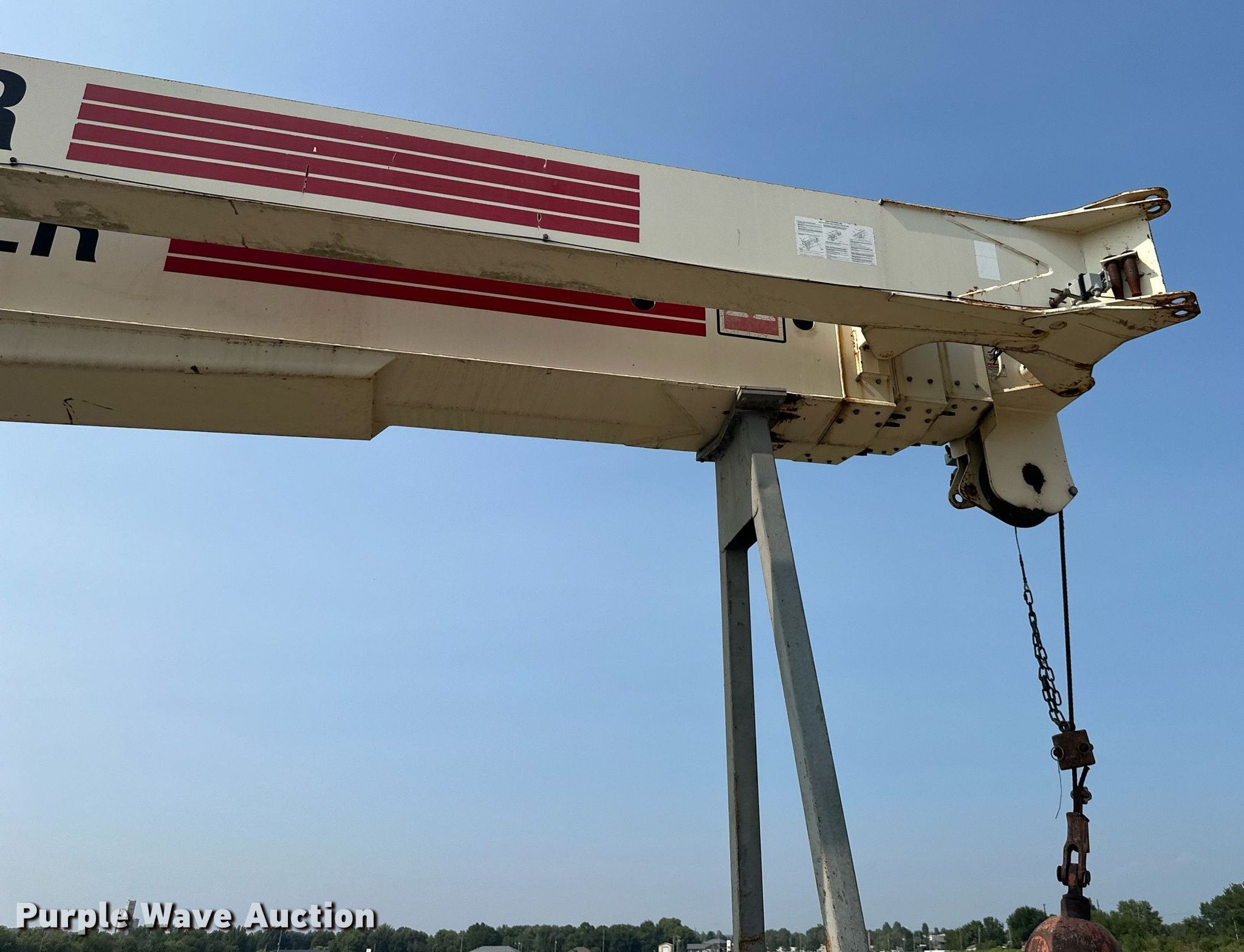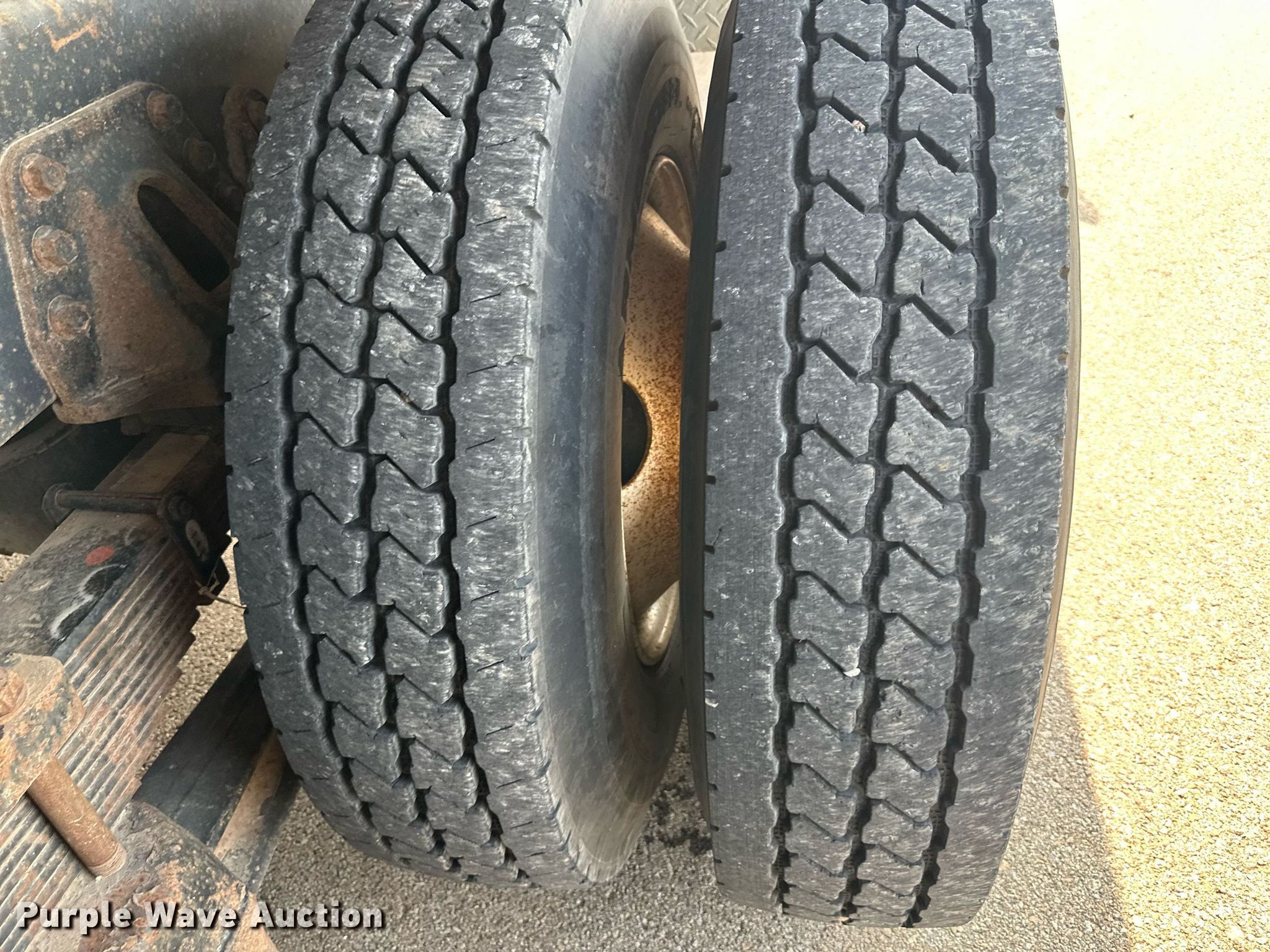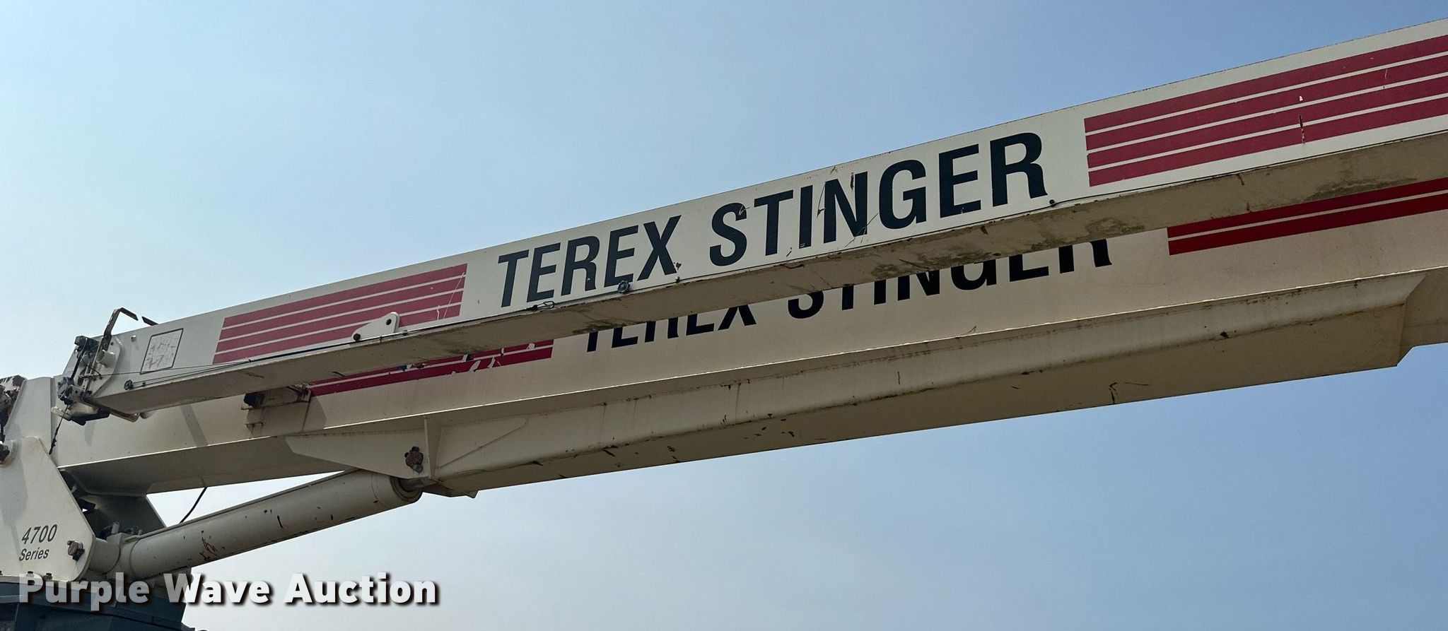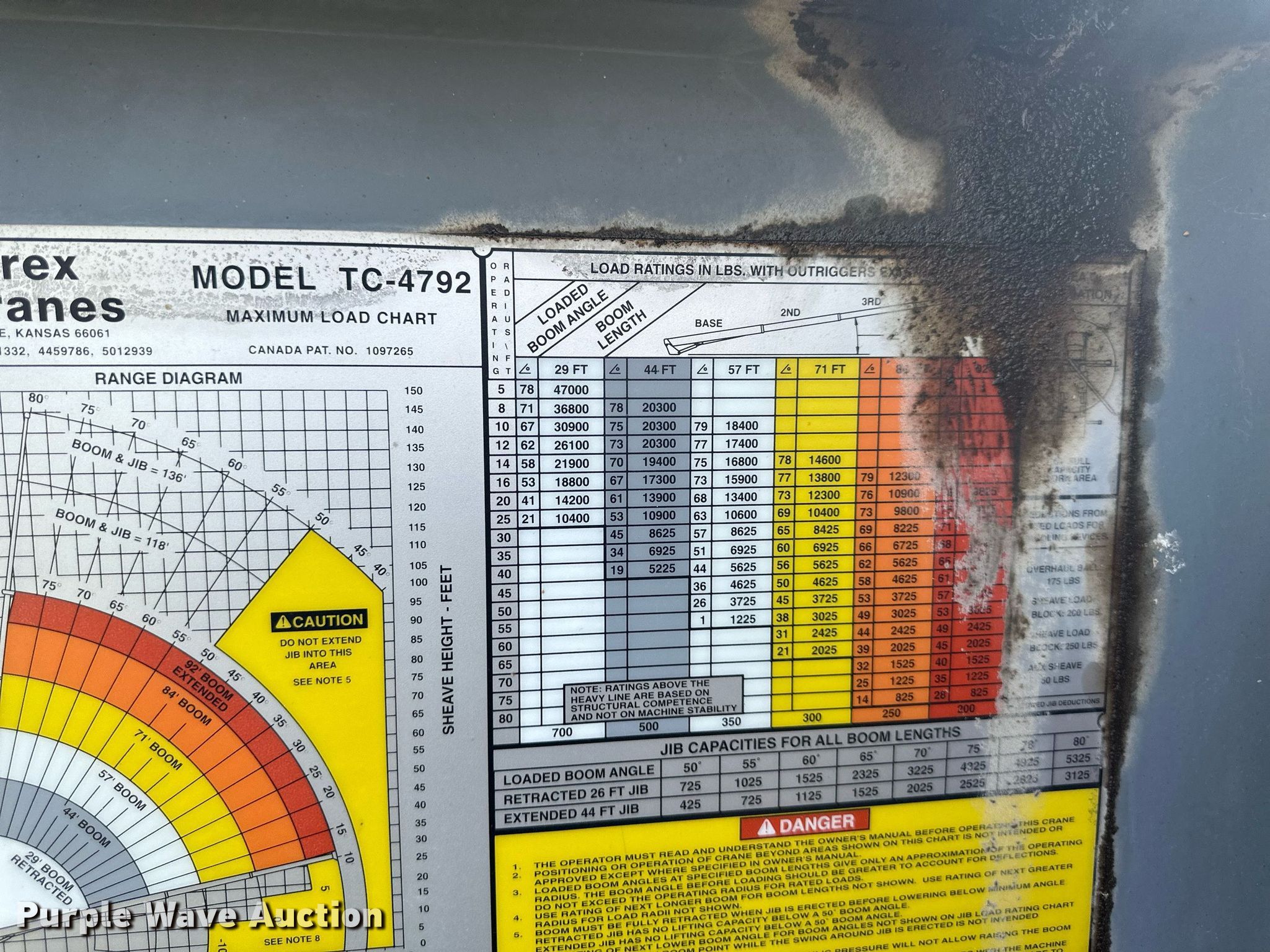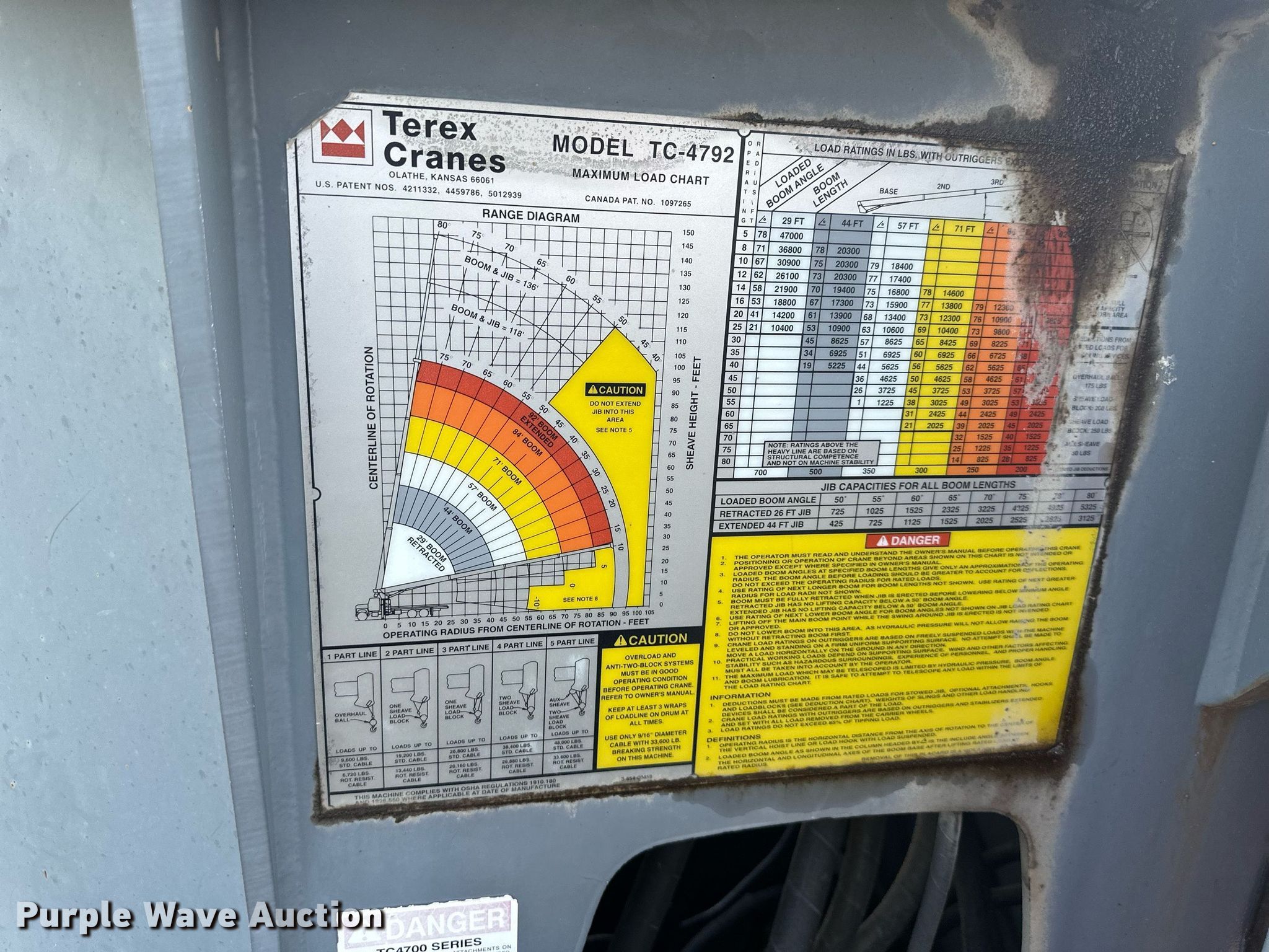 1999 International 2654 crane truck. Miles: 60,965 on odometer, Hours: 1,690 on meter, VIN: 1HTGHADT7XH602524. Engine International, Displacement: 8.7L L6, Cylinders: 6, Fuel type: Diesel. Transmission Spicer, Manual, Speed: 10. Chassis Axles: Tandem, Suspension: Spring over walking beam, Brakes: Air, PTO. Interior AC, Heat. Features Flatbed 21' L x 102" W, Crane Terex stinger TC4792 Serial: 4900798679, Boom Telescopic, Maximum boom length: 92' Maximum lift capacity: 47,000 lbs, Jib: 134', Boom controls Ground, Crane ball & hook. Tires Front: 385/65R22.5, Rear: 11R22.5. Kansas title. Five Star Masonry. Meriden, KS 66512