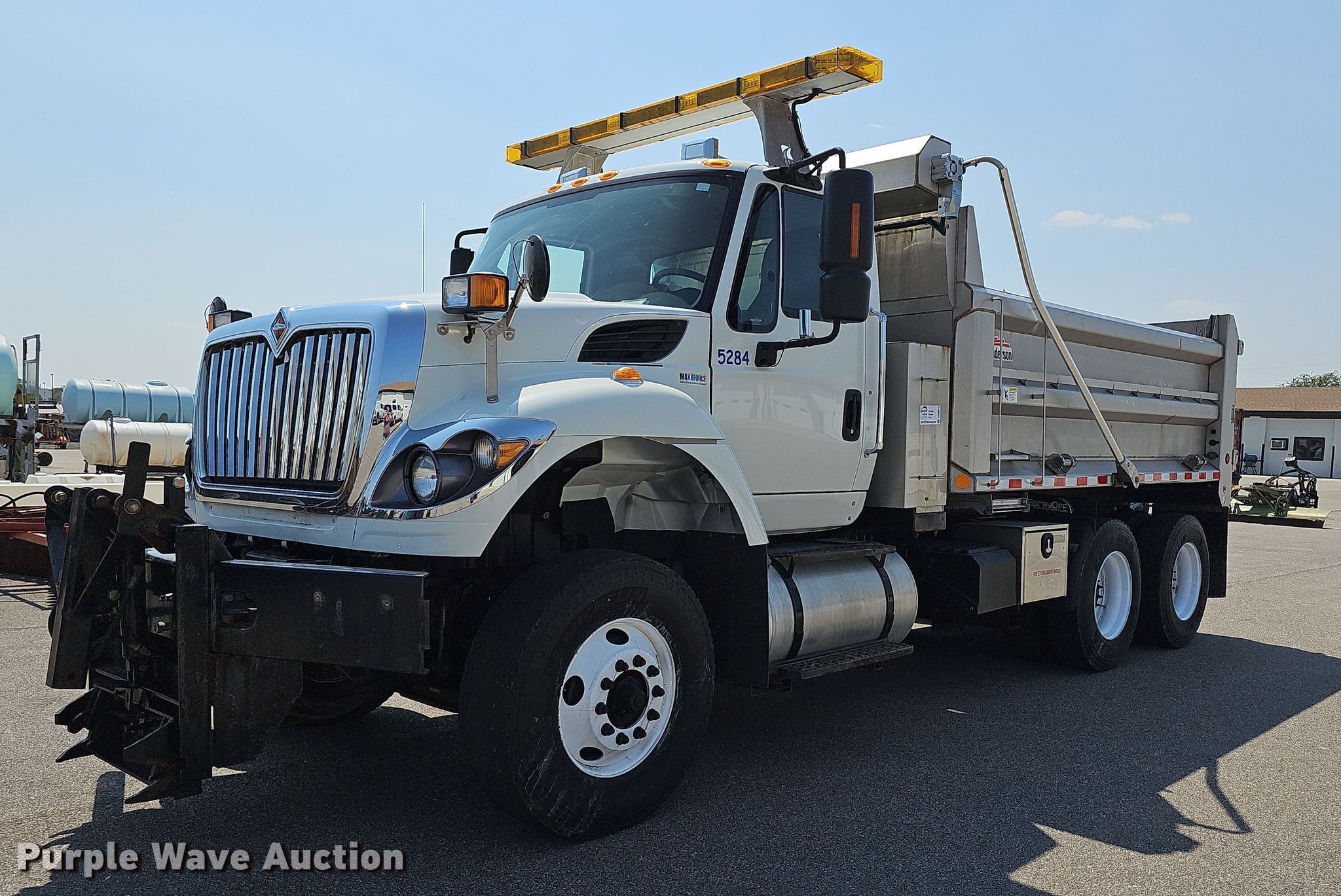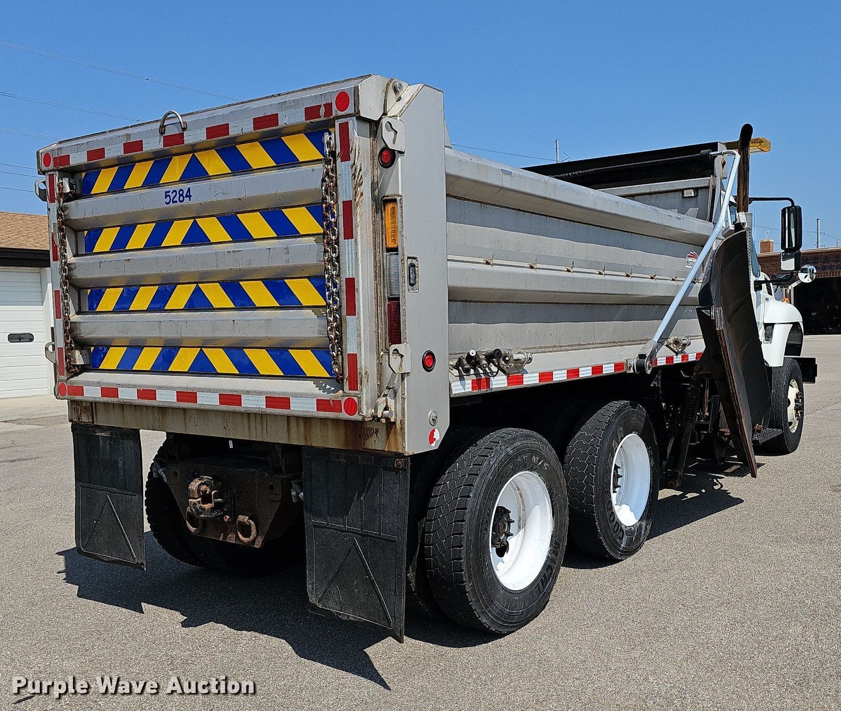 2015 International WorkStar 7500 dump truck. Miles: 46,352 on odometer, Hours: 2,811 on meter, Idle hours: 840, VIN: 3HAWPAZT0FL715649, Unit #: 5284. Engine International MaxxForce, Displacement: 9.3L, Cylinders: 6, Fuel type: Diesel. Transmission Allison, Automatic. Chassis Axles: Tandem, Differential lock: Inter-axle, Suspension: Spring over walking beam, Brakes: Air, Front mount PTO, GVWR: 56,000 lbs FAWR: 16,000 lbs, IAWR: 20,000 lbs, RAWR: 20,000 lbs, Wheelbase: 202". Interior AC, Heat, Heated mirrors, Power windows, Cruise control. Features Dump bed Henderson, 14' L x 8' W, Side height: 36", Bed type: Steel, Roll tarp, Ram: Single, End gate: Air operated, Wing plow Width: 96". Tires Size: 315/80R22.5, Brand: Michelin. Notes Dash warning indicator: Check engine Error codes: SPN3251 FMI21. Kansas title. Kansas Turnpike Authority. 3939 SW Topeka Blvd. Topeka, KS 66609
