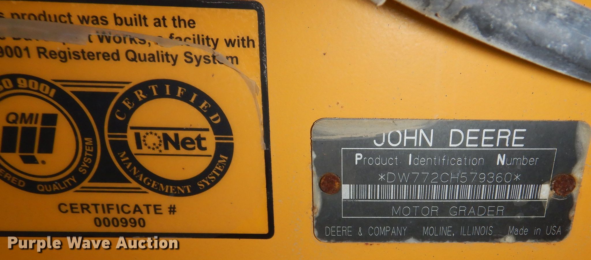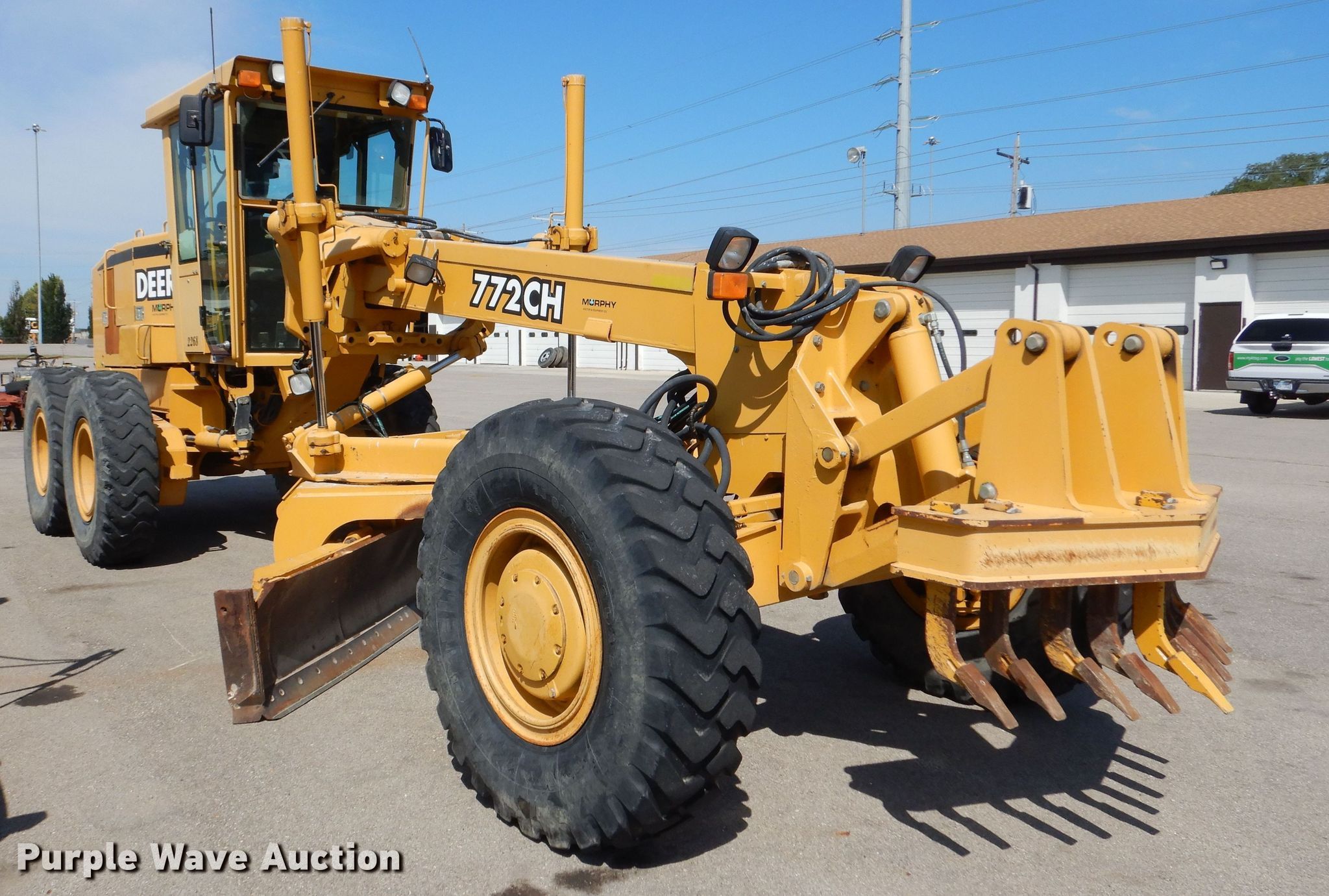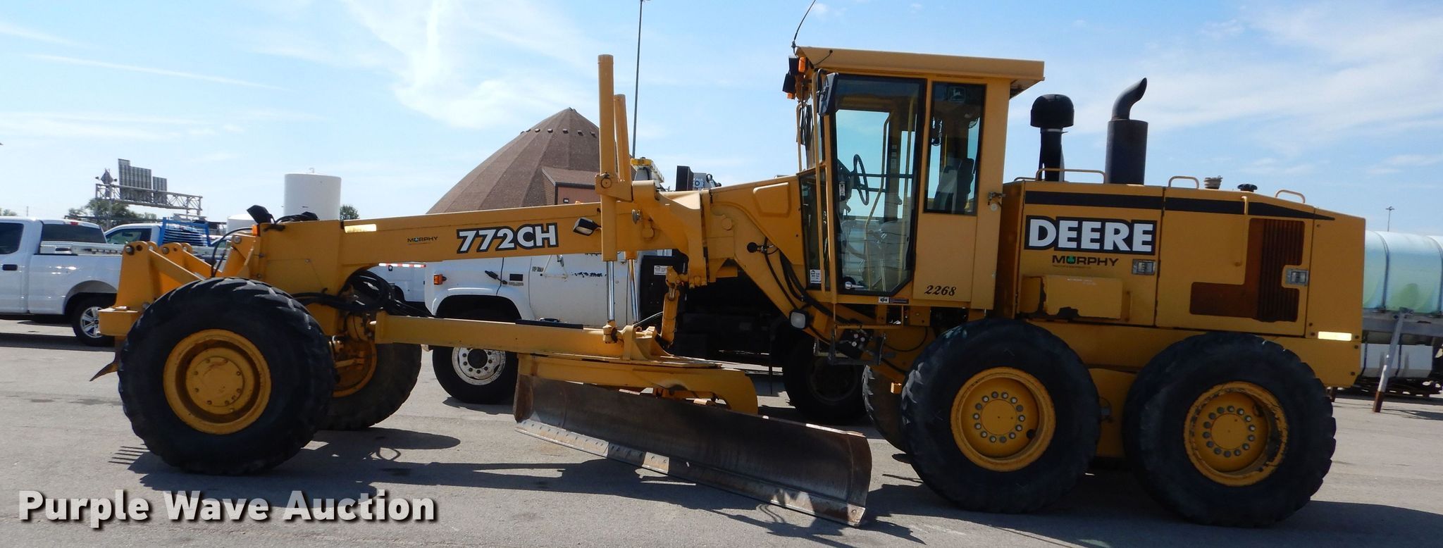 Purple Wave is selling a used Motor Grader in Kansas. This item is a 2001 John Deere 772CH motor grader with the following: Hours: 1,404 on meter, Serial: DW772CH579360, Unit #: 2268