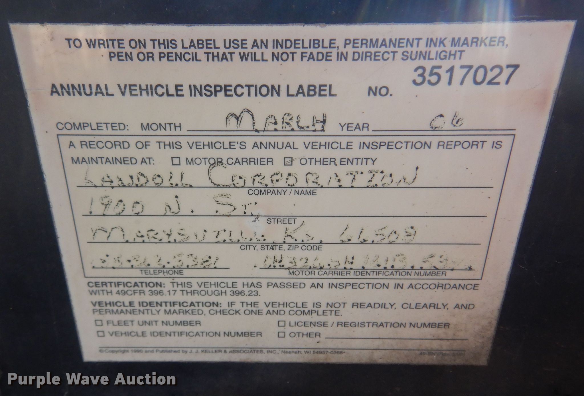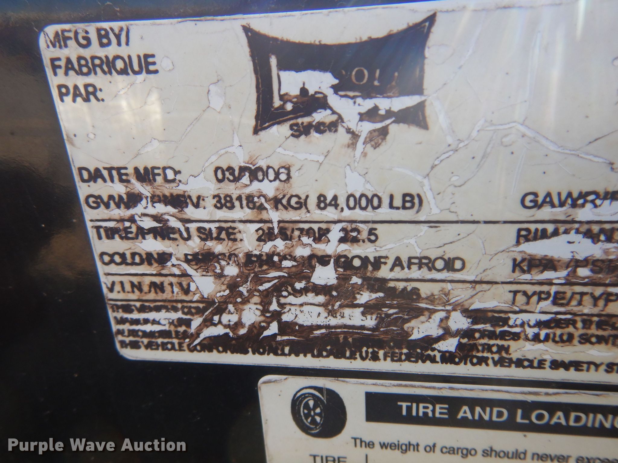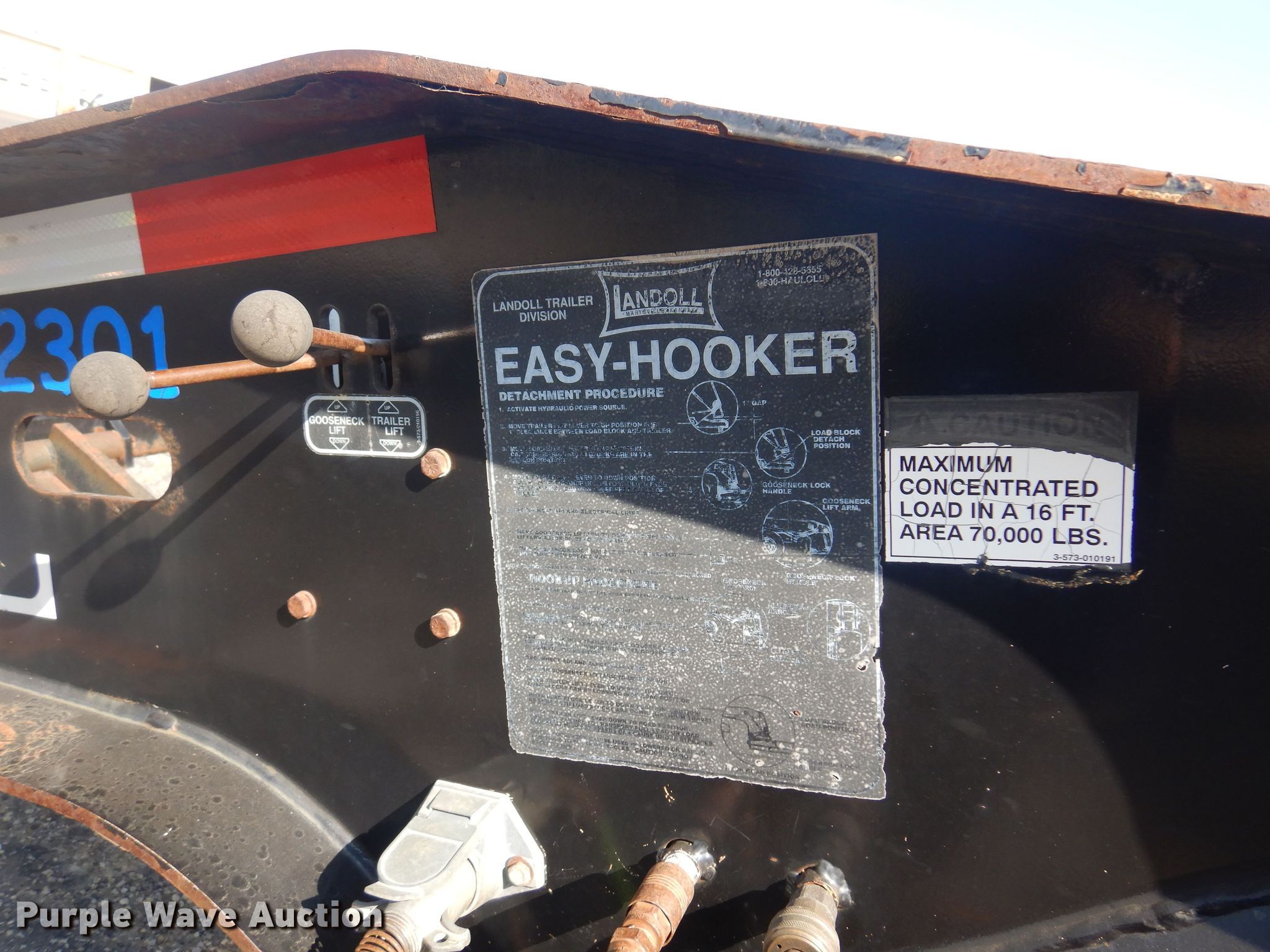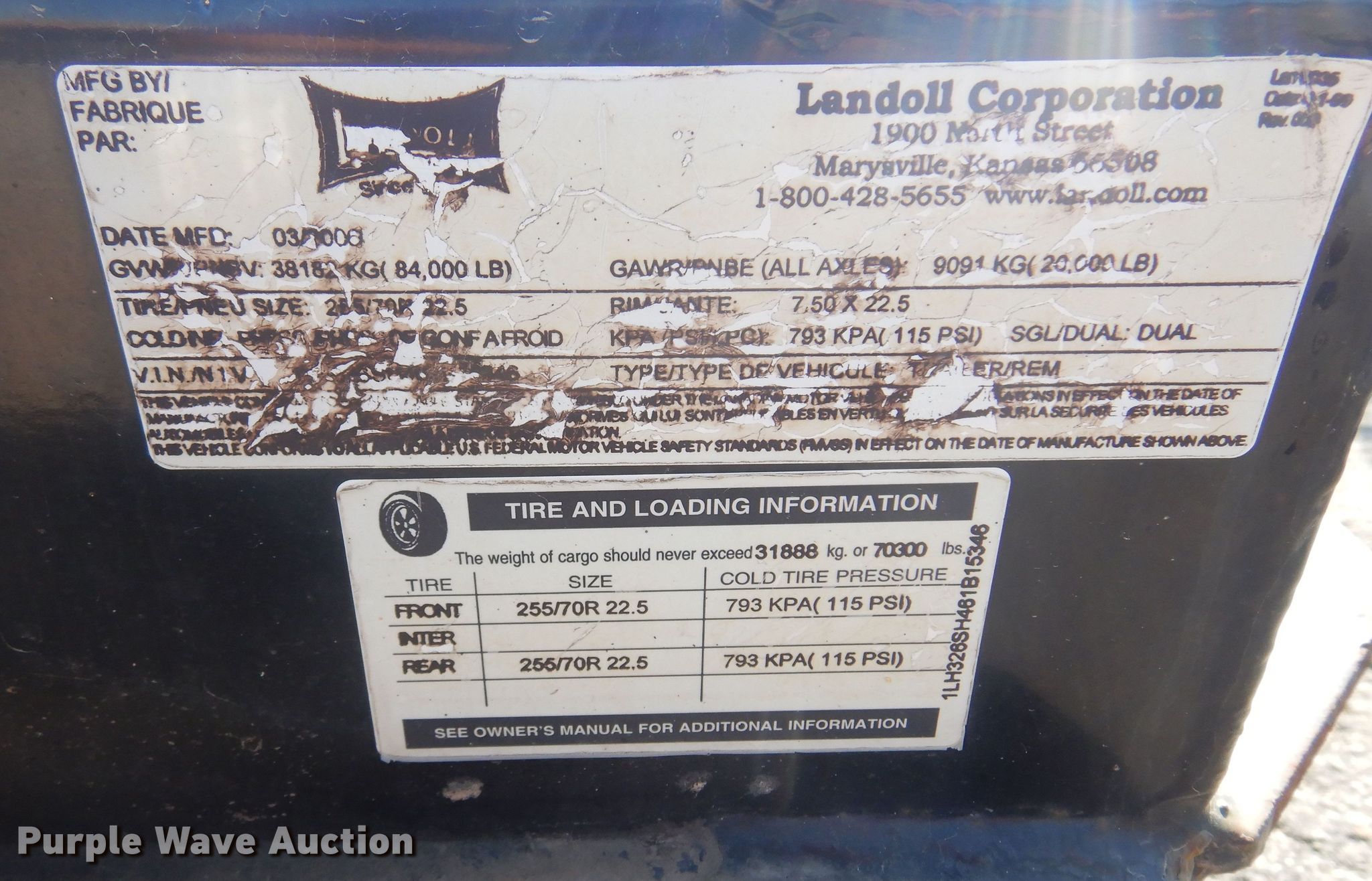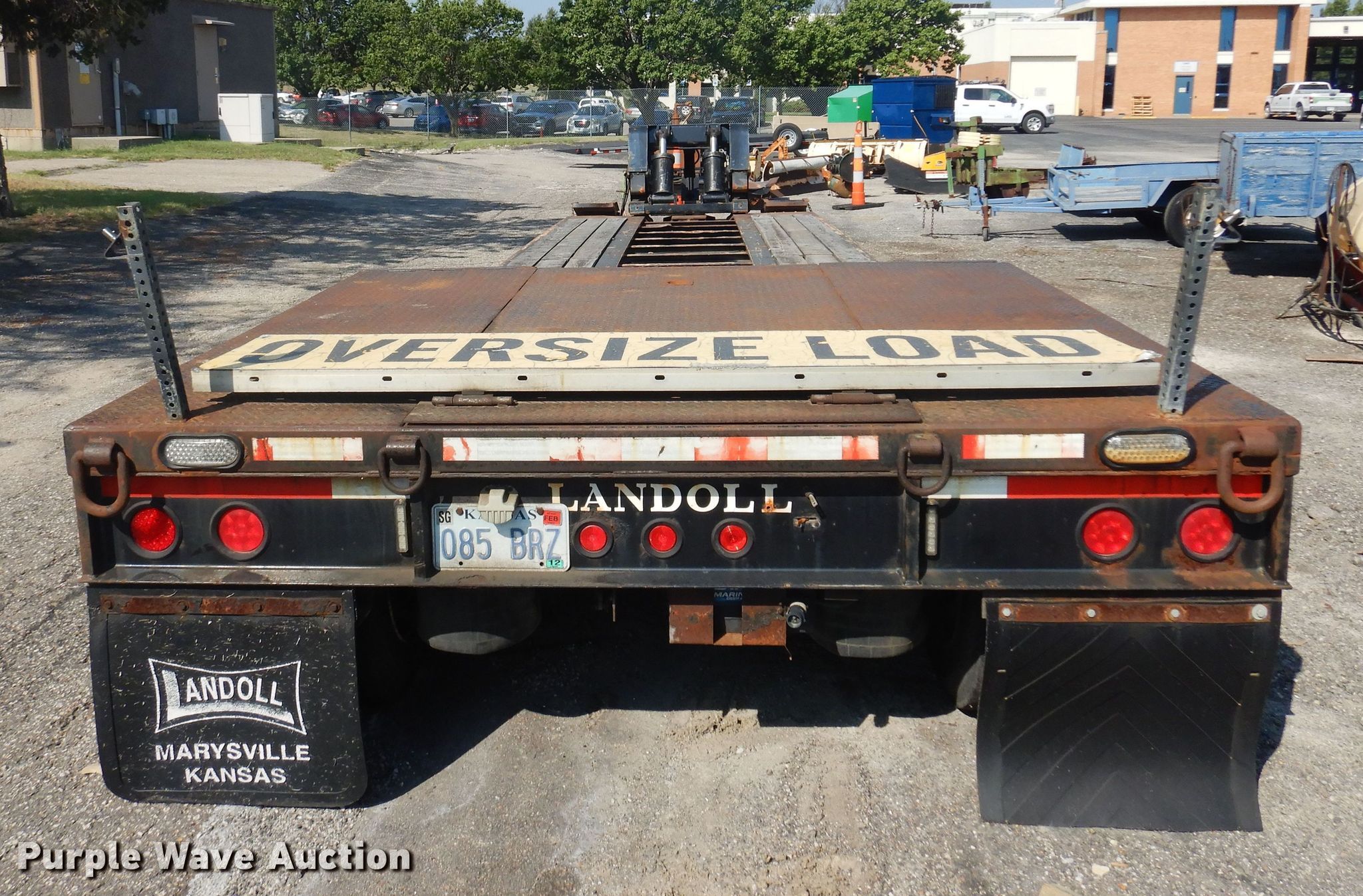 2006 Landoll lowboy equipment trailer. VIN: 1LH326SH461B15346. Dimensions Overall: 43' 10" L x 103" W, Deck: 27' 2" L x 103" W, Rear deck length: 7' 8". Features Deck type: Steel, Outriggers: Swing-out Board size: 12", Neck type: Detachable. Chassis Suspension: Air, Brakes: Air, Axles: Tandem, GVWR: 84,000 lbs. Tires Steel wheels, Size: 255/70R22.5. Kansas title. Title distribution may be delayed up to 30 days from verification of funds. Kansas Turnpike Authority. 9401 East Kellogg Drive. Wichita, KS 67207