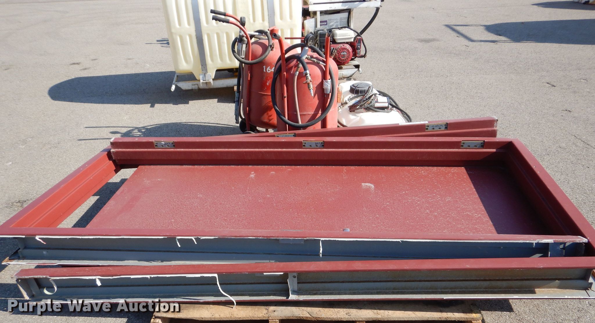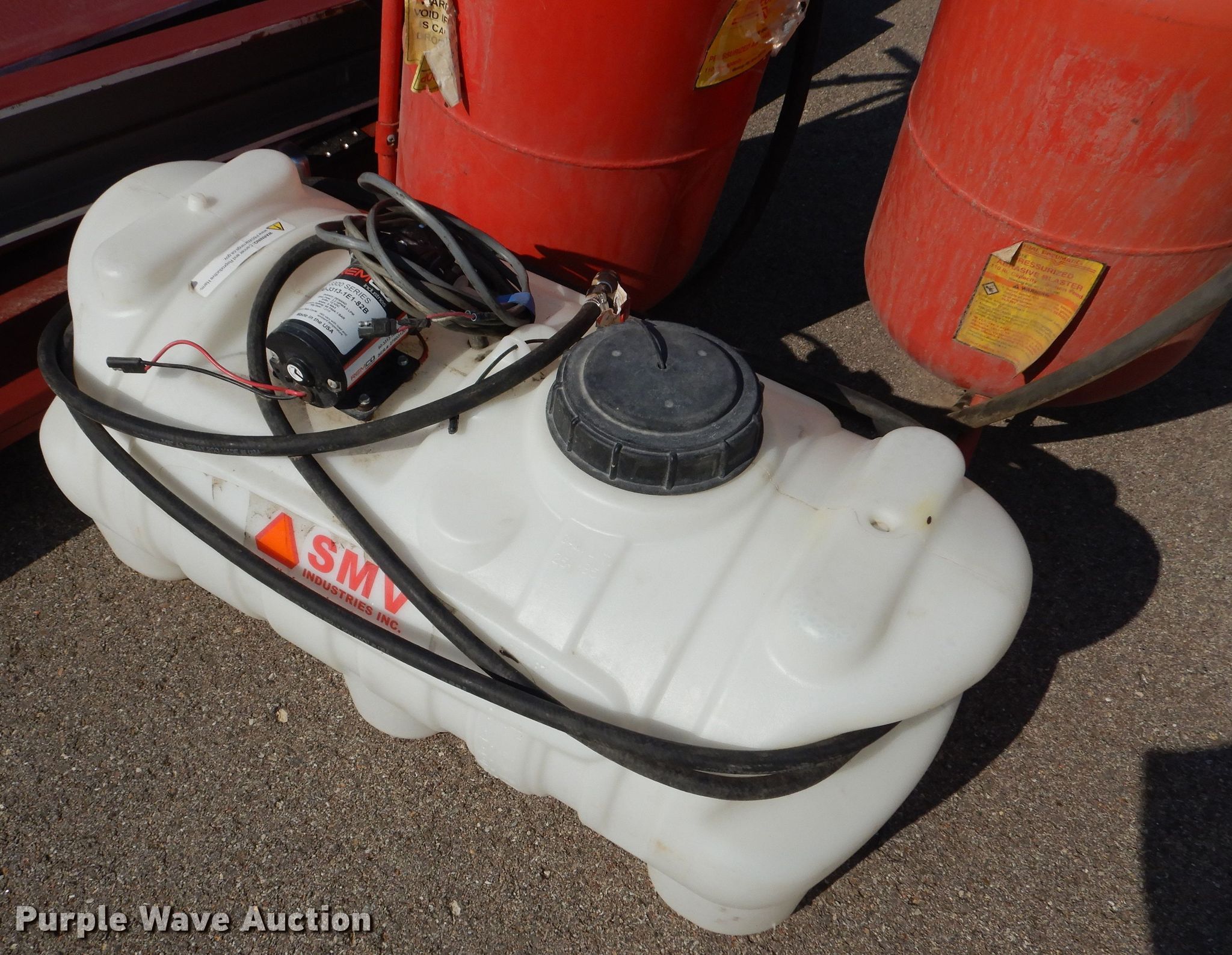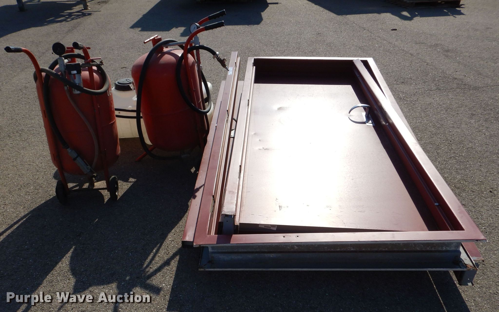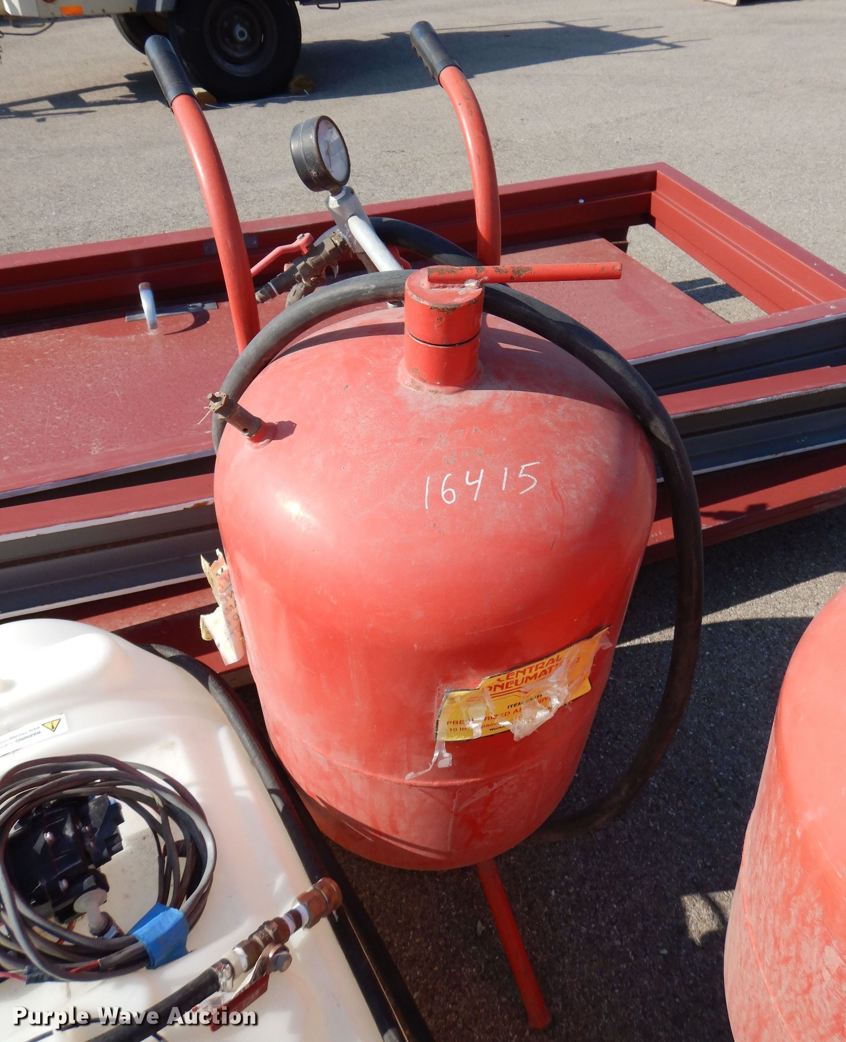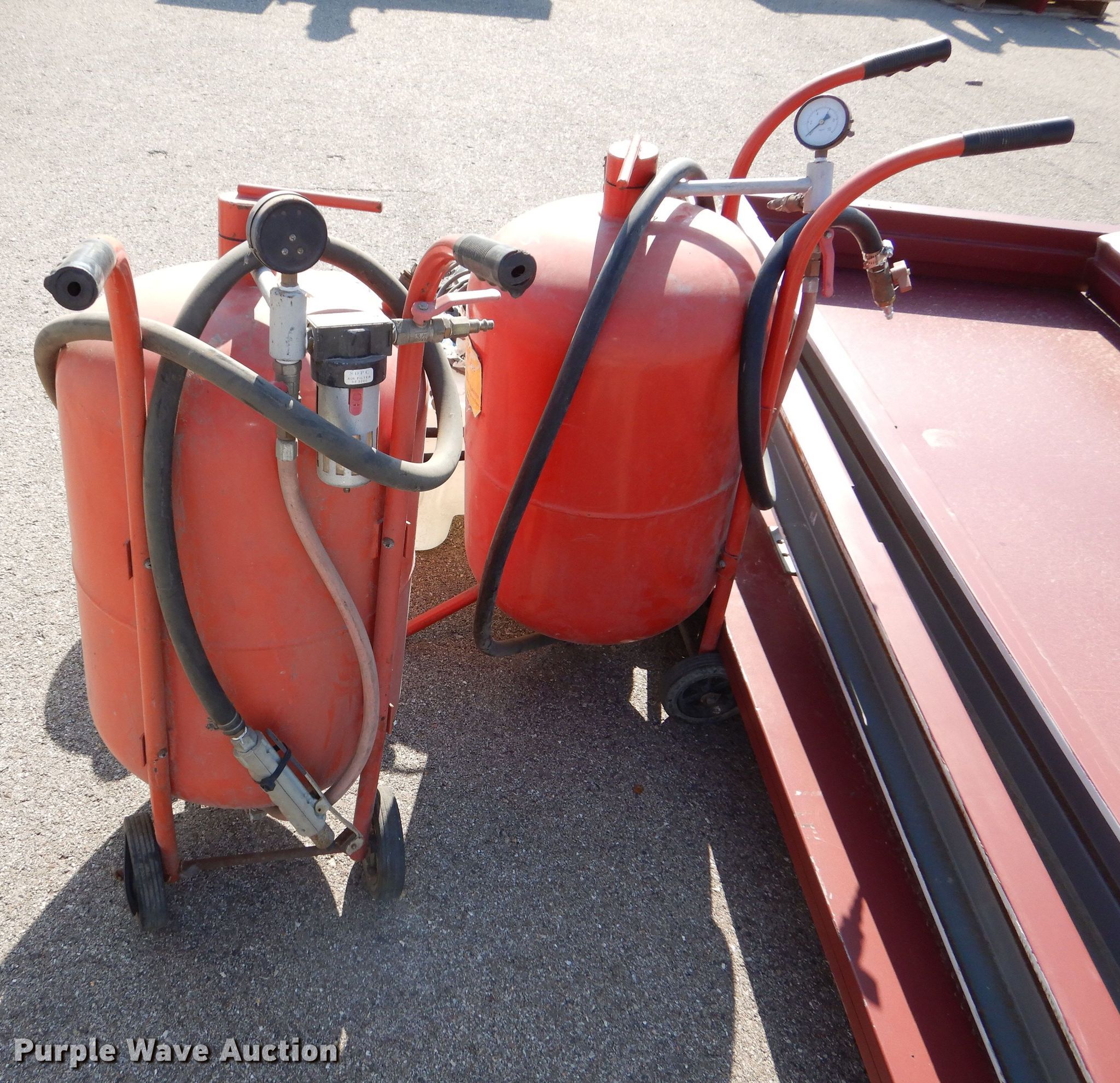 Purple Wave is selling a used Tools in Kansas. This item is a Tools with the following: (2) Central Pneumatic pressurized abrasive blasters, Capacity: 110 lbs, SMV Industries poly tank, Capacity: 25 gallons, Remco 3300 Series pump, GPM: 2.2, PSI: 60, Volts: 12, Hose, (2) steel doors with frames, Frame: 40" x 86" x 6"