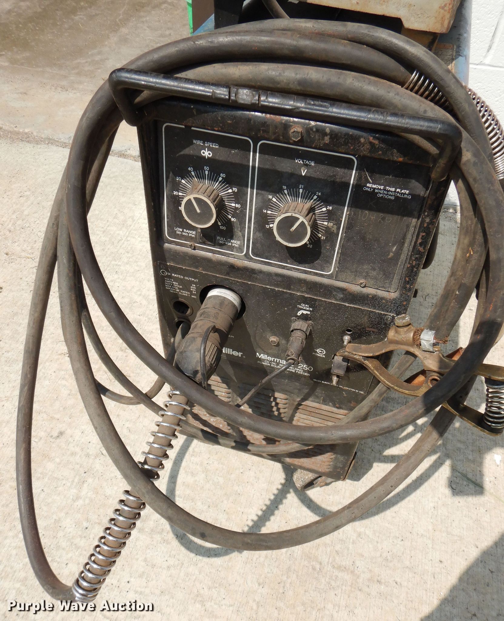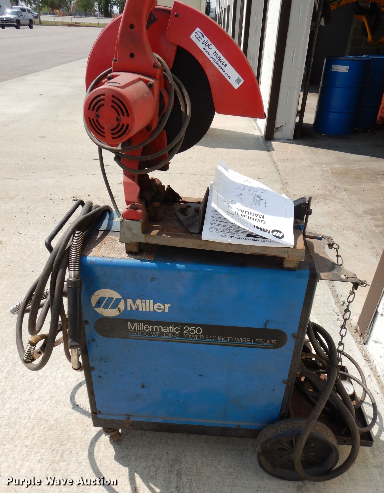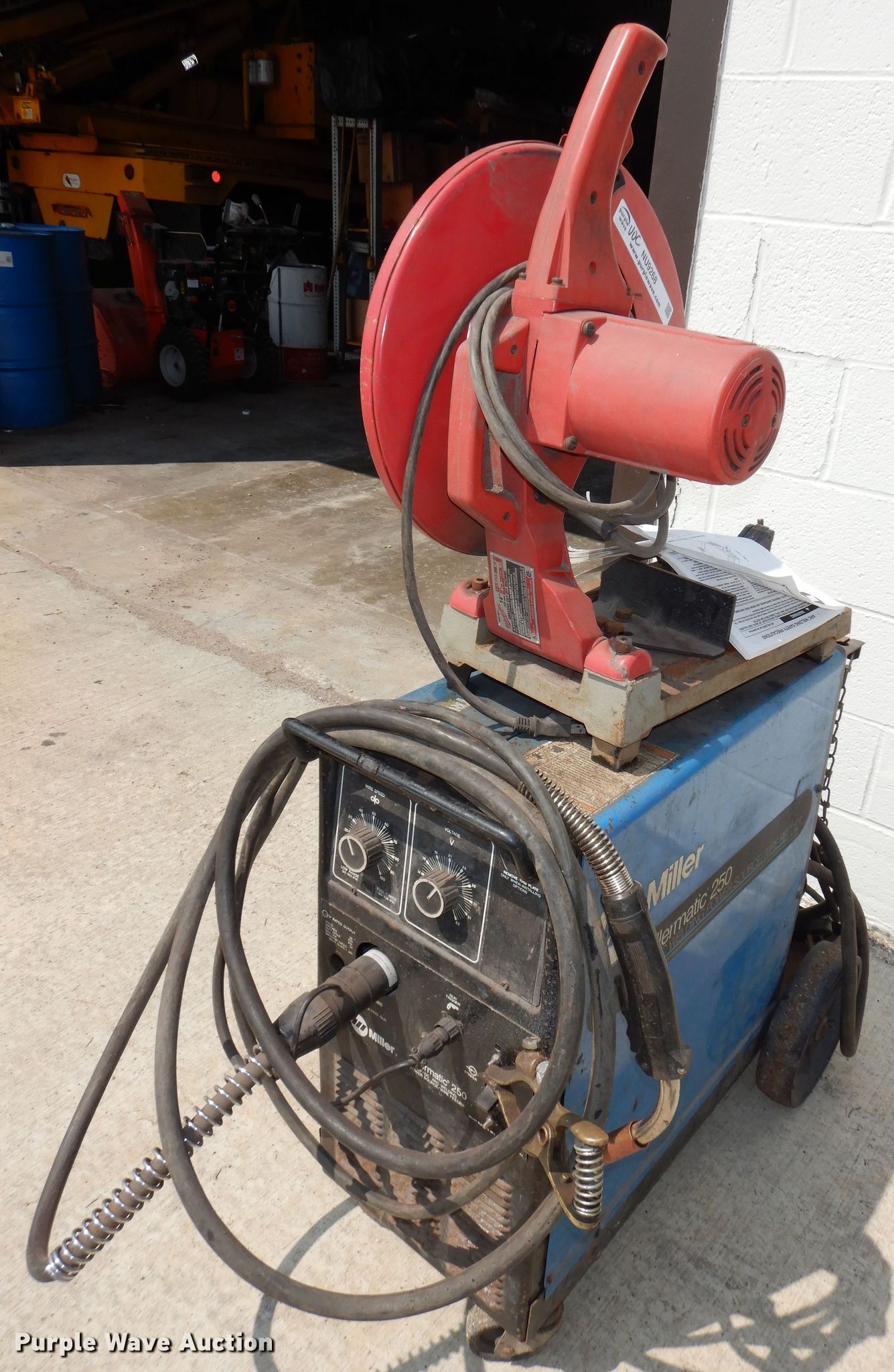 Purple Wave is selling a used Tools in Kansas. This item is a Tools with the following: Unit #: 10426, Milwaukee chop saw, Miller Millermatic 250 welder, Serial: KF927269, Capabilities: CV, DC, Wire, Unknown operating conditions