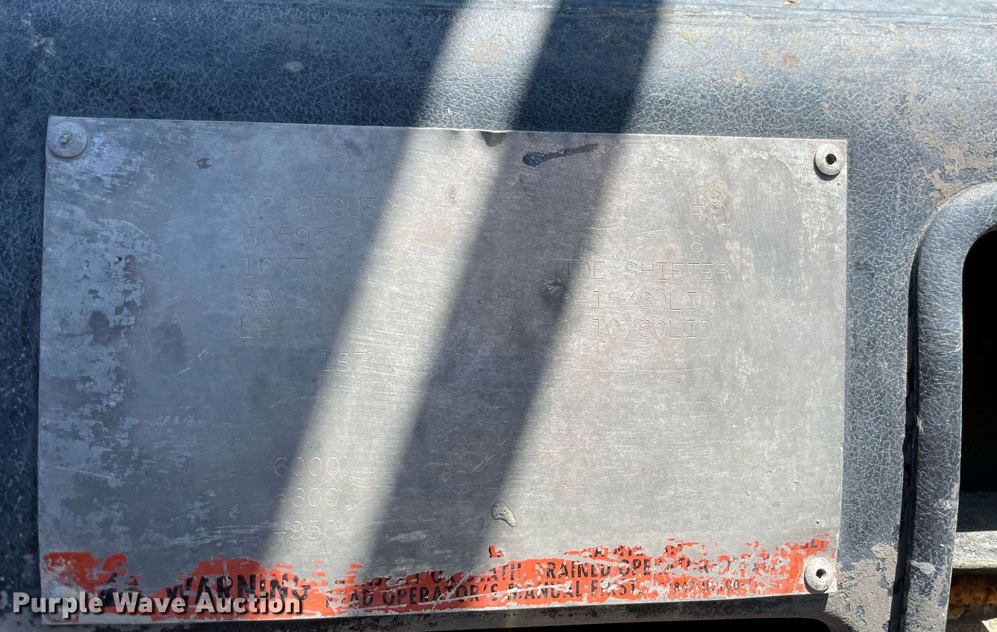 Toyota 02-6FGU30 forklift. Hours: 3,270 on meter, Serial: 60595, Unit #: 8178. Engine Fuel type: LPG LP bottle: Not included. Transmission Powershift. Operators station OROPS. Features Maximum lift capacity: 6,000 lbs, Maximum lift height: 187", Mast stages: 3, Side shift, Mast tilt, Fork length: 48". Tires Front: 28x9-15, Rear: 6.50-10. Notes Engine door will not open, stuck shut, Non-operational unit. Wilbert Funeral Services. 611 Jealouse Way. Cedar Hill, TX 75104