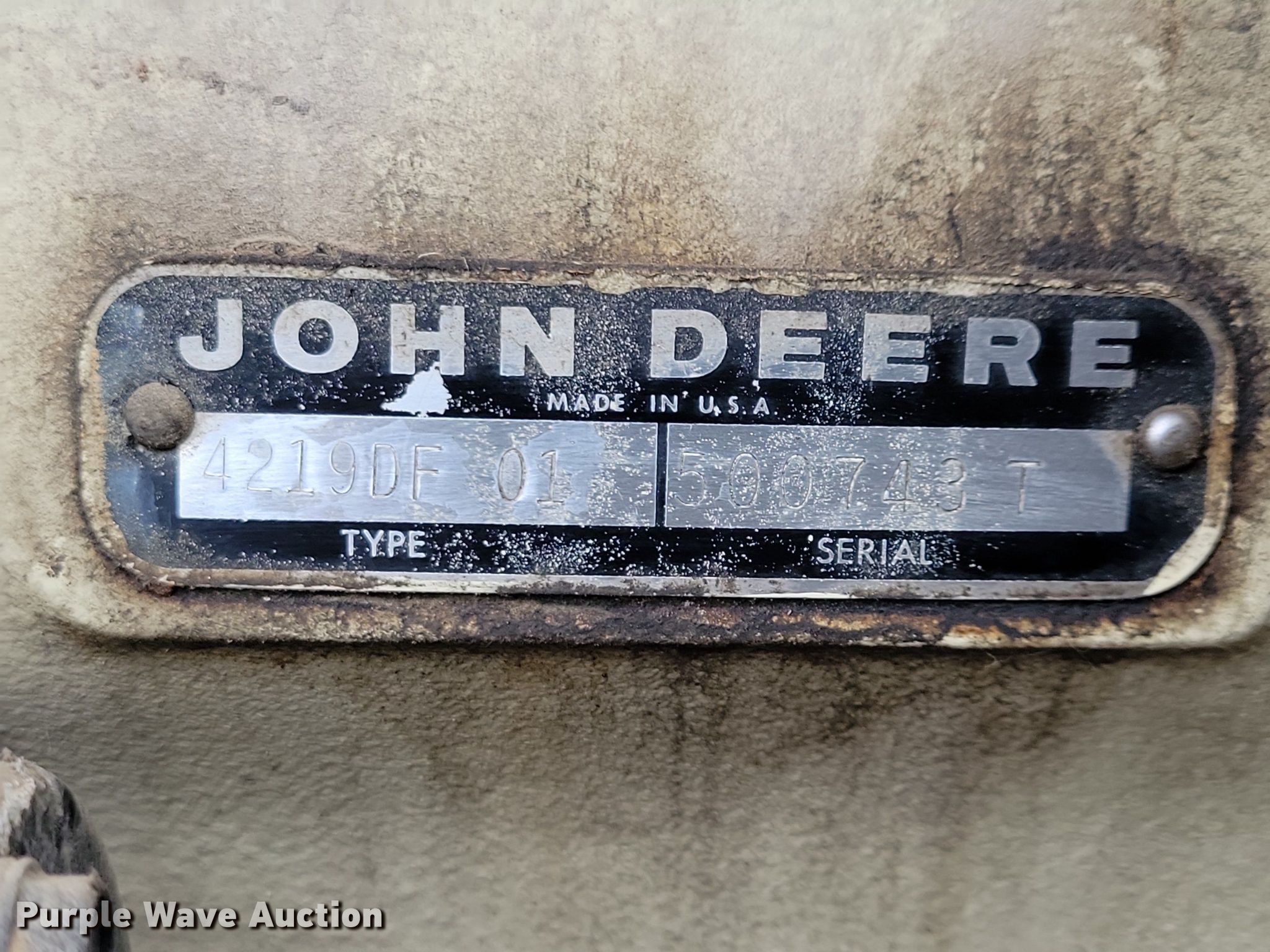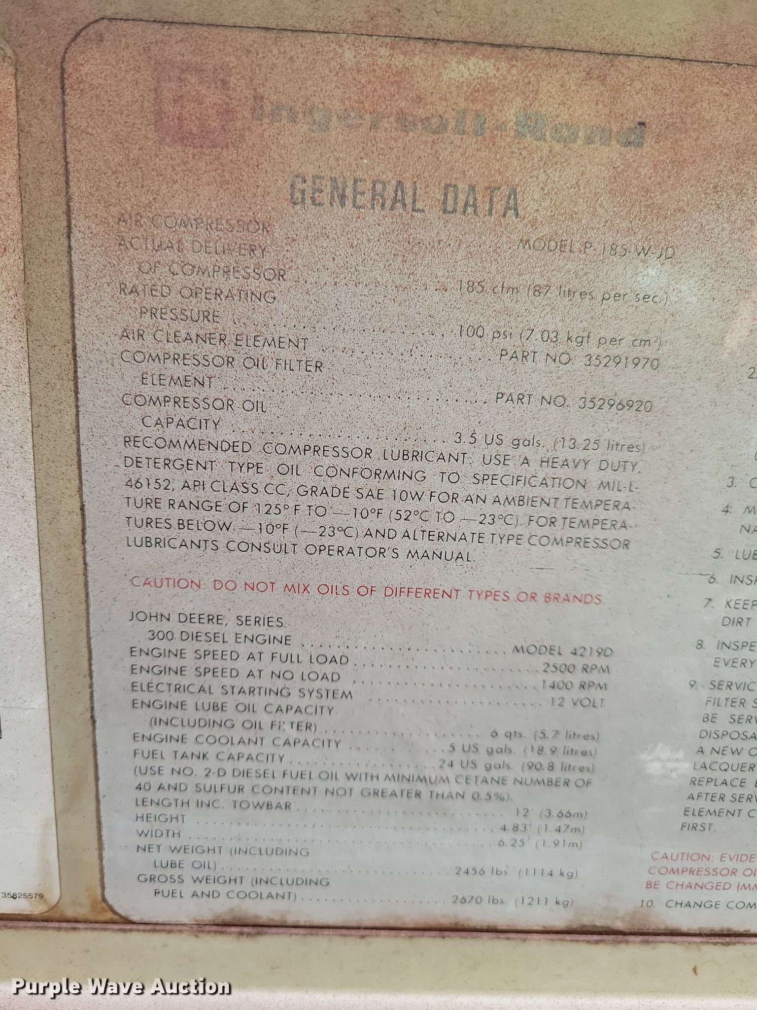 Ingersoll Rand P185WJD air compressor. Hours: 260 on meter, Serial: 109628U79932. Engine John Deere 4219D, Serial: 500743T, Cylinders: 4, Fuel type: Diesel. Features Air compressor Ingersoll Rand, CFM: 185, PSI: 100. Trailer Suspension: Spring, Axles: Single, Tire size: 225/75R15. Transfer of ownership documentation will be a bill of sale. DeCarlo Corporation. 260 Northeast 44th Avenue. Des Moines, IA 50313