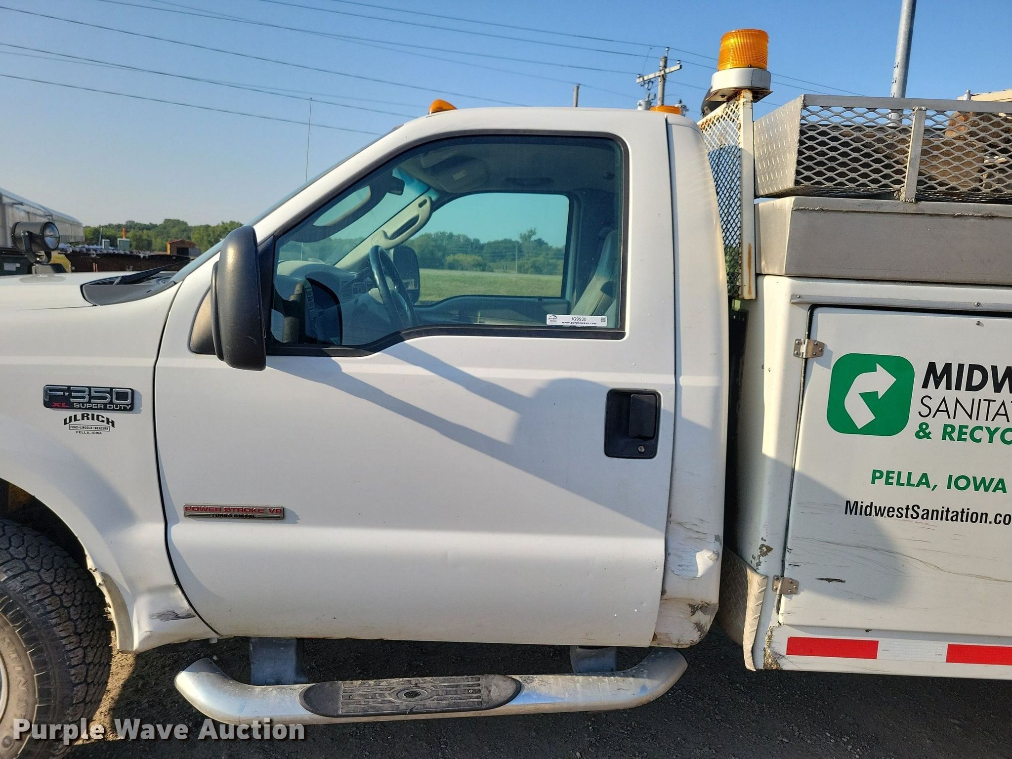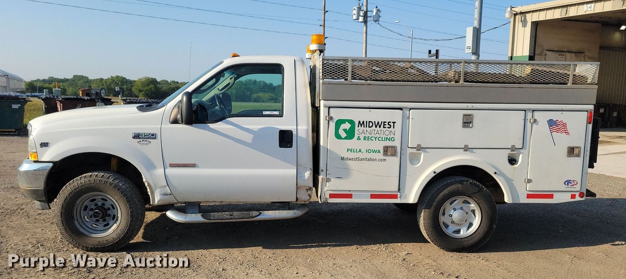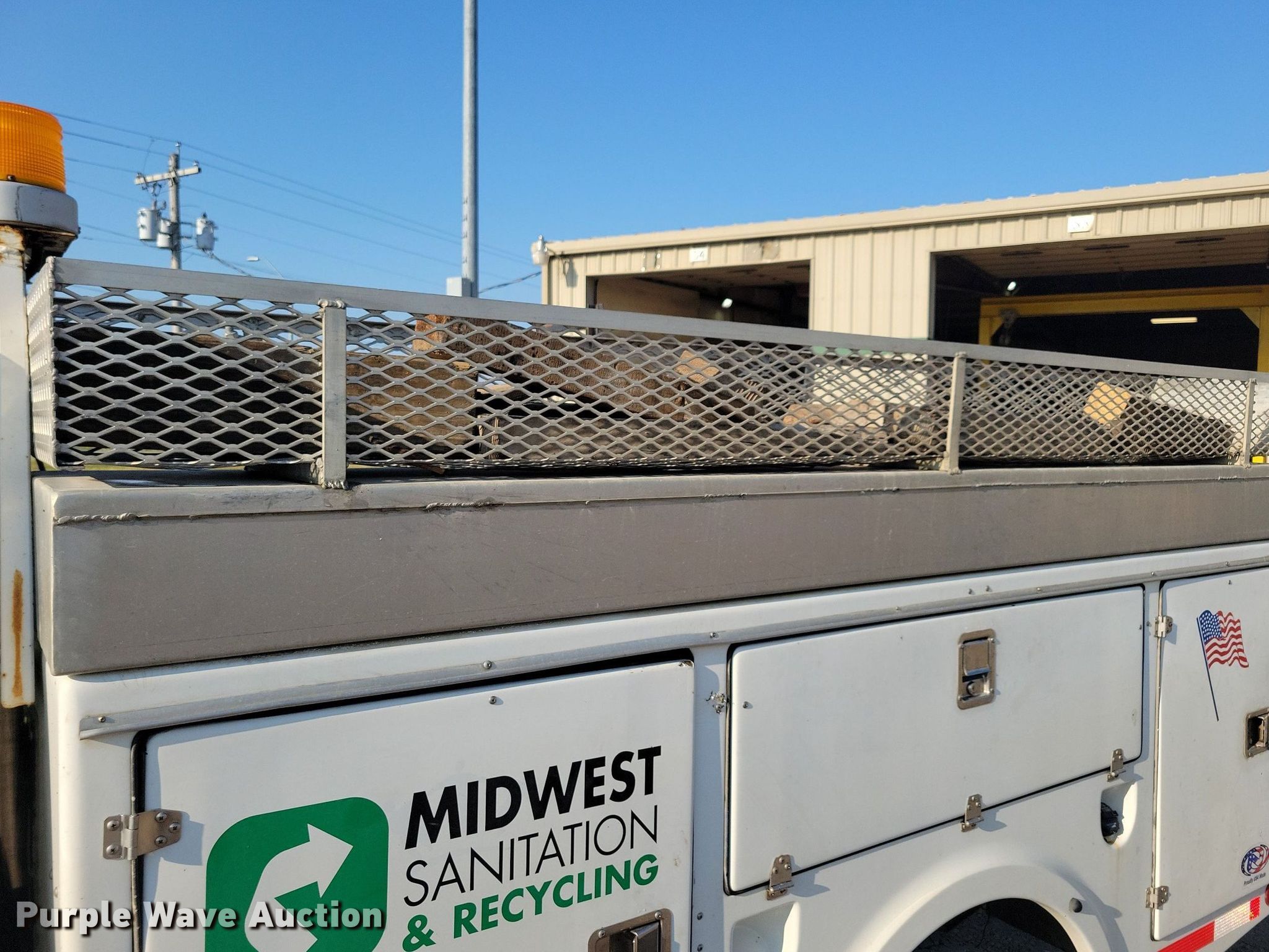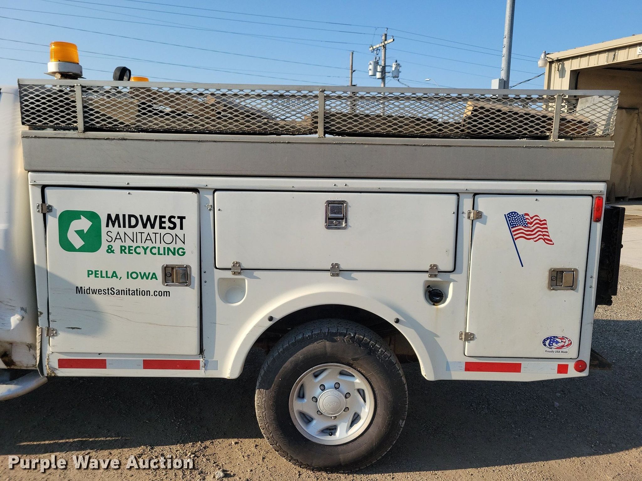 2004 Ford F350 Super Duty XL utility bed pickup truck. Miles: 162,322 on odometer, Miles or hours may vary, unit still in use, VIN: 1FDSF35S94EC20390. Engine Displacement: 6.8L V10 SOHC, Cylinders: 10, Fuel type: Gas. Transmission Automatic, Four wheel drive. Interior AC, Heat, Heated mirrors. Features Utility bed Vander Beek, 9' L x 81" W, End gate lift Tommy Gate, Capacity: 1,000 lbs. Tires Size: LT265/75R16. Notes Contents not included, Air compressor not included. Iowa title. Title distribution may be delayed up to 14 days from verification of funds. Midwest Sanitation & Recycling. 815 W 10th St. Pella, IA 50219
