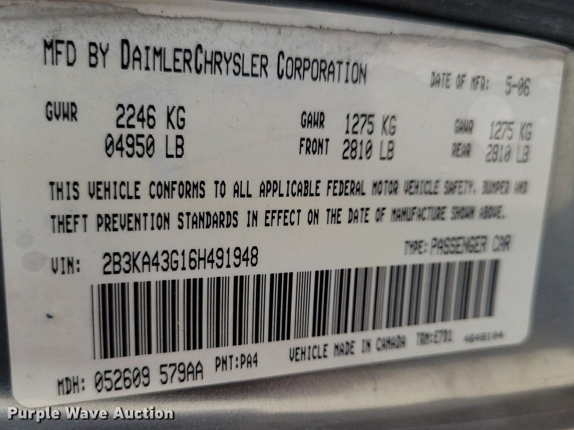 2006 Dodge Charger sedan. Miles: 132,797 on odometer, Miles or hours may vary, unit still in use, VIN: 2B3KA43G16H491948. Engine Displacement: 3.5L V6 SOHC, Cylinders: 6, Fuel type: Gas. Transmission Automatic. Interior AC, Heat, Power windows, Power locks, Cruise control. Tires Size: P225/60R18. Notes Back seat cleaned prior to auction, Spare tire replaced prior to auction, Dash warning indicator: Check engine. Iowa title. Title distribution may be delayed up to 14 days from verification of funds. 2009 Northwest Hickory Lane. Ankeny, IA 50023