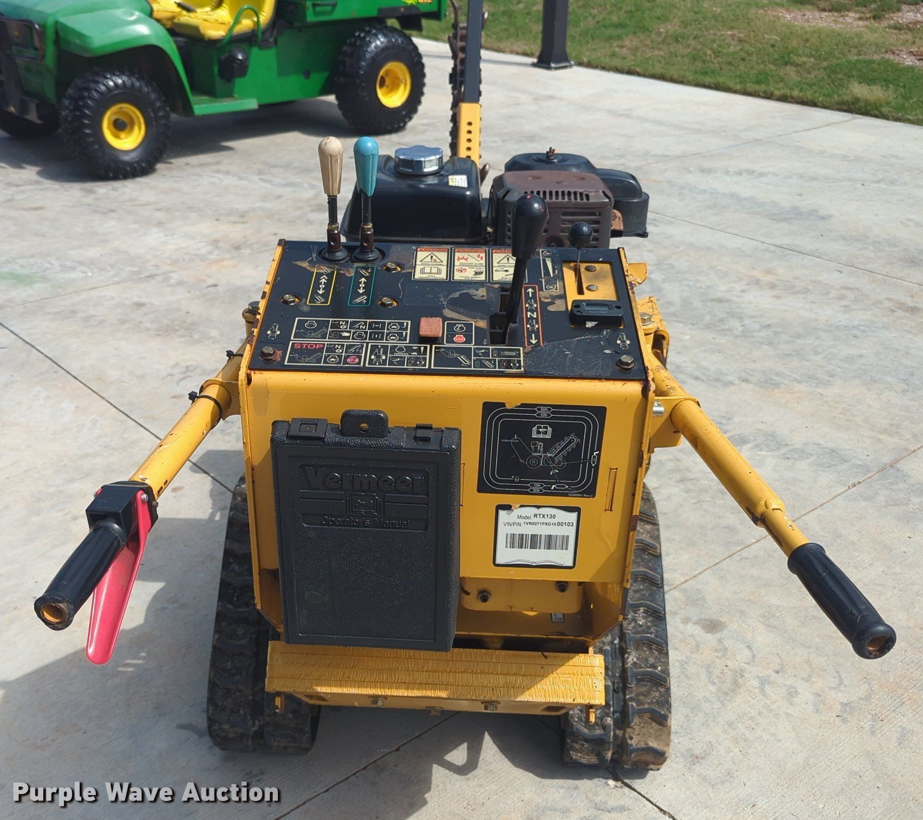 2016 Vermeer RTX130 trencher. Hours: 439 on meter, Serial: 1VR5071PXG1000103. Engine Honda, Cylinders: 1, Fuel type: Gas, HP: 13. Transmission Hydrostatic. Features Trencher Estimated dig depth: 48", Cutting width: 5", Teeth: Dirt. Tracks Width: 7", Rubber. 17100 S Air Depot Blvd. Norman, OK 73026
