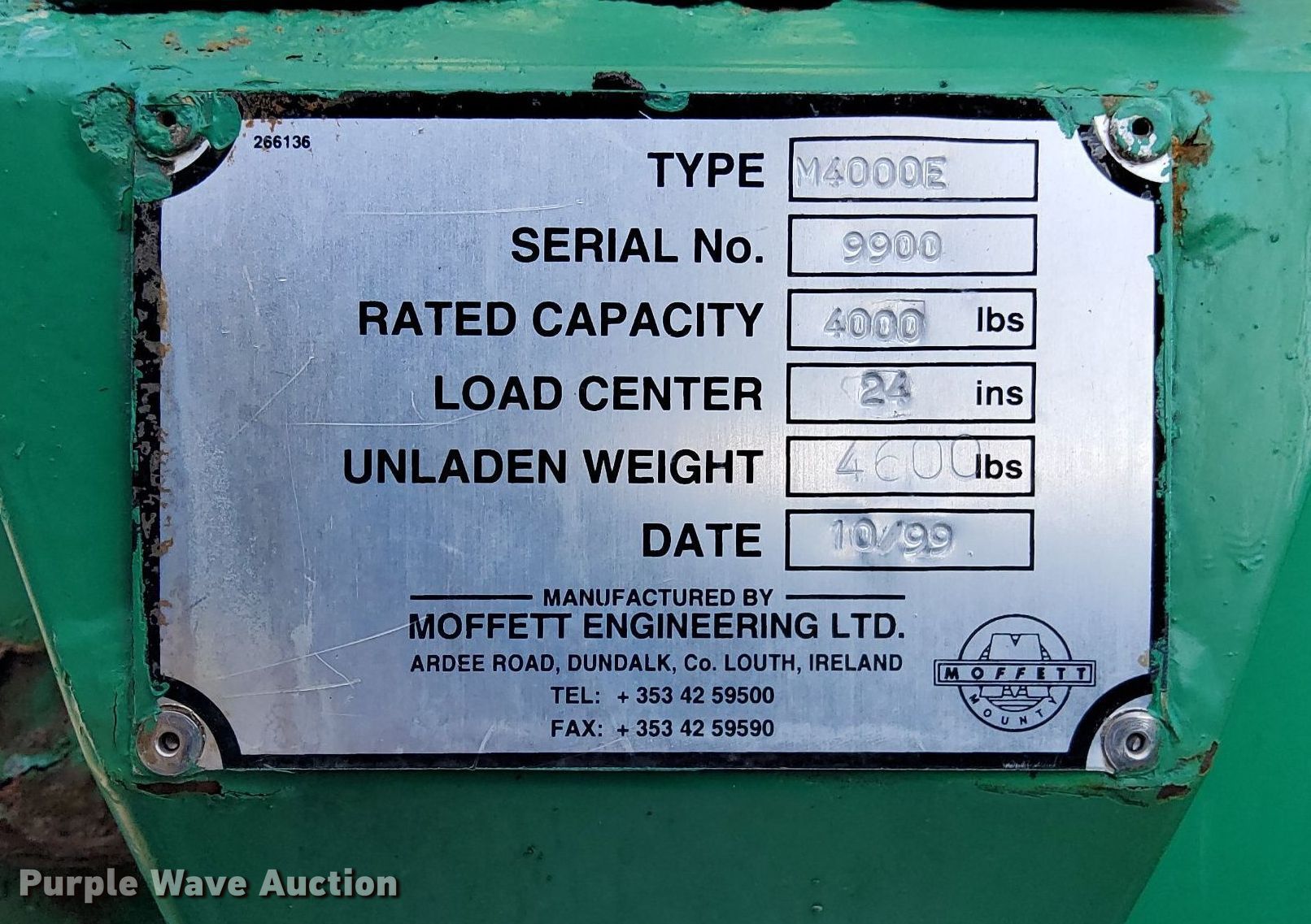 1999 Moffett M4000E forklift. Hours: 1,417 on meter, Serial: 9900. Engine Kubota V105, Serial: XN3429, Cylinders: 4, Fuel type: Diesel. Transmission Hydrostatic. Operators station Canopy. Features Maximum lift capacity: 4,000 lbs, Mast stages: 2. Tires Size: 29x12.5-15. 15107 North 137th East Avenue. Collinsville, OK 74021