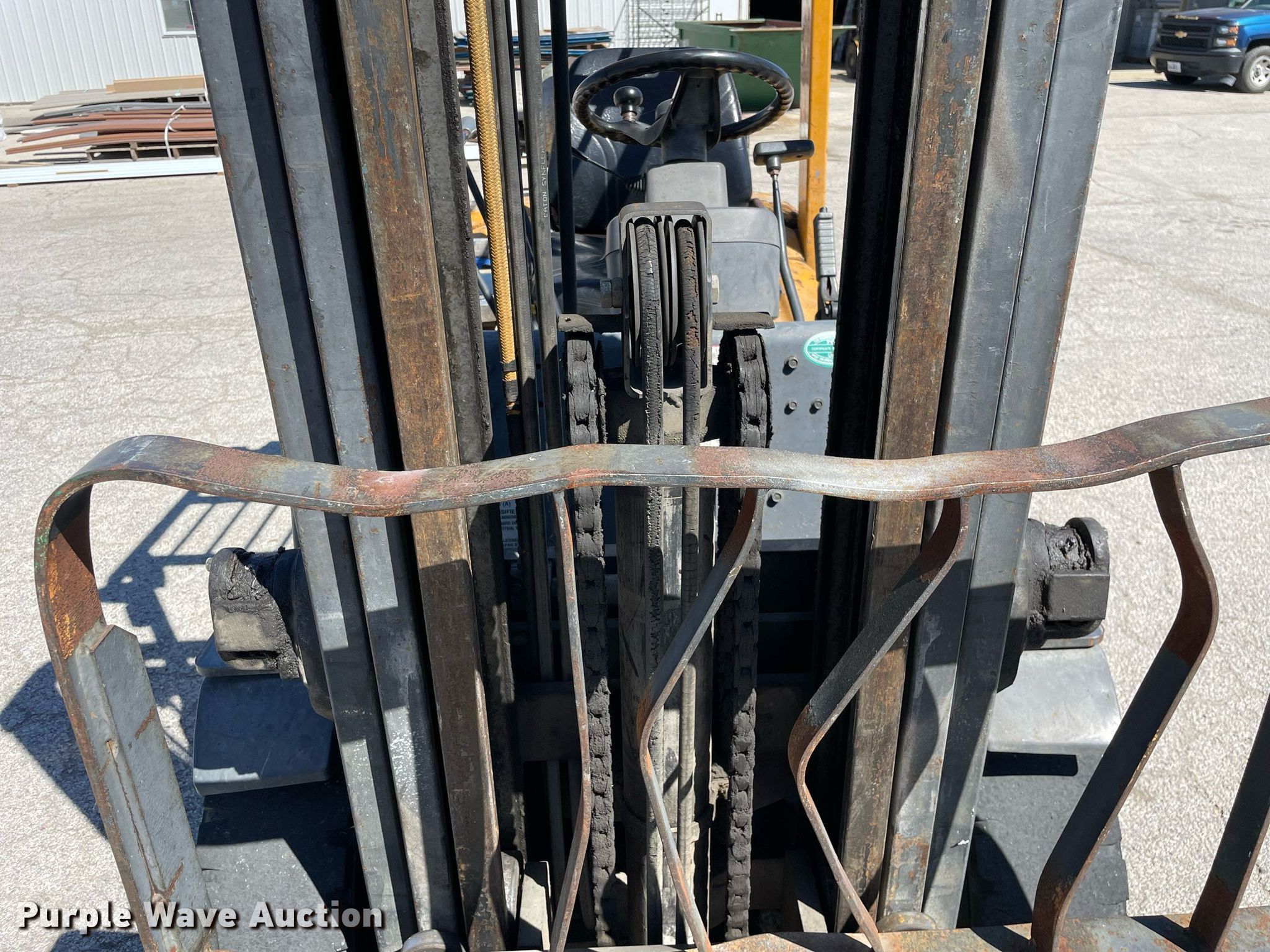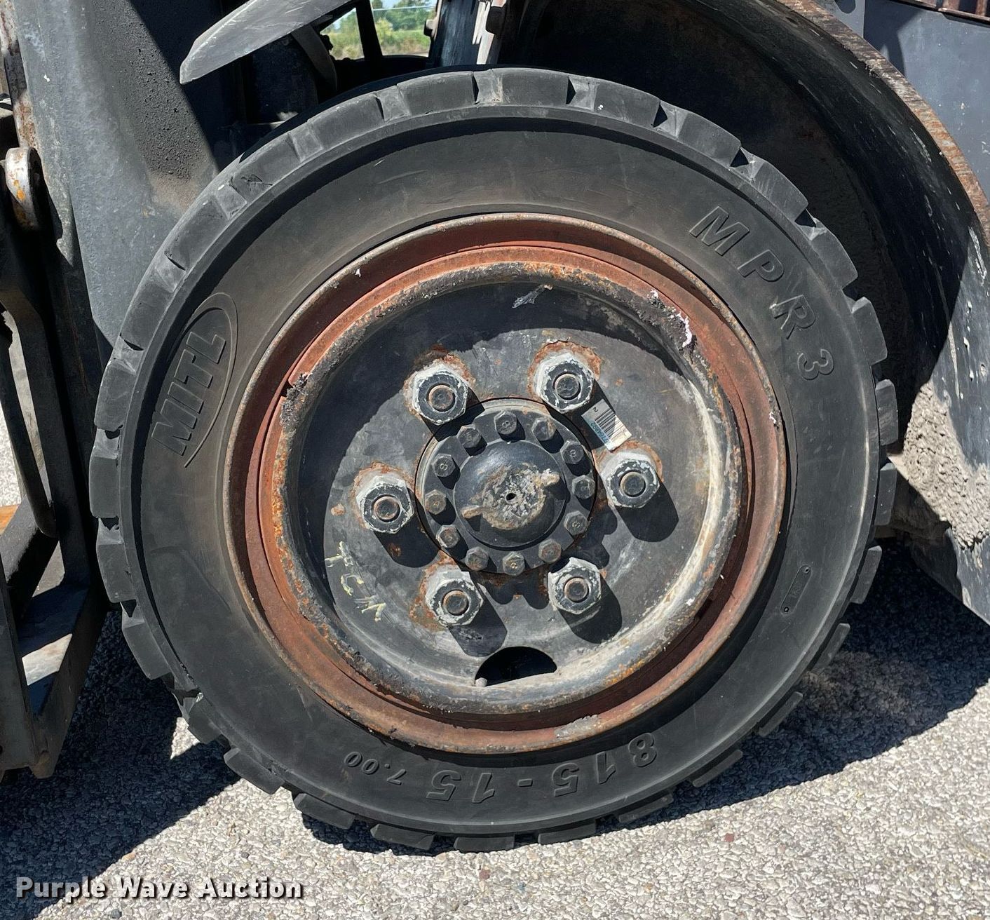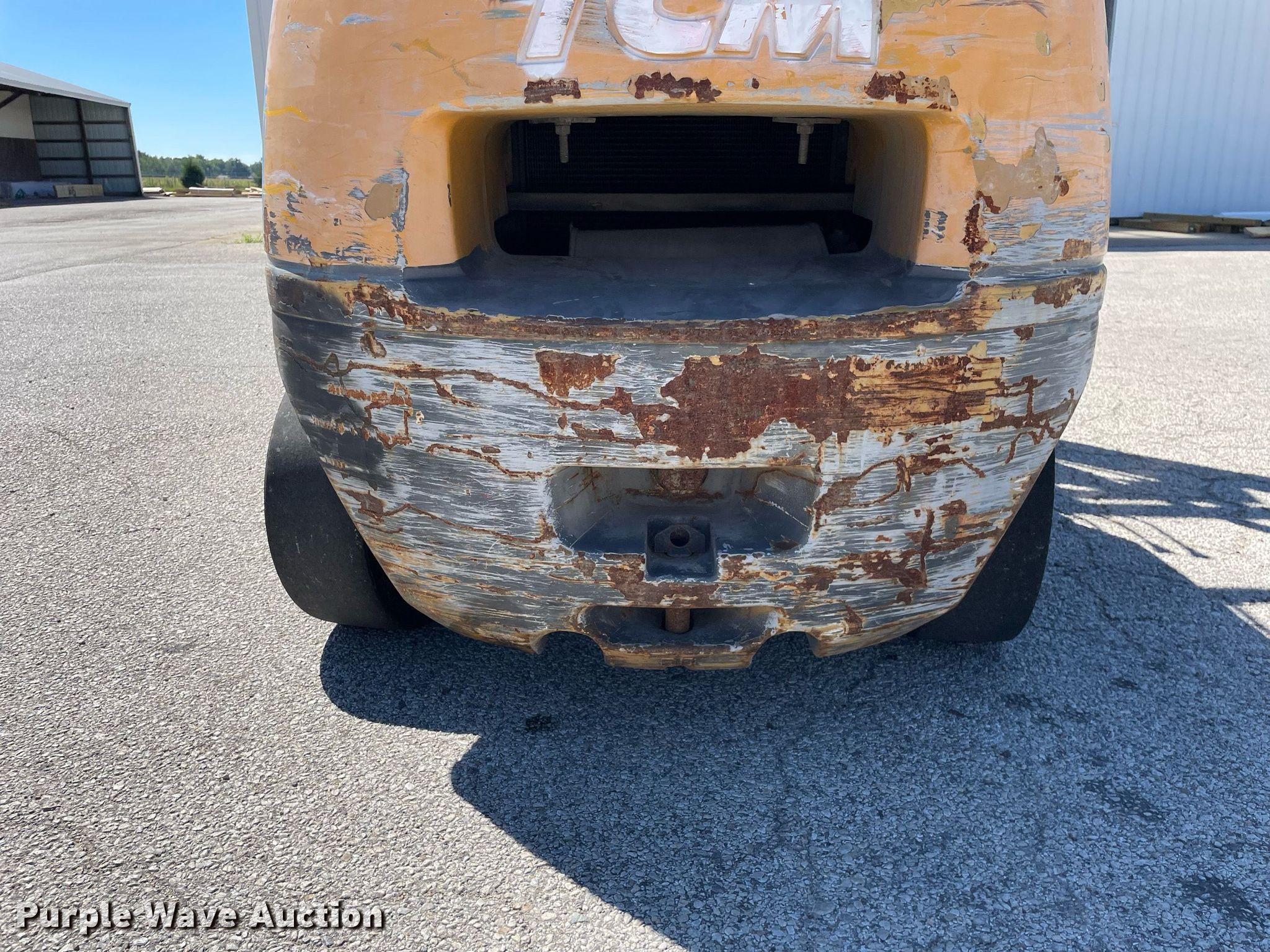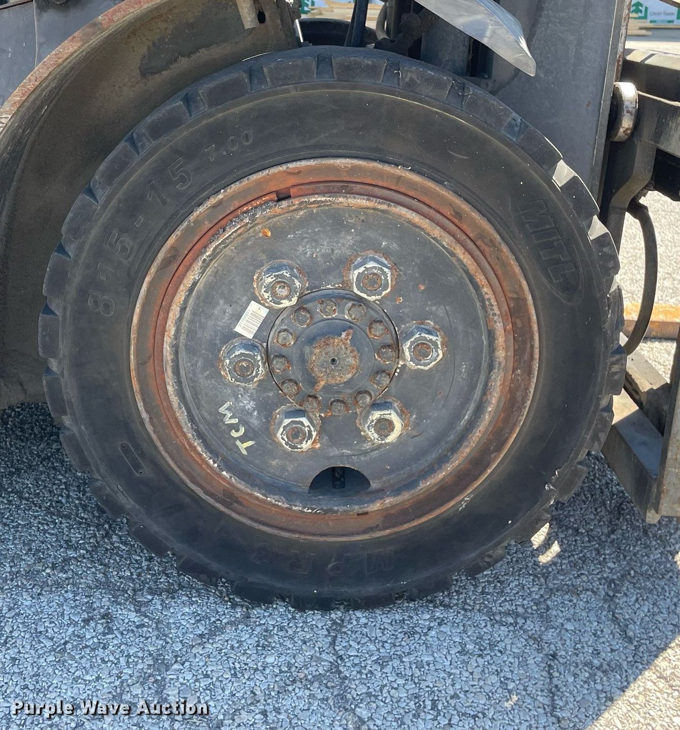 TCM FG30N5T forklift. Hours: 7,866 on meter, Serial: A31M72409. Engine Nissan, Cylinders: 4, Fuel type: LPG LP bottle: Not included. Transmission Powershift. Operators station OROPS. Features Maximum lift capacity: 4,700 lbs, Maximum lift height: 189", Mast stages: 3, Side shift, Mast tilt, Fork length: 47". Tires Front: 815-15, Rear: 650-10, Solid. R.P. Lumber Co., Inc.. Taylorville, IL 62568