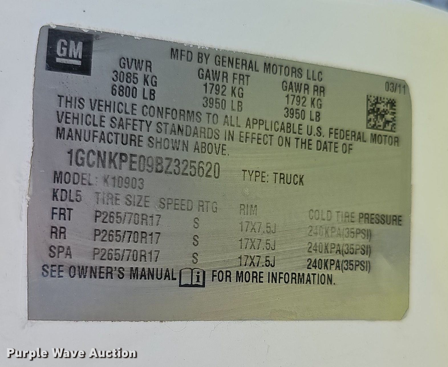 2011 Chevrolet Silverado 1500 pickup truck. Miles: 245,844 on odometer, VIN: 1GCNKPE09BZ325620. Engine Displacement: 5.3L V8 OHV, Cylinders: 8, Fuel type: Gas. Transmission Automatic, Four wheel drive. Interior AC, Heat, Cruise control. Tires Size: LT265/70R17. Notes Dash warning indicator: TPMS. Iowa title. Title distribution may be delayed up to 14 days from verification of funds. AVE-PLP, LLC. 601 South 8th Street. Clarinda, IA 51632