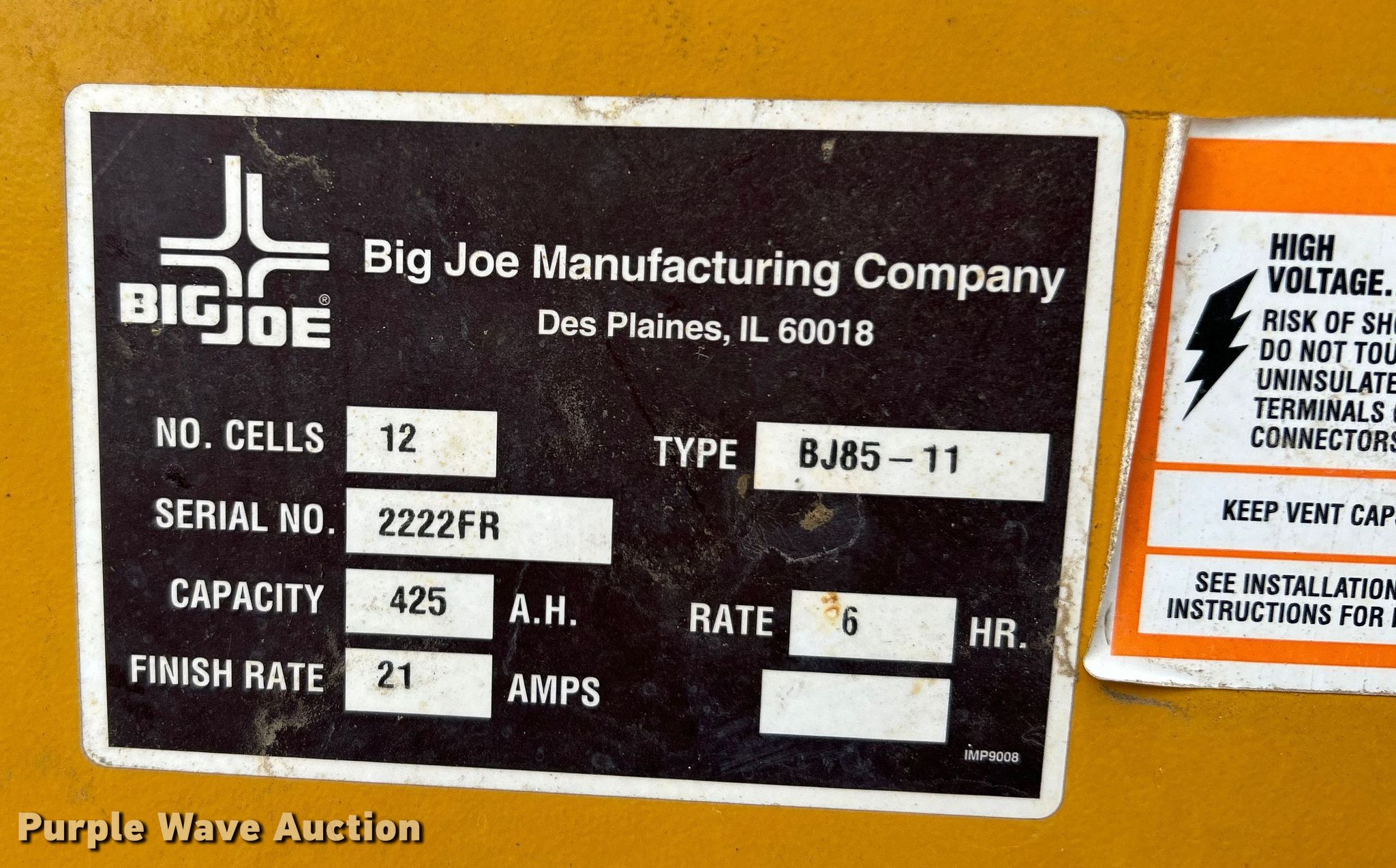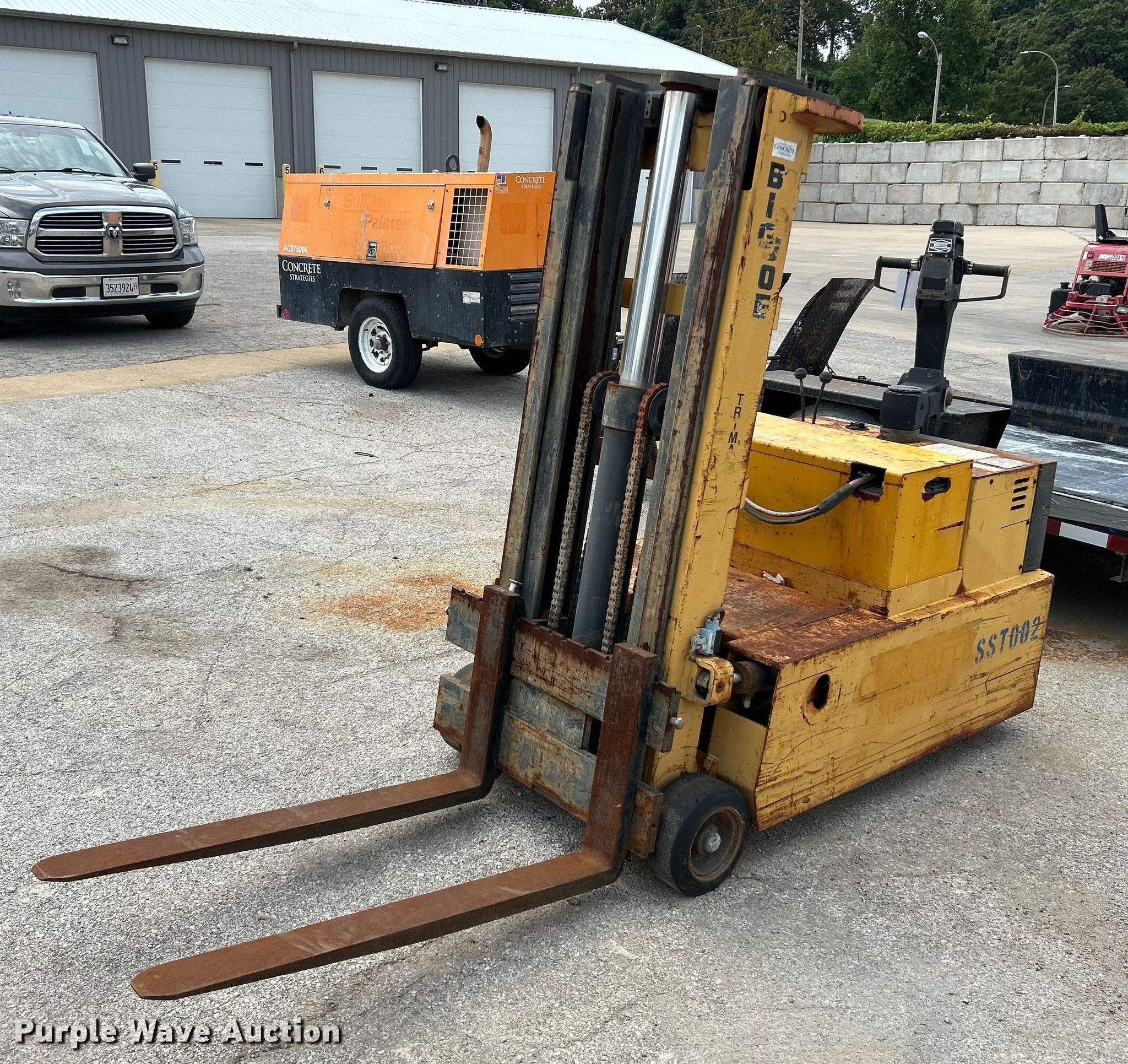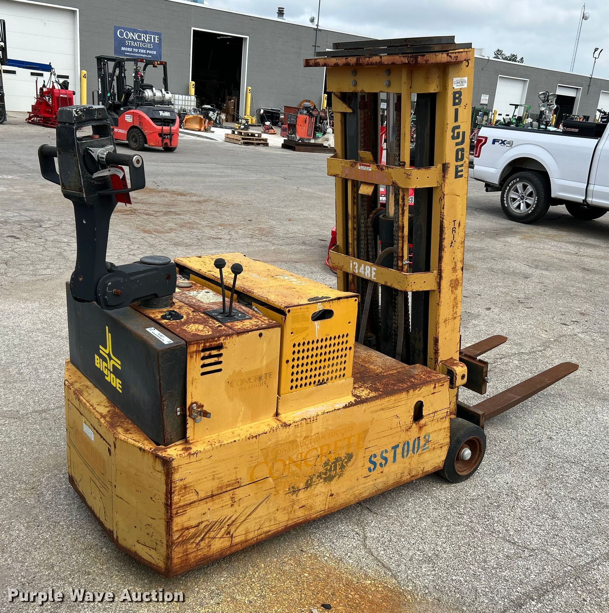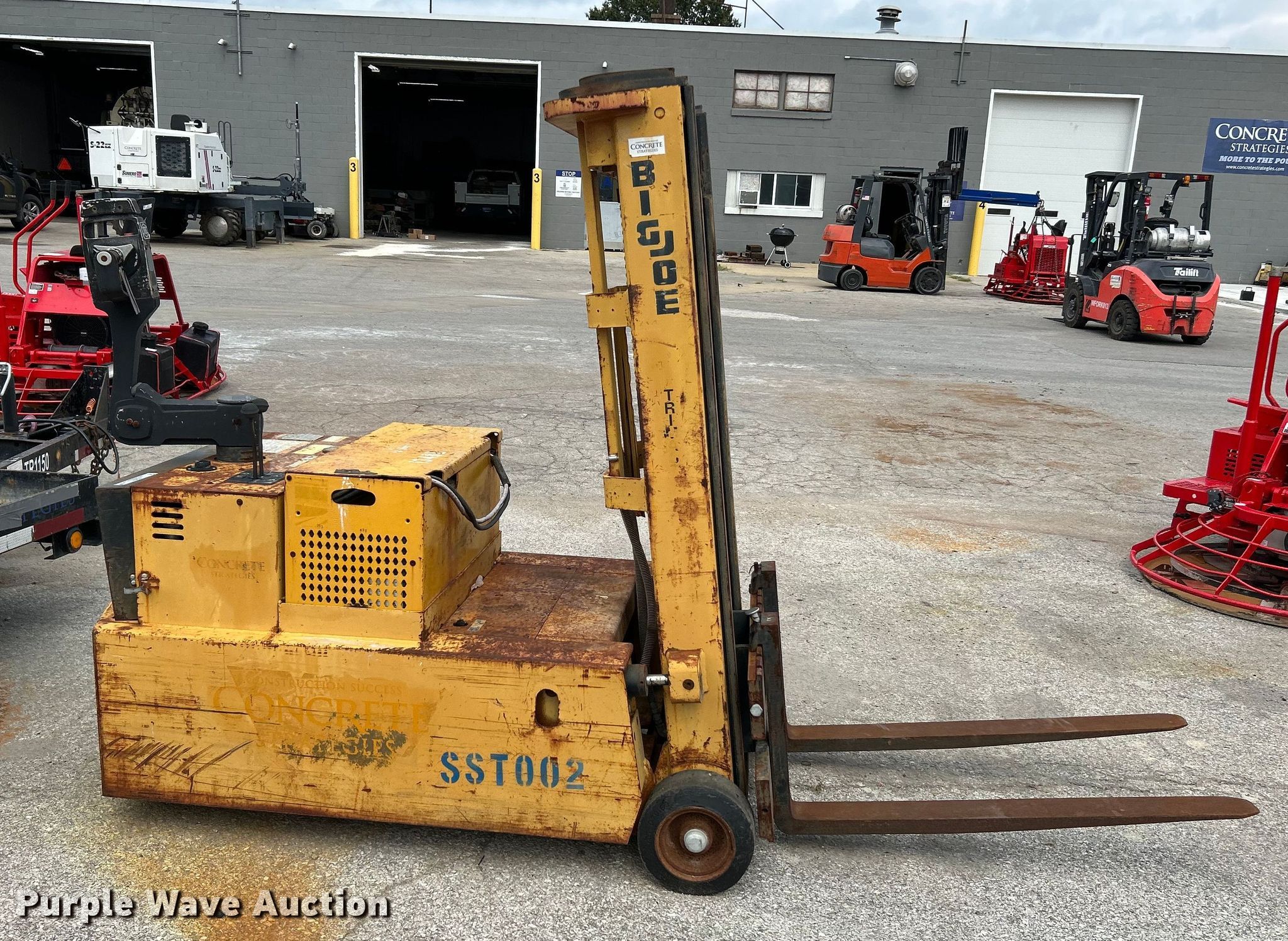 Big Joe PDC 30-158 forklift. Hours: Unknown, Serial: 382959. Electric Motor Volts: 24. Features Maximum lift capacity: 3,000 lbs, Maximum lift height: 158", Mast stages: 2, Mast tilt, Fork length: 42". Tires Solid. Notes Dead batteries, Non-operational hour meter, Unknown operating condition. Concrete Strategies, LLC. St. Louis, MO 63040