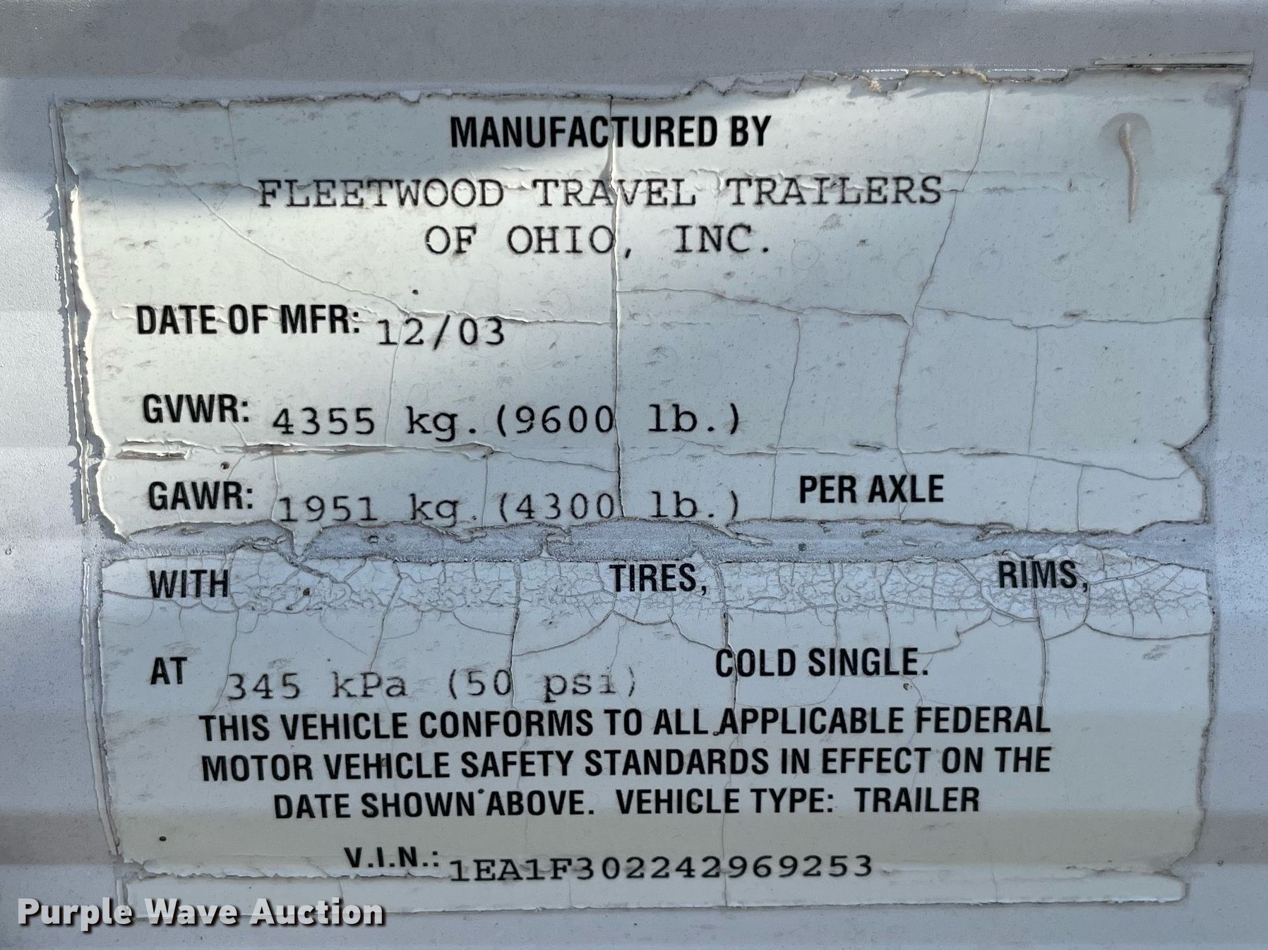 2004 Fleetwood Terry camper. Camper length: 29', VIN: 1EA1F302242969253. Chassis Axles: Tandem, Suspension: Spring, Brakes: Electric, GVWR: 9,600 lbs, GAWR: 4,300 lbs. Interior Kitchen: Sink, Refrigerator, Freezer, Microwave, Oven, Stove: Propane, Living room: Table, Pull out couch, Bathroom, Beds: 3 Bed type: Queen, Sound system, Heater, AC units: 1. Features Slide outs: 1, Ball hitch: 2 5/16". Tires Size: ST225/75R15. Oklahoma title. Title distribution may be delayed up to 14 days from verification of funds. BNB Industries. Wynnewood, OK 73098