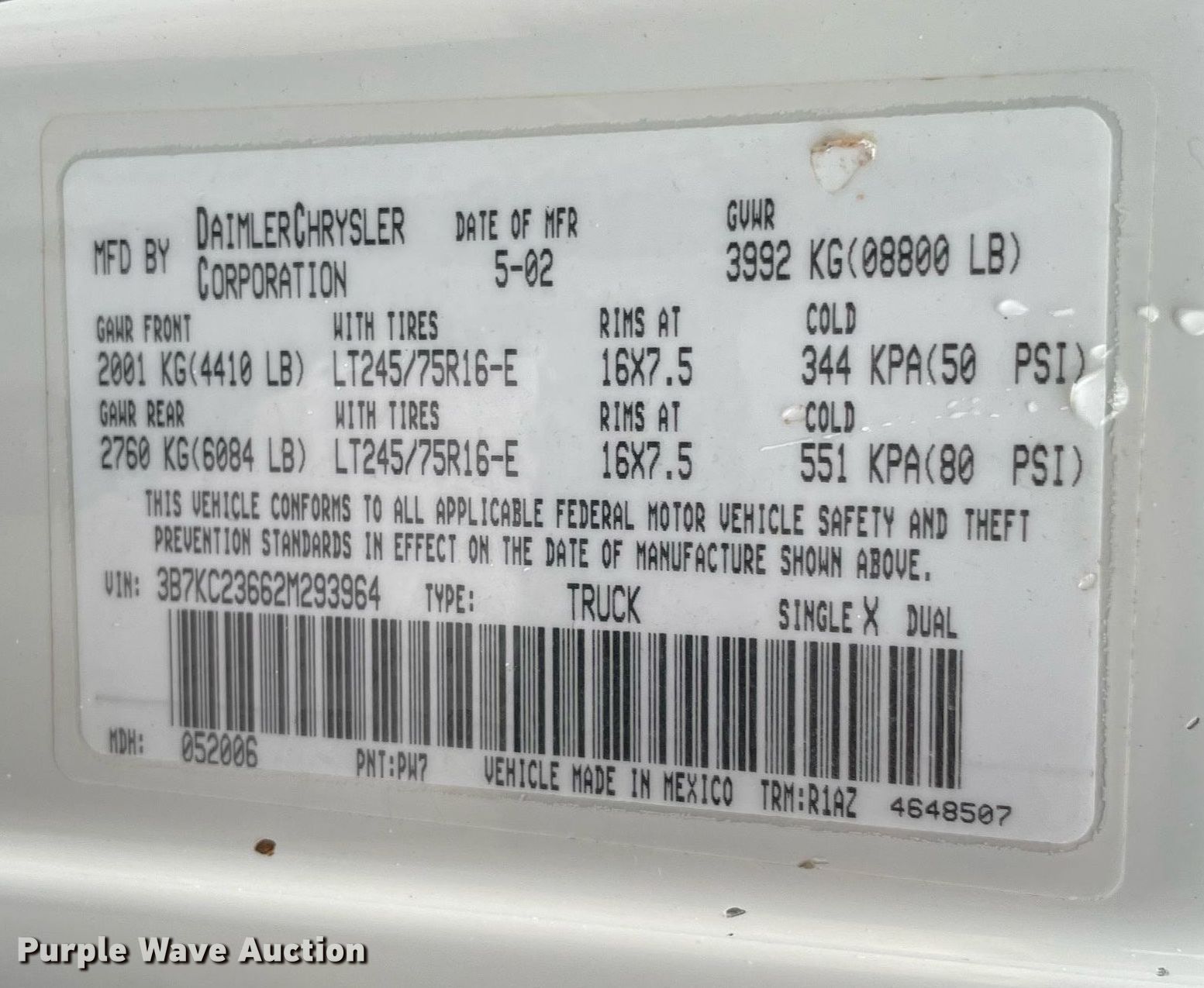 Purple Wave is selling a used 3/4 or 1 Ton Pickup or Van in Texas. This item is a 2002 Dodge Ram 2500 Quad Cab pickup truck with the following: Miles: 196,012 on odometer, VIN: 3B7KC23662M293964